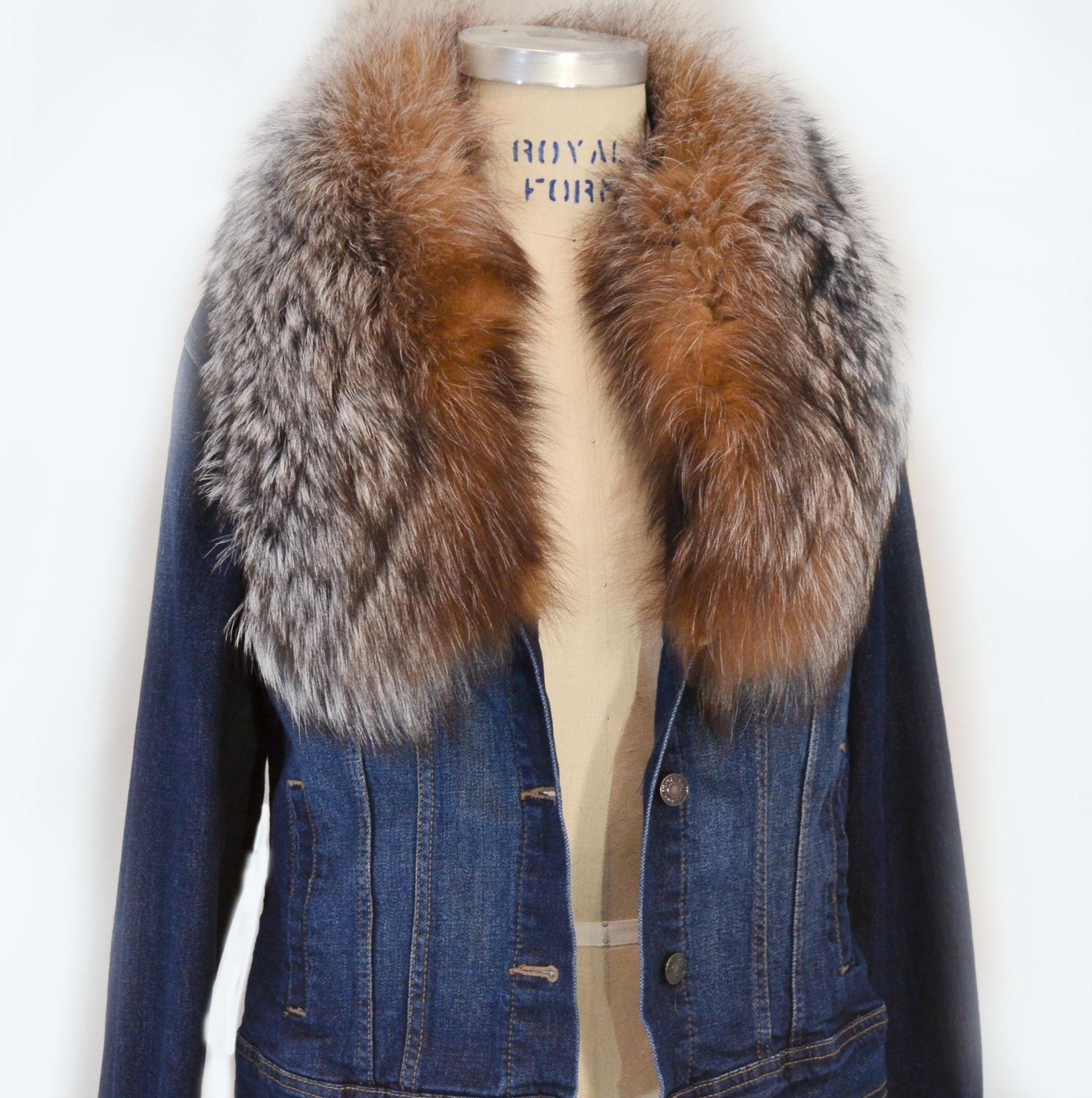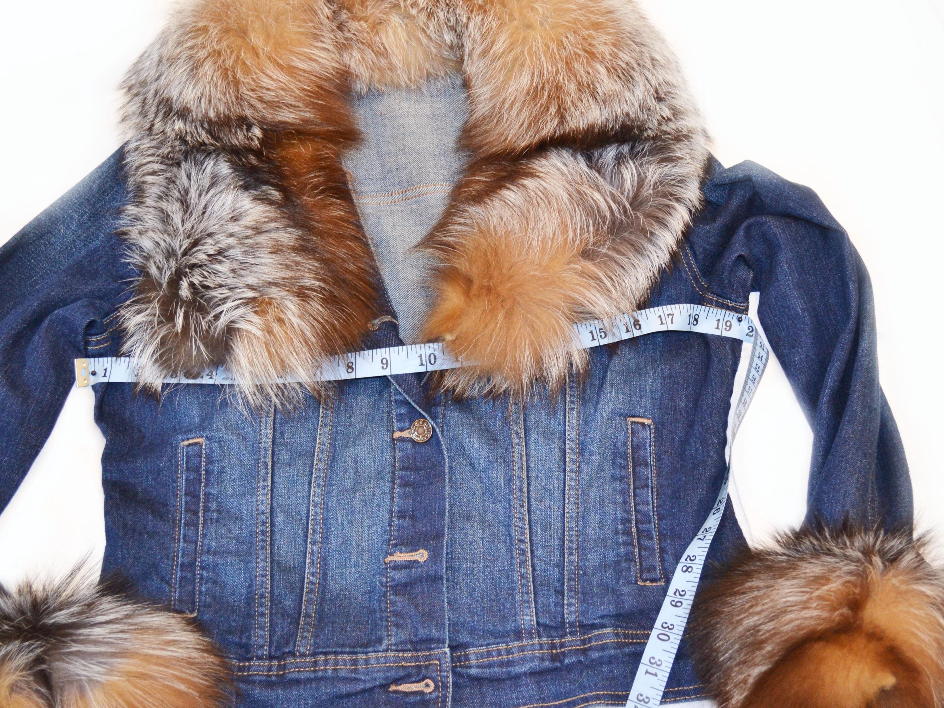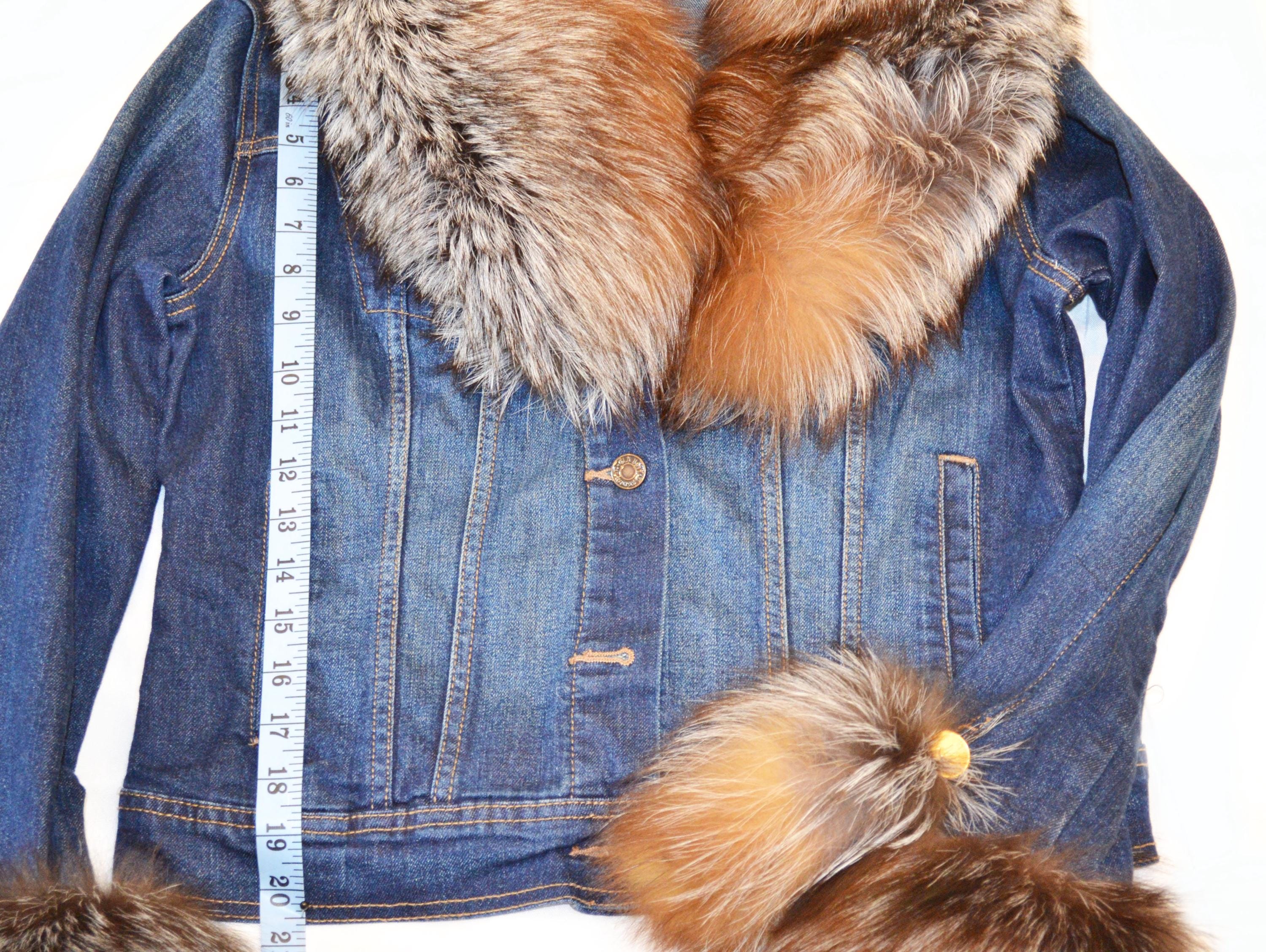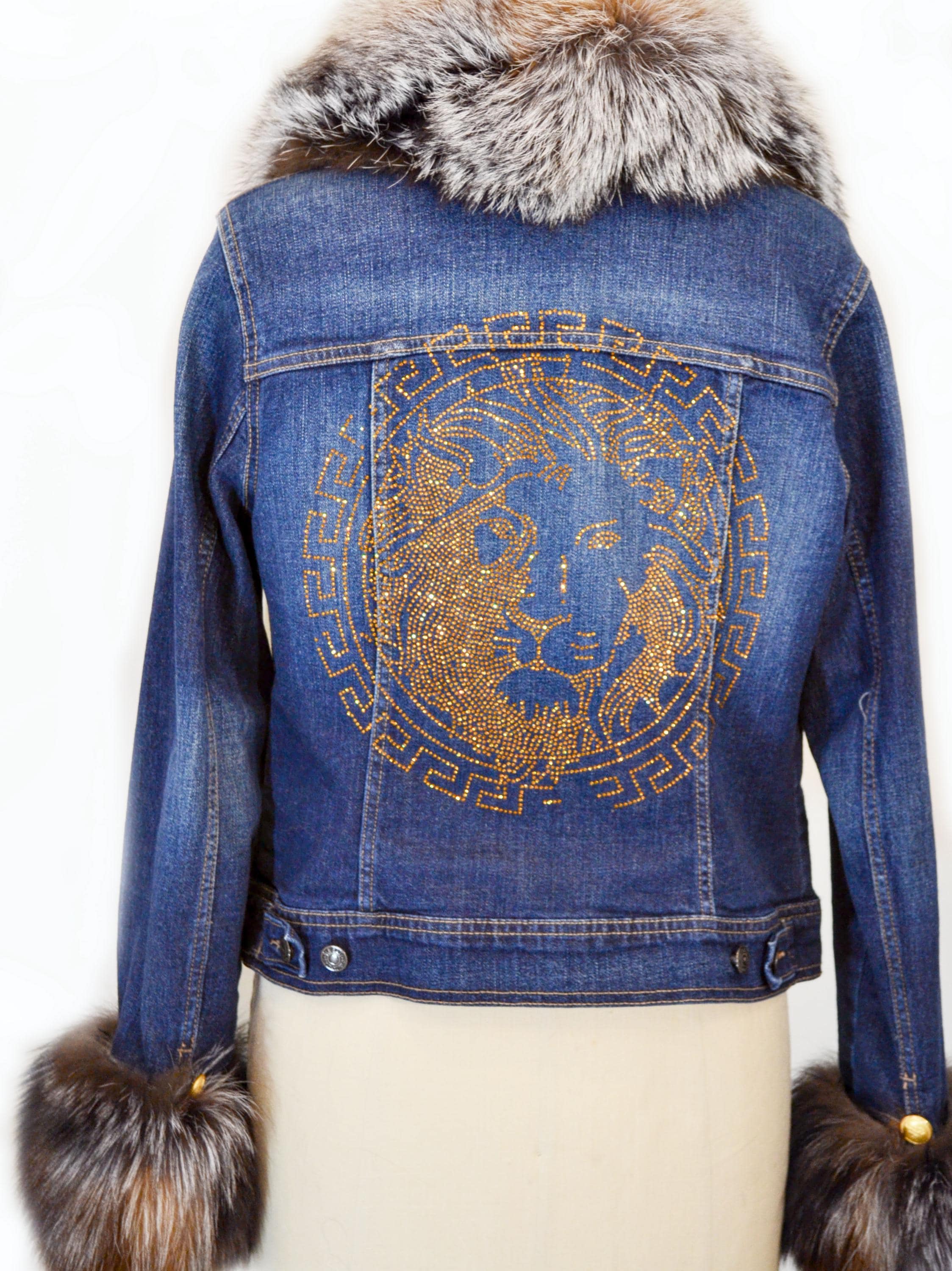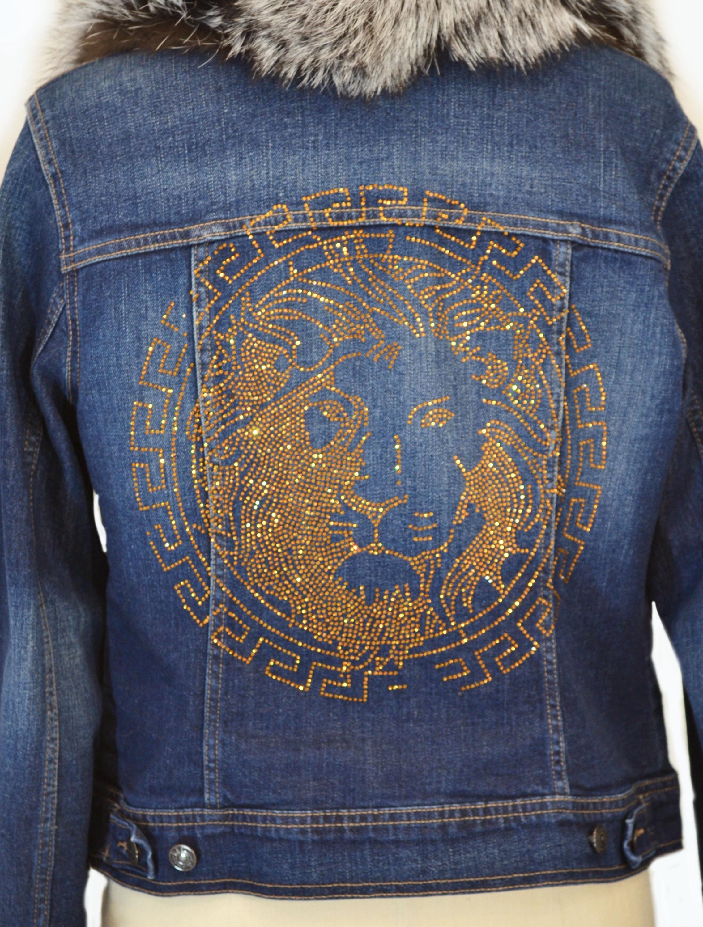 This stunning dark blue up cycled denim jacket, a perfect fusion of vintage charm and contemporary chic. The jacket features a luxurious fox fur collar and cuffs, adding a touch of opulence and warmth to your ensemble. Embellished with a dazzling rhinestone lion motif, it exudes a sense of individuality and glamour, making it a standout piece for any occasion.
