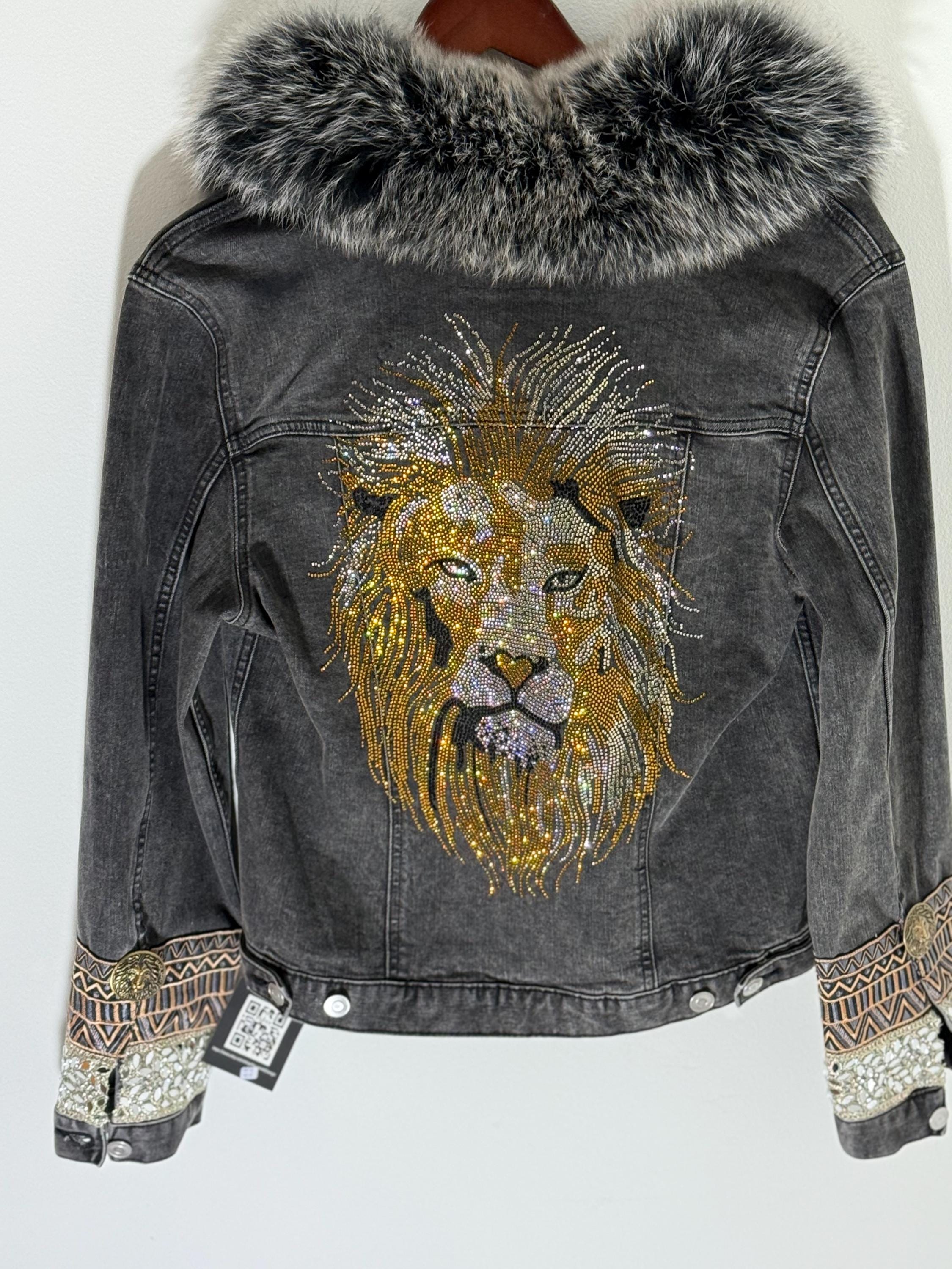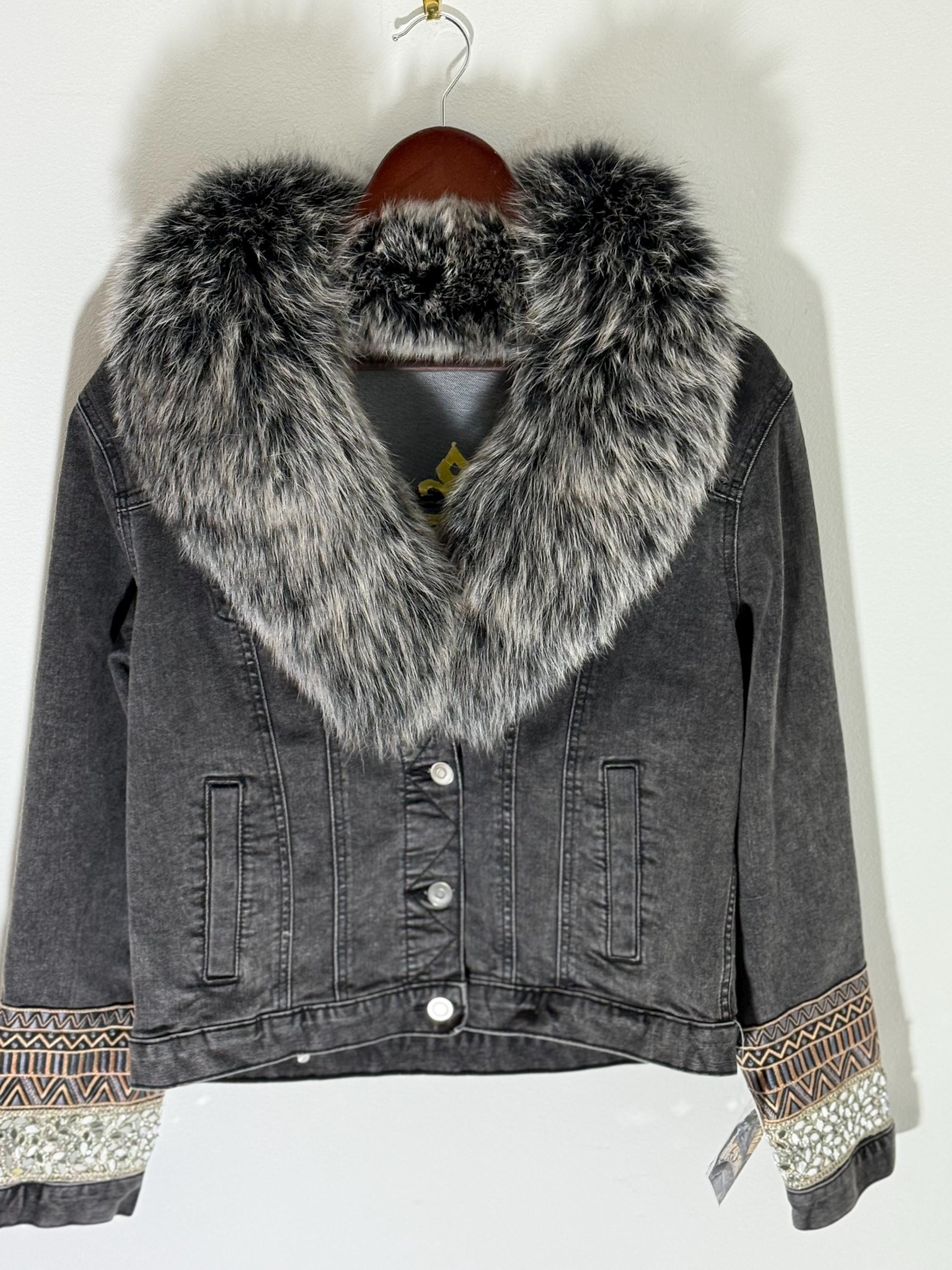 Make a statement without saying a word. This stunning Black Stone Washed Up cycled Denim Jacket, a unique blend of style and sustainability. This one-of-a-kind piece features a luxurious silver fox fur collar and embellished cuffs, adding a touch of elegance and warmth to your ensemble.