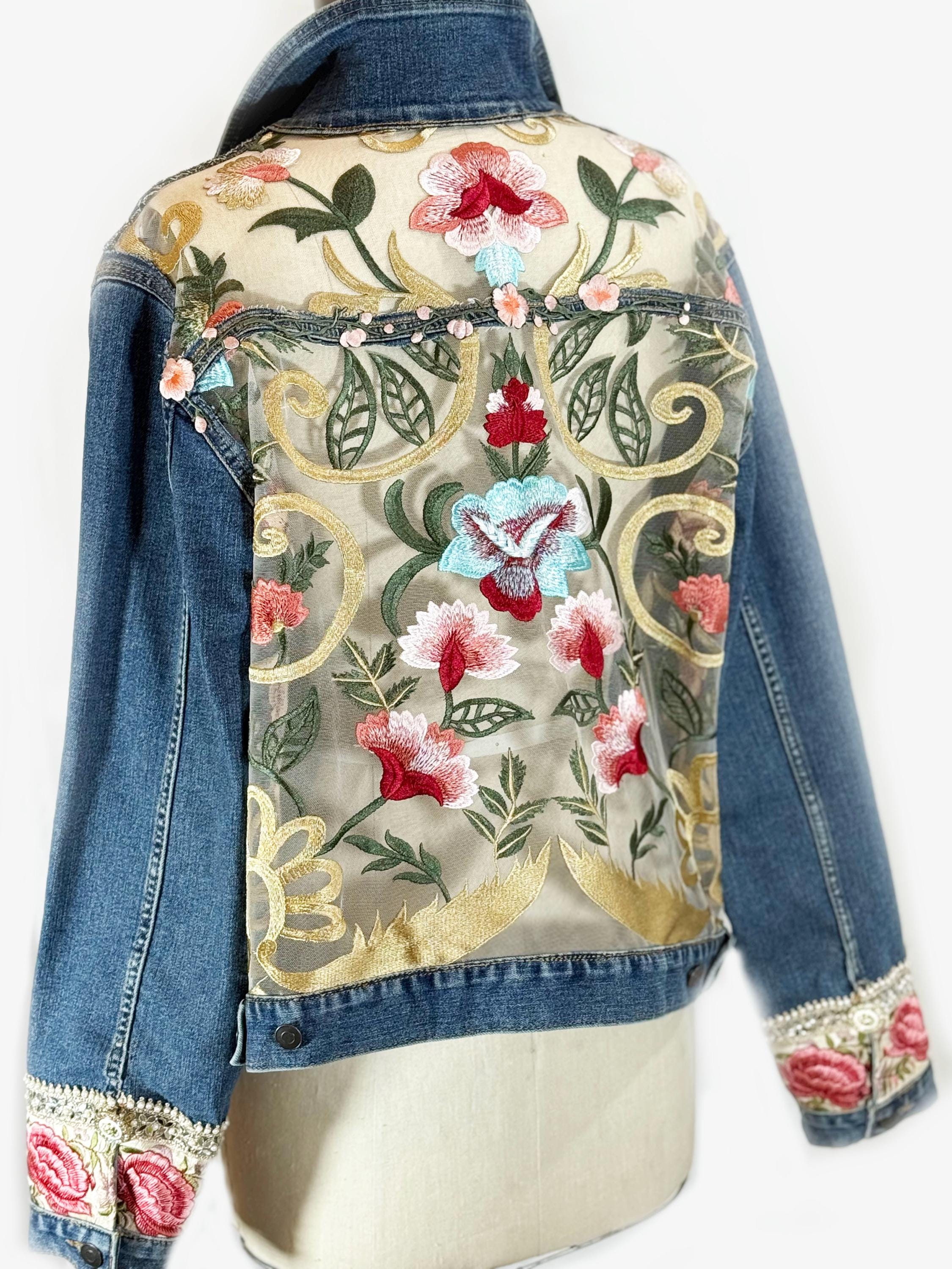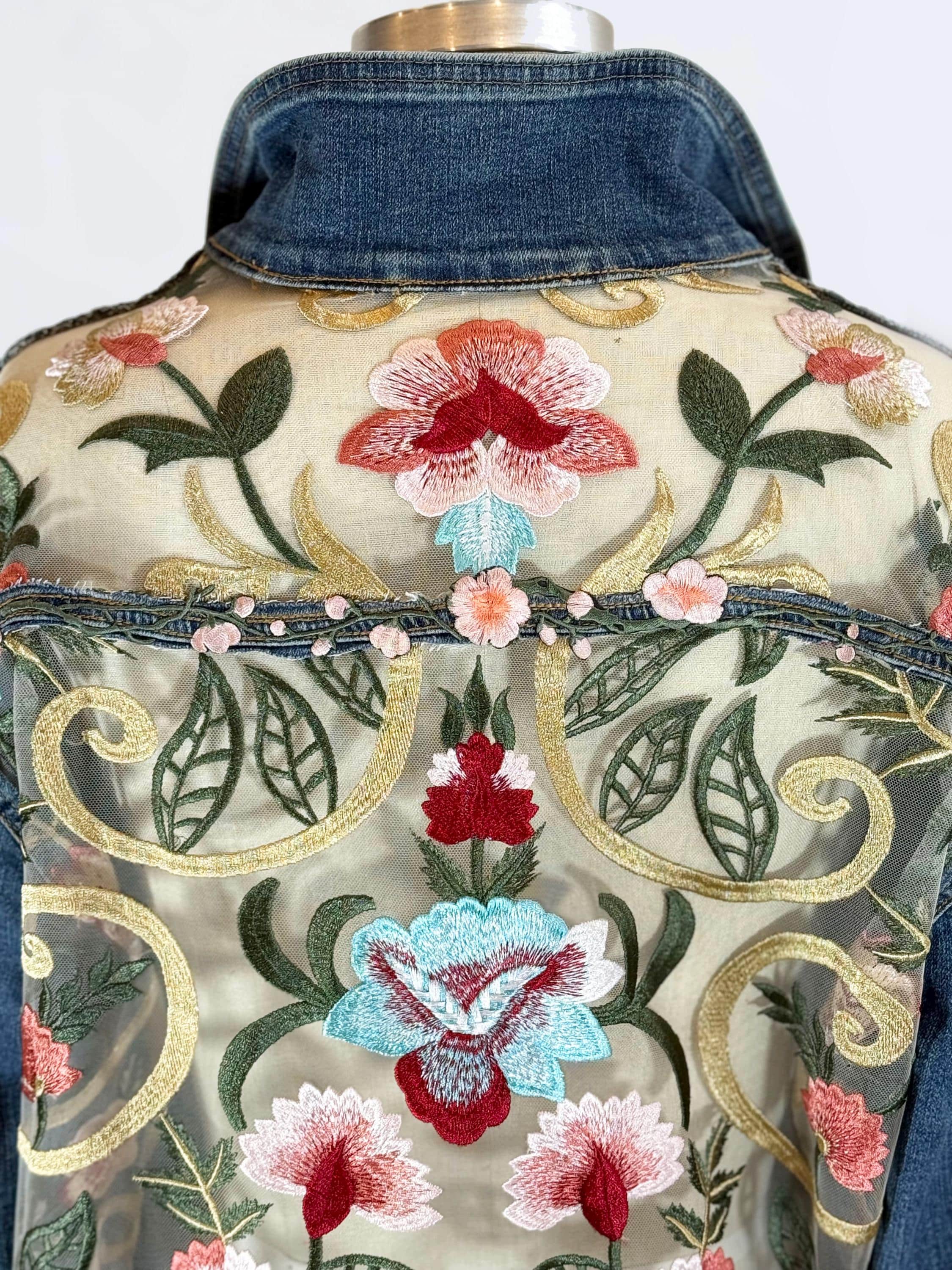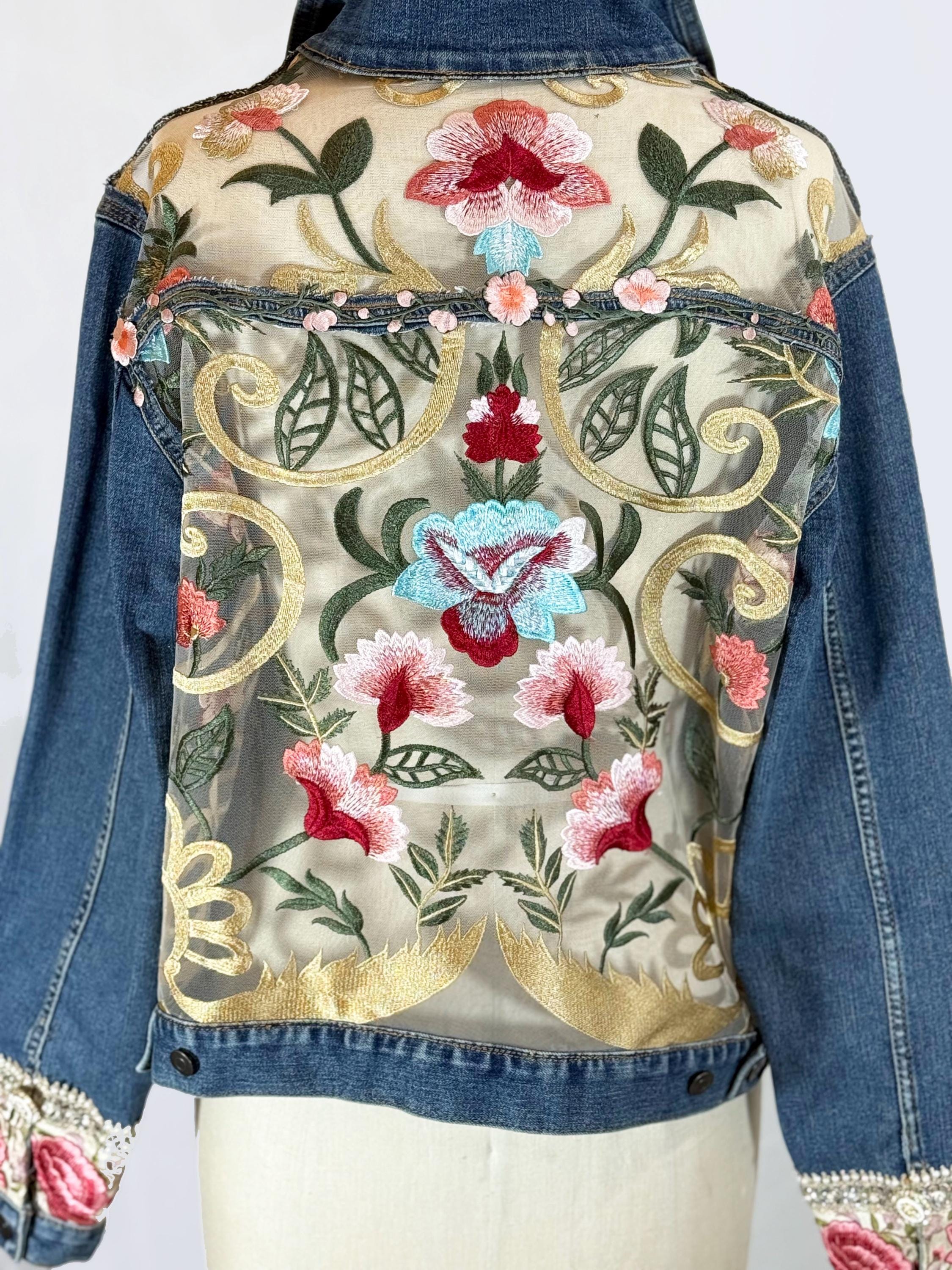 One of a kind oversized denim jacket is meticulously crafted to make a statement. This stunning jacket features a sheer floral front and back inserts. The cuff and collar are exquisitely embellished adding a a sophisticated feel.