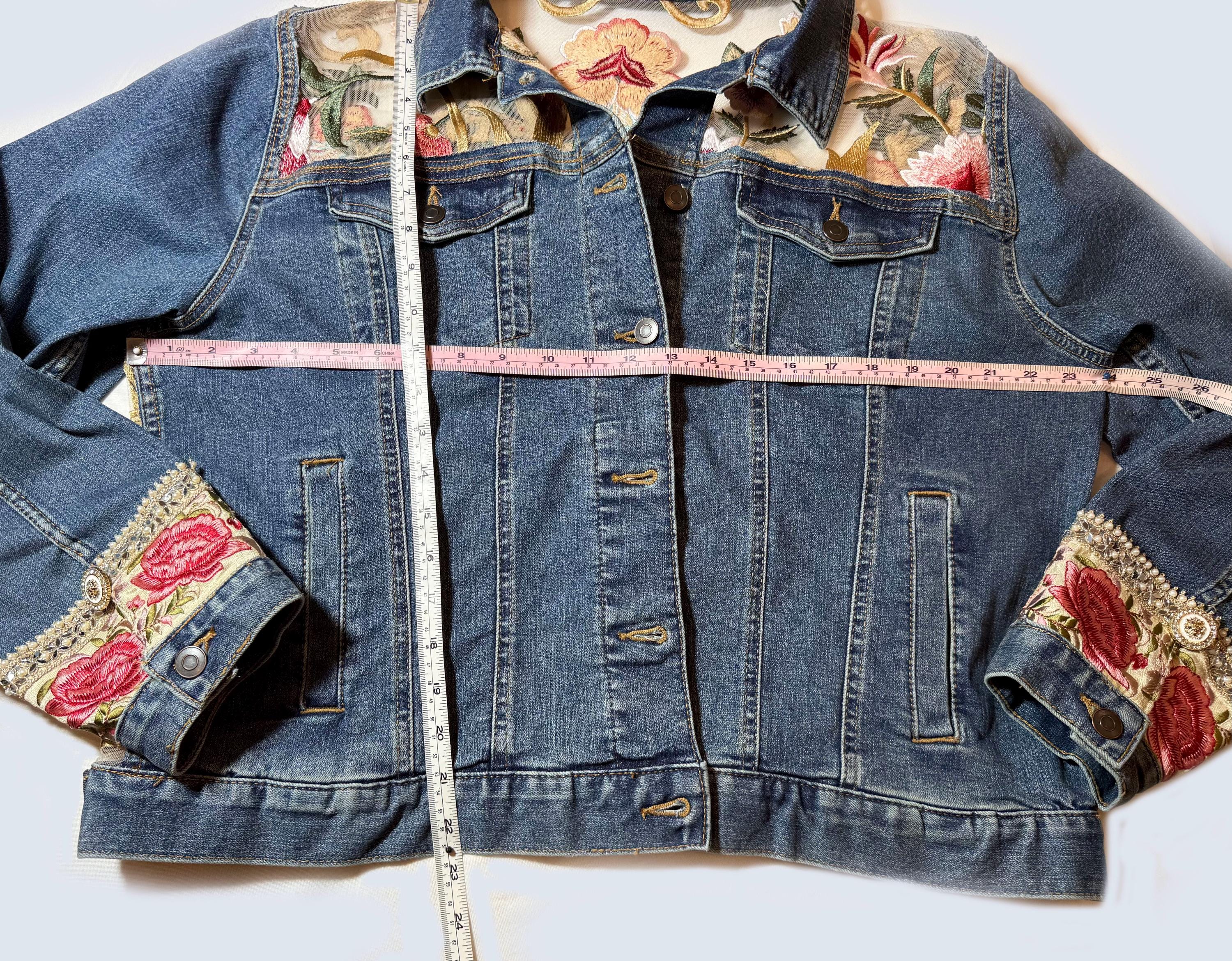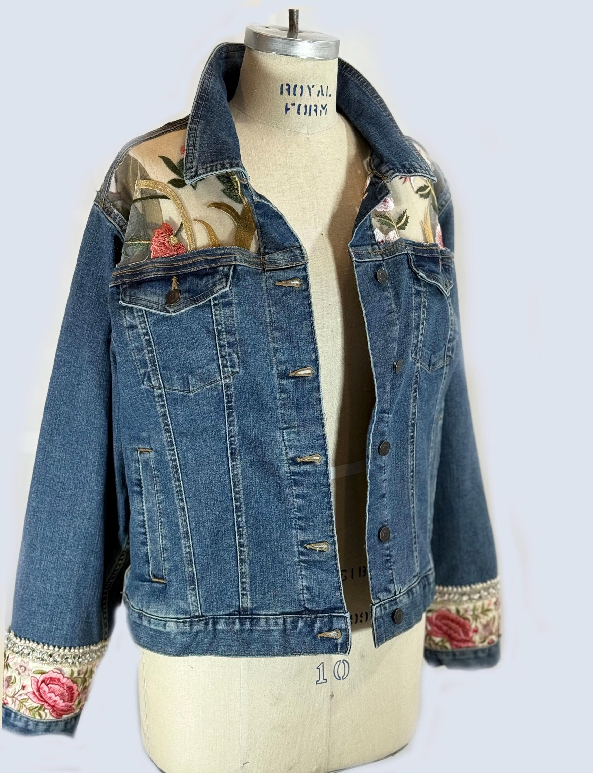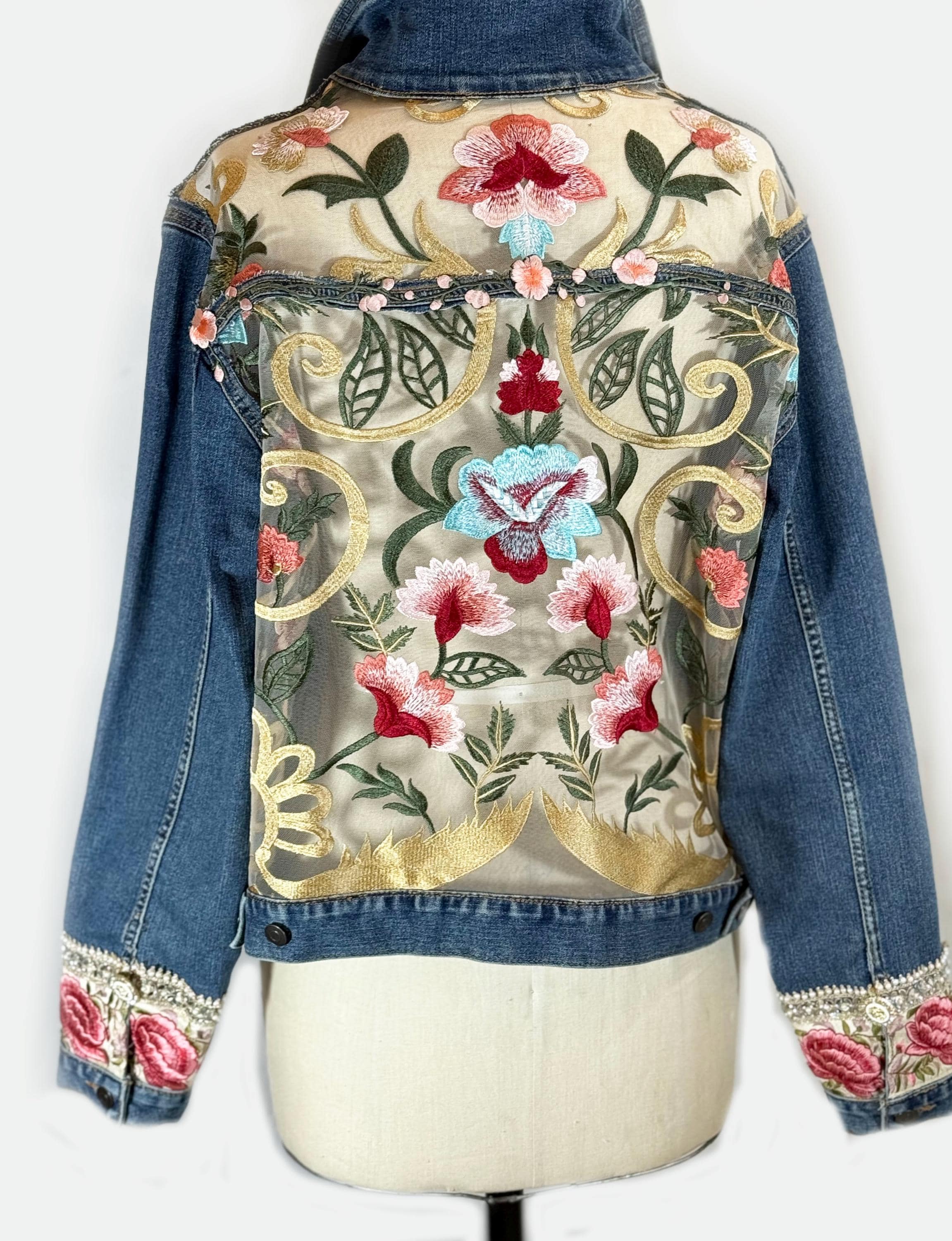 One of a kind oversized denim jacket is meticulously crafted to make a statement. This stunning jacket features a sheer floral front and back inserts. The cuff and collar are exquisitely embellished adding a a sophisticated feel.