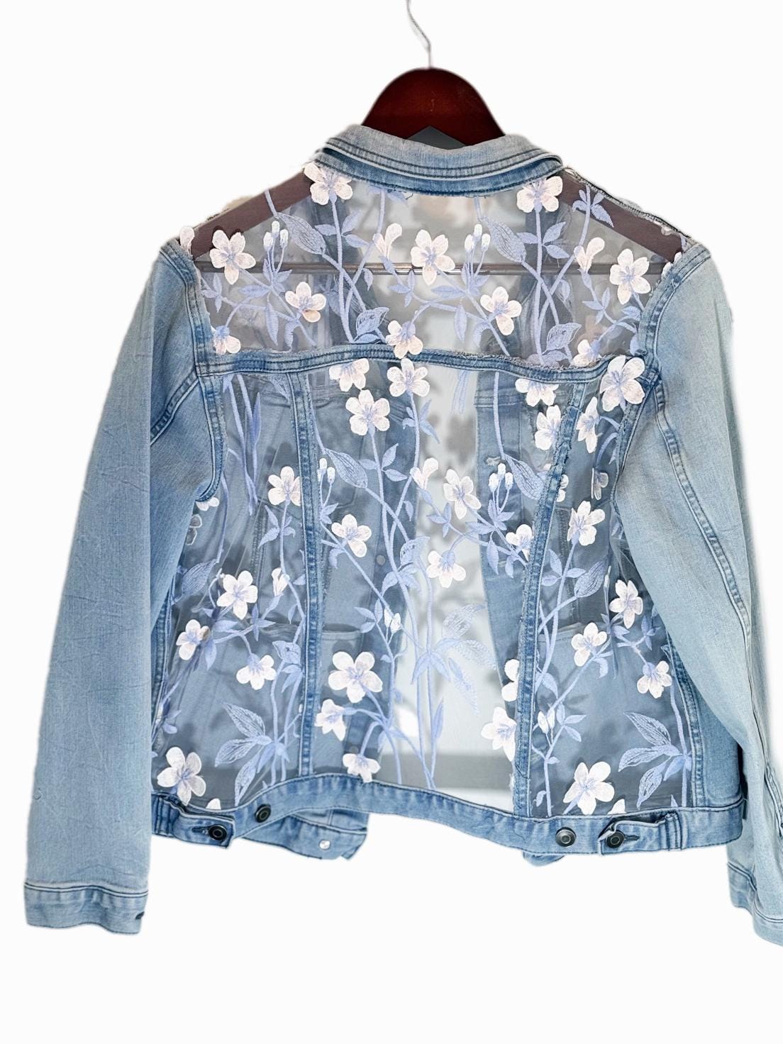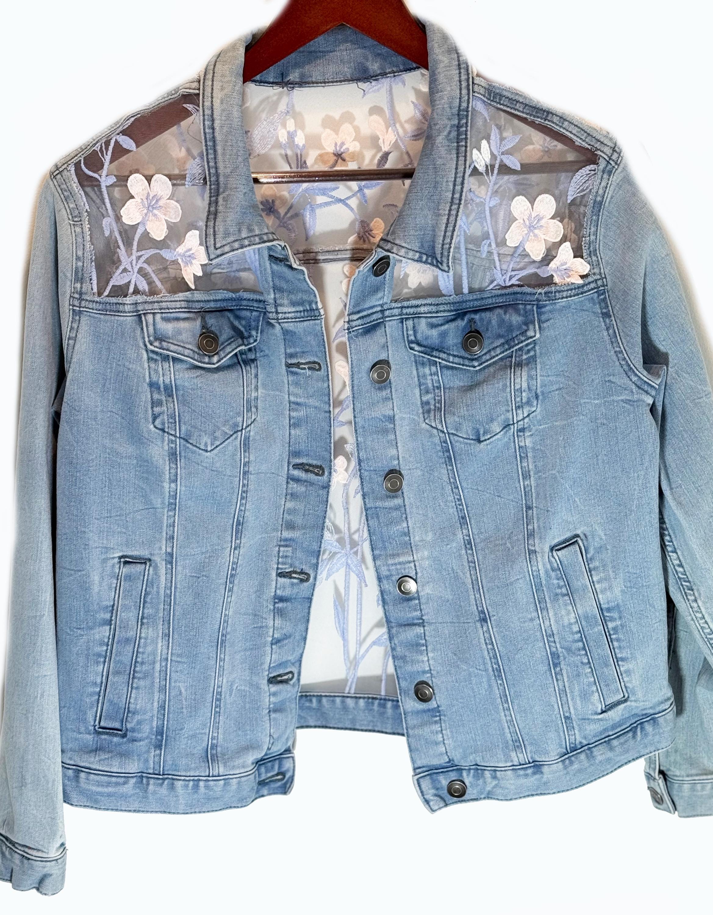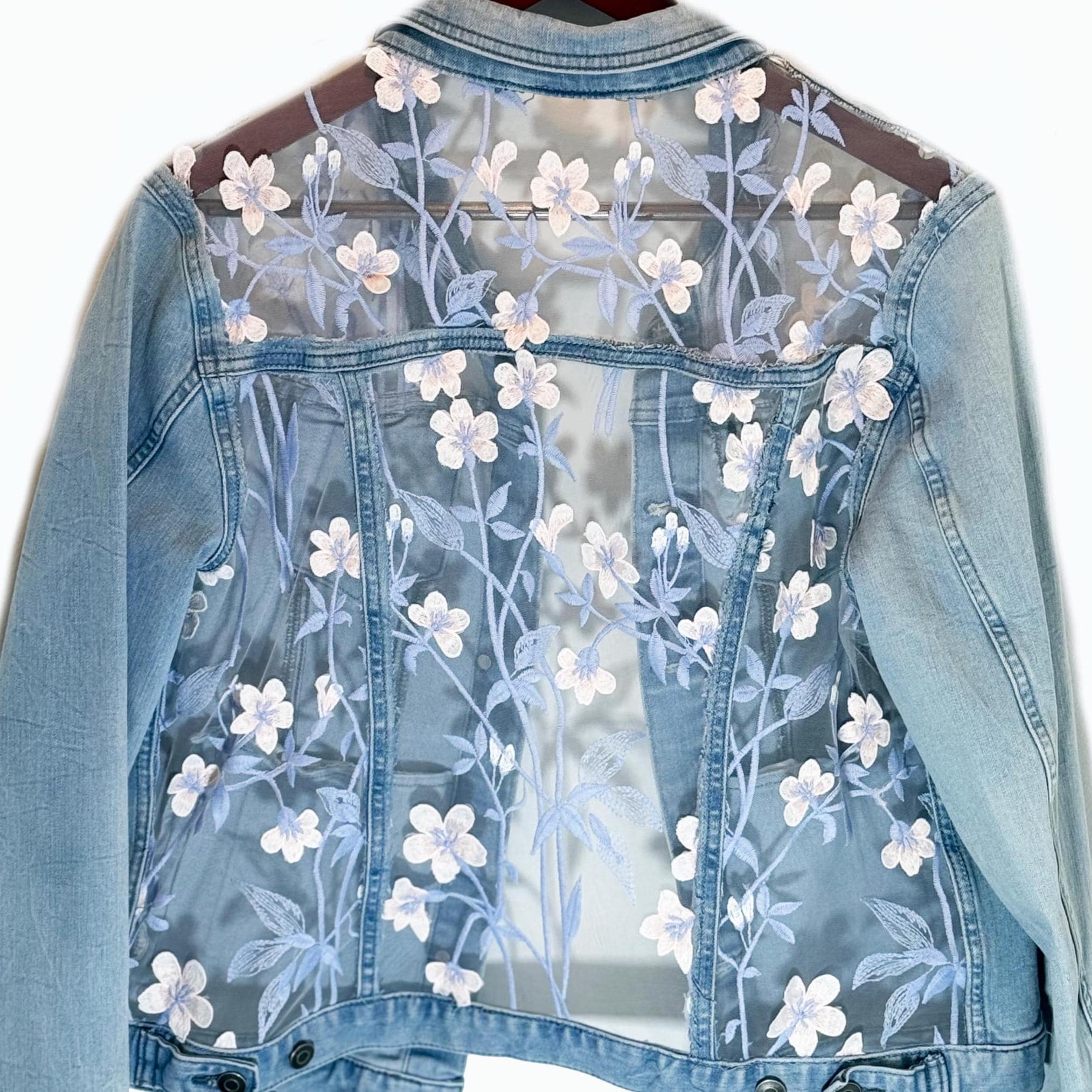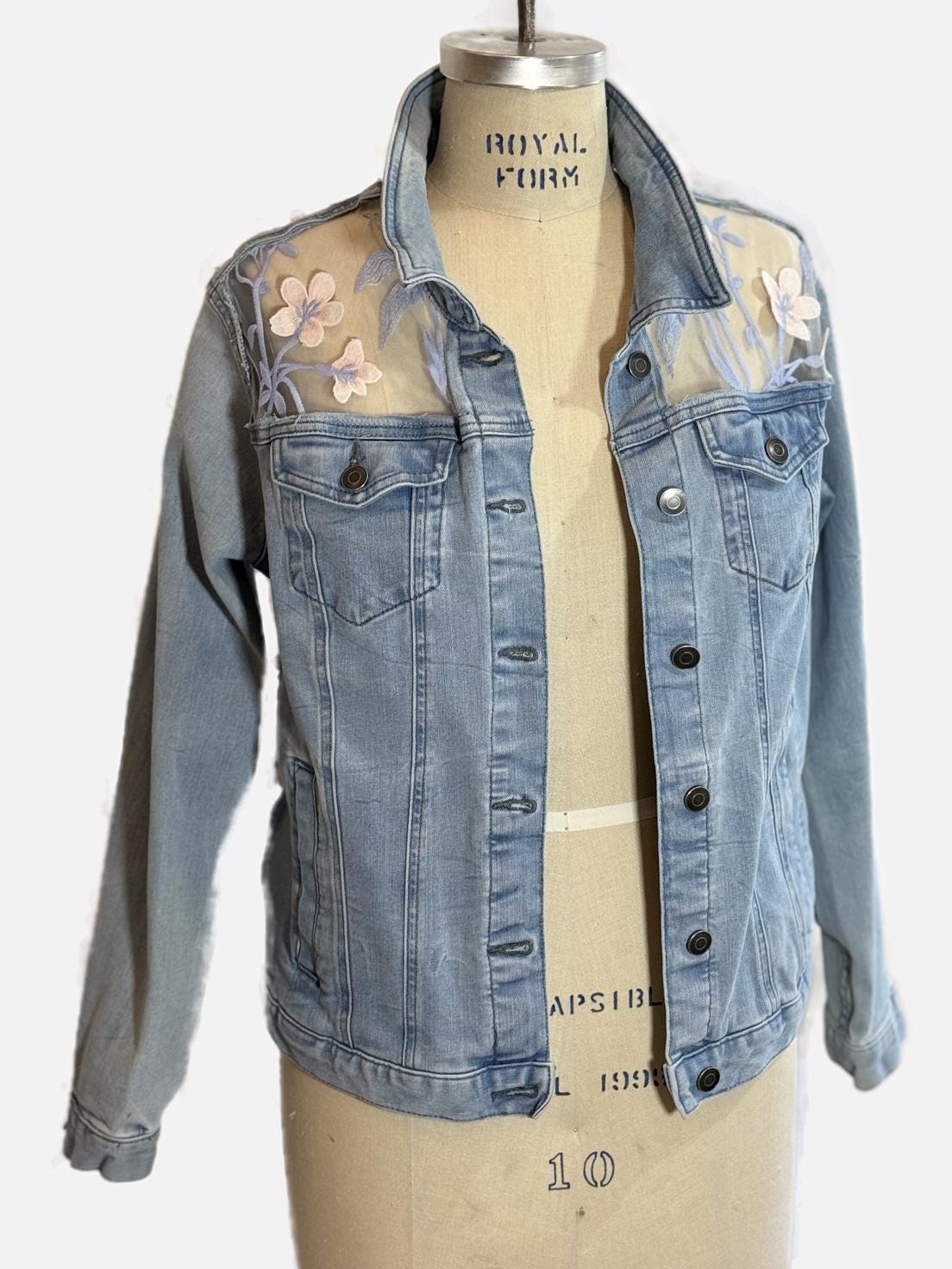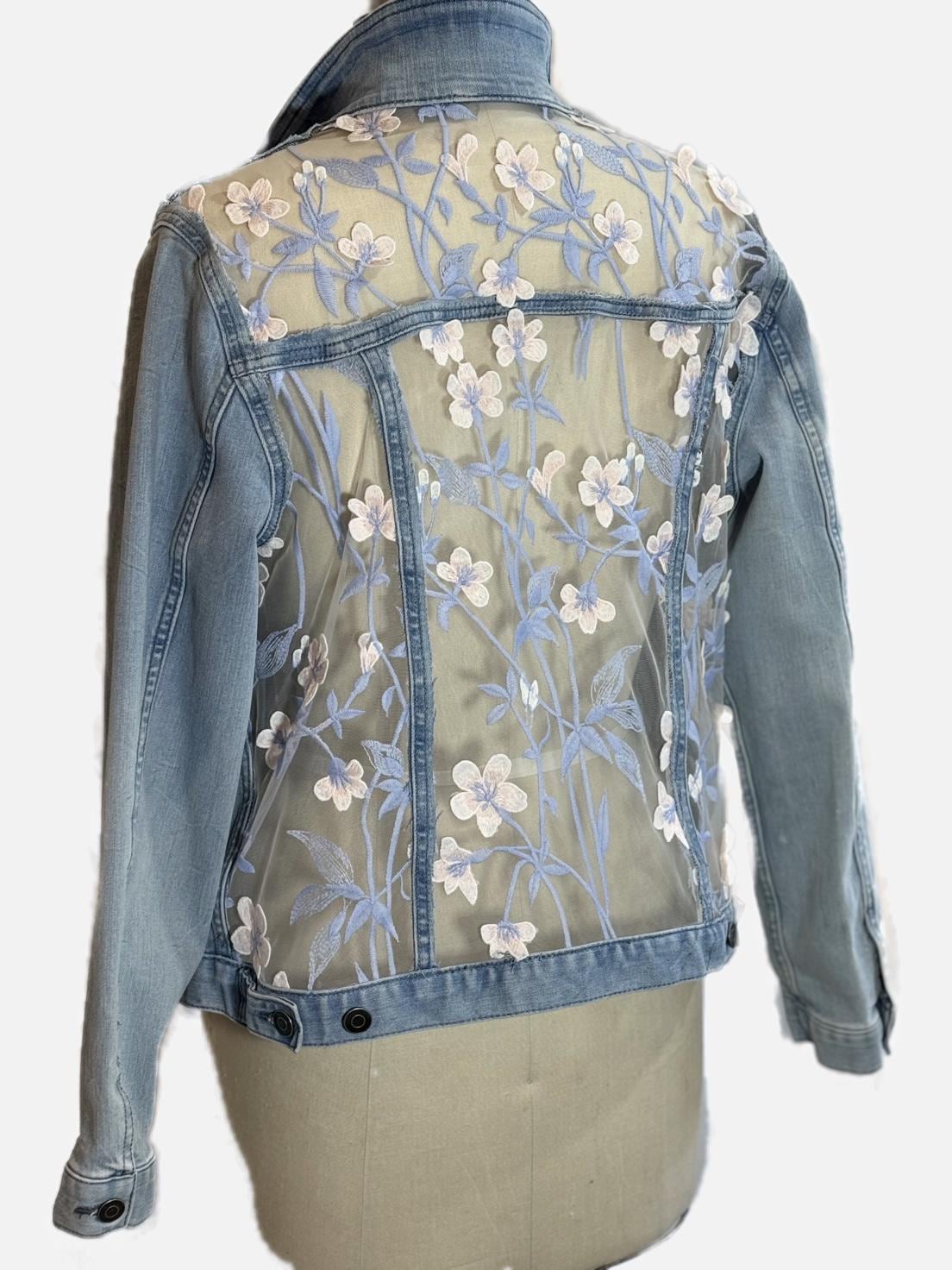 Upcycled Floral Denim Jacket with Sheer Embroidered Mesh Back-One of a Kind Boho Jean Jacket