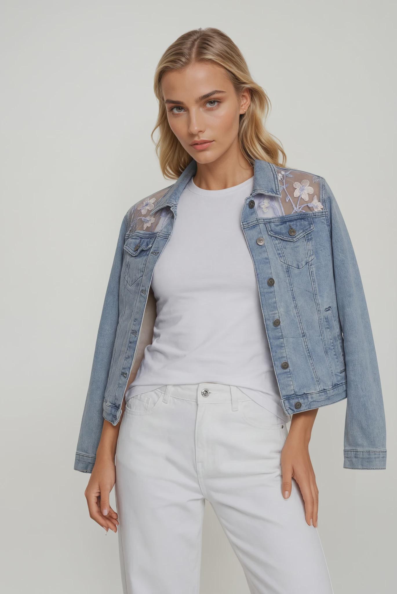 This light wash denim jacket is meticulously crafted to make a statement. This stunning jacket features a sheer blue and white floral front and back.