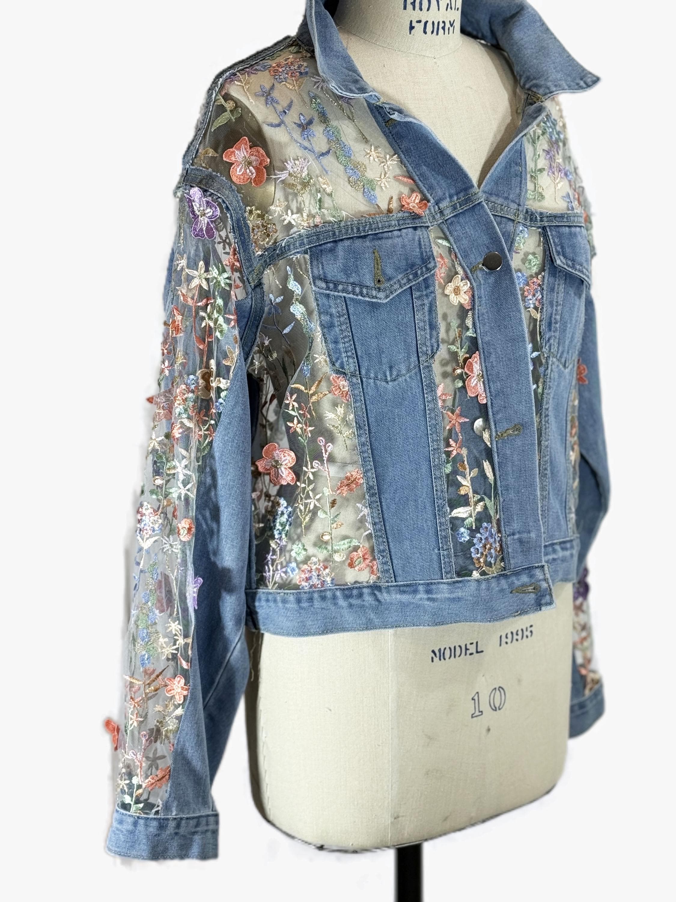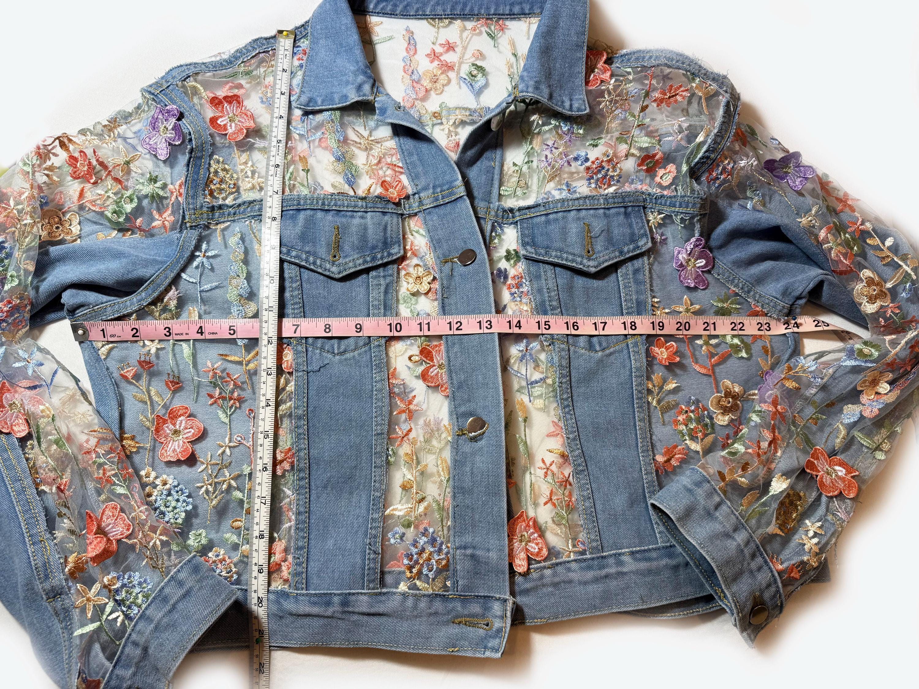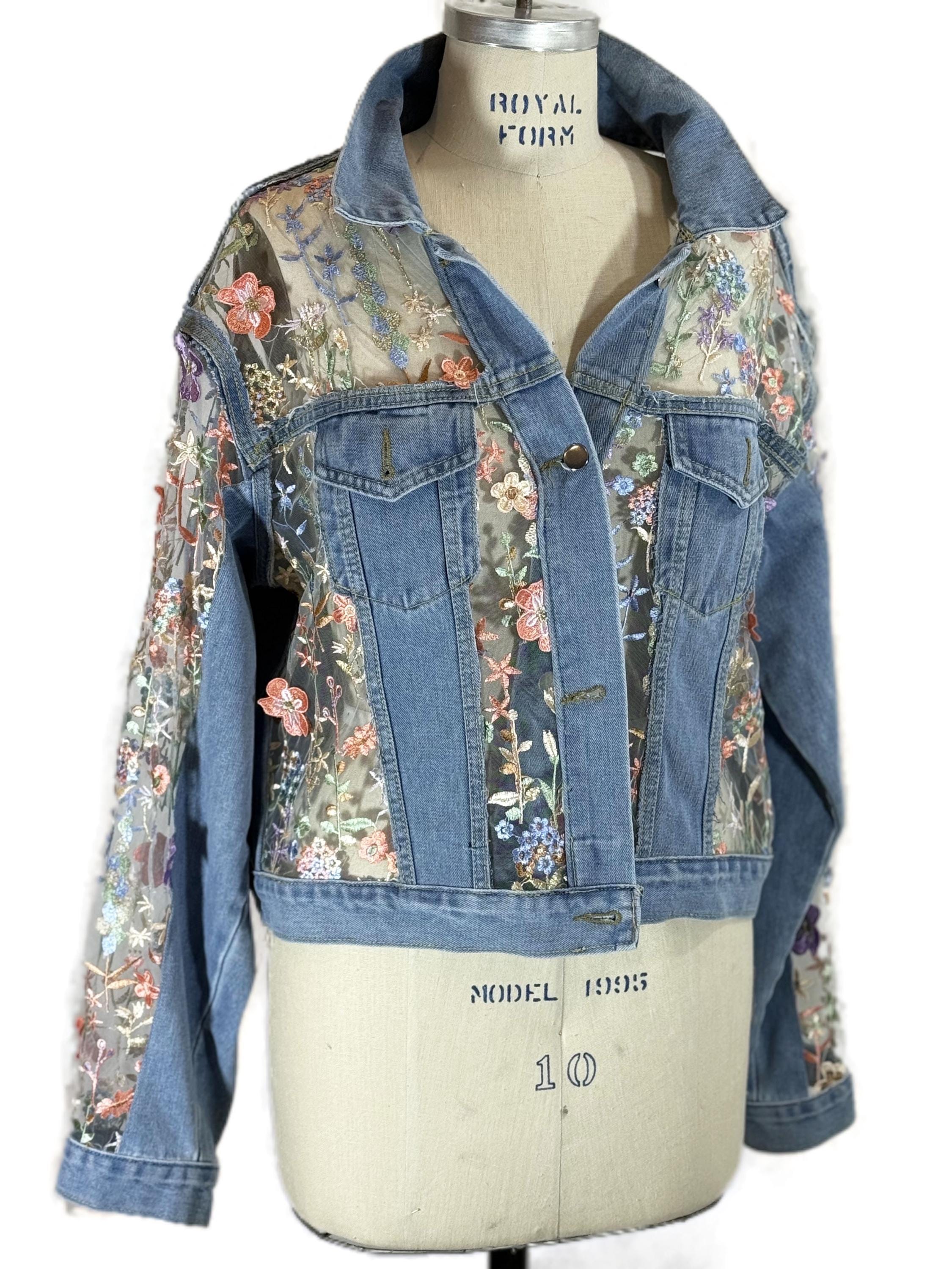 Oversized light wash denim jacket is meticulously crafted to make a statement. This stunning jacket features a sheer floral front and back and sleeve floral inserts.