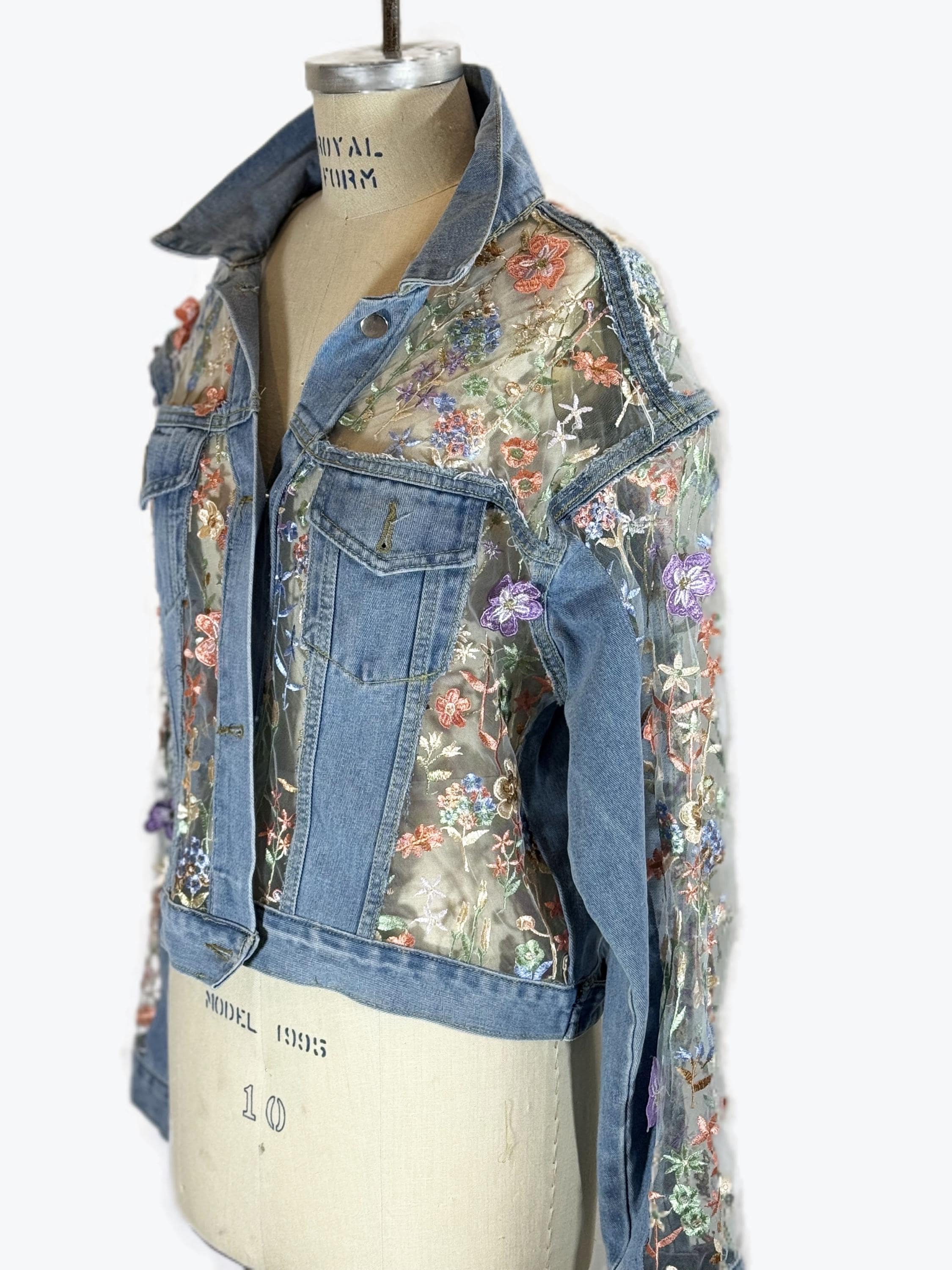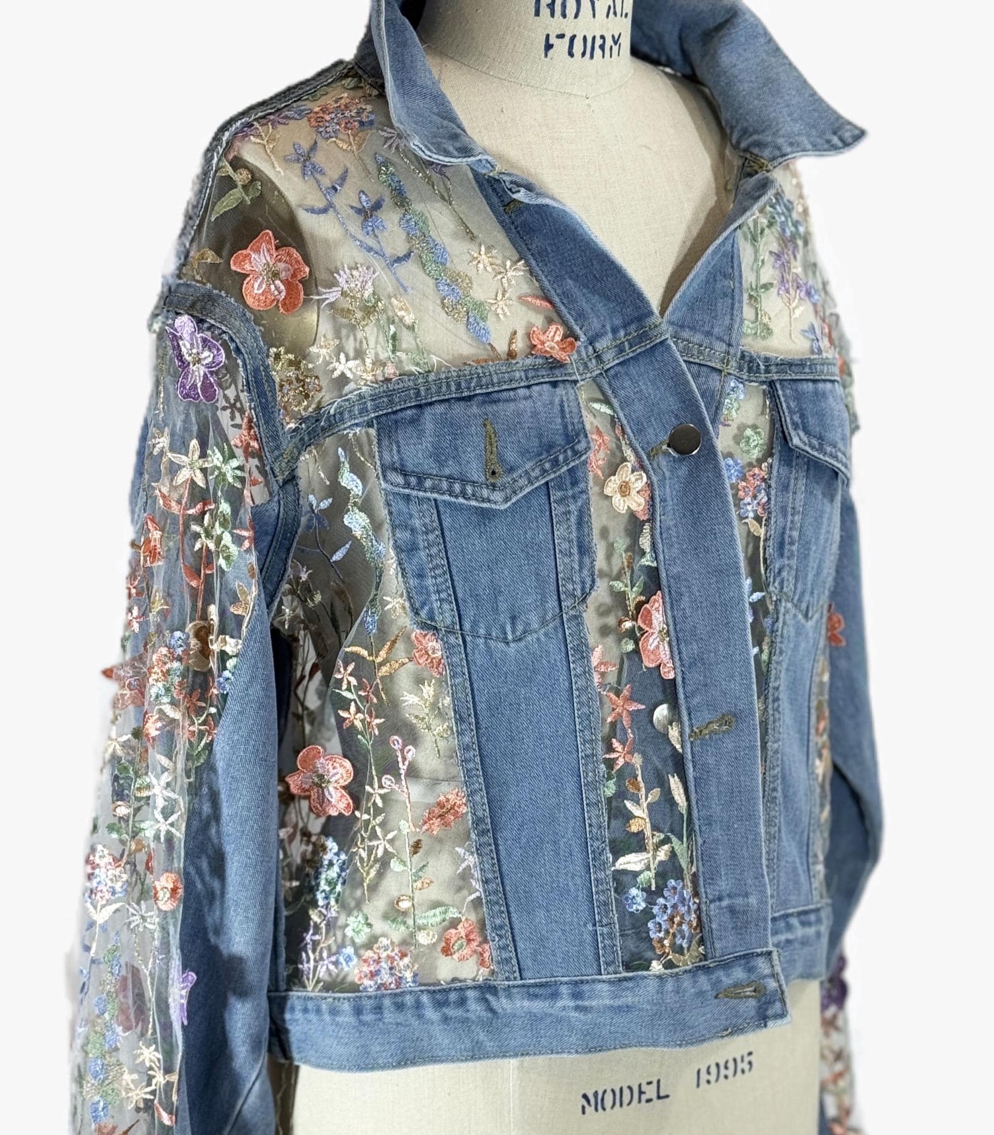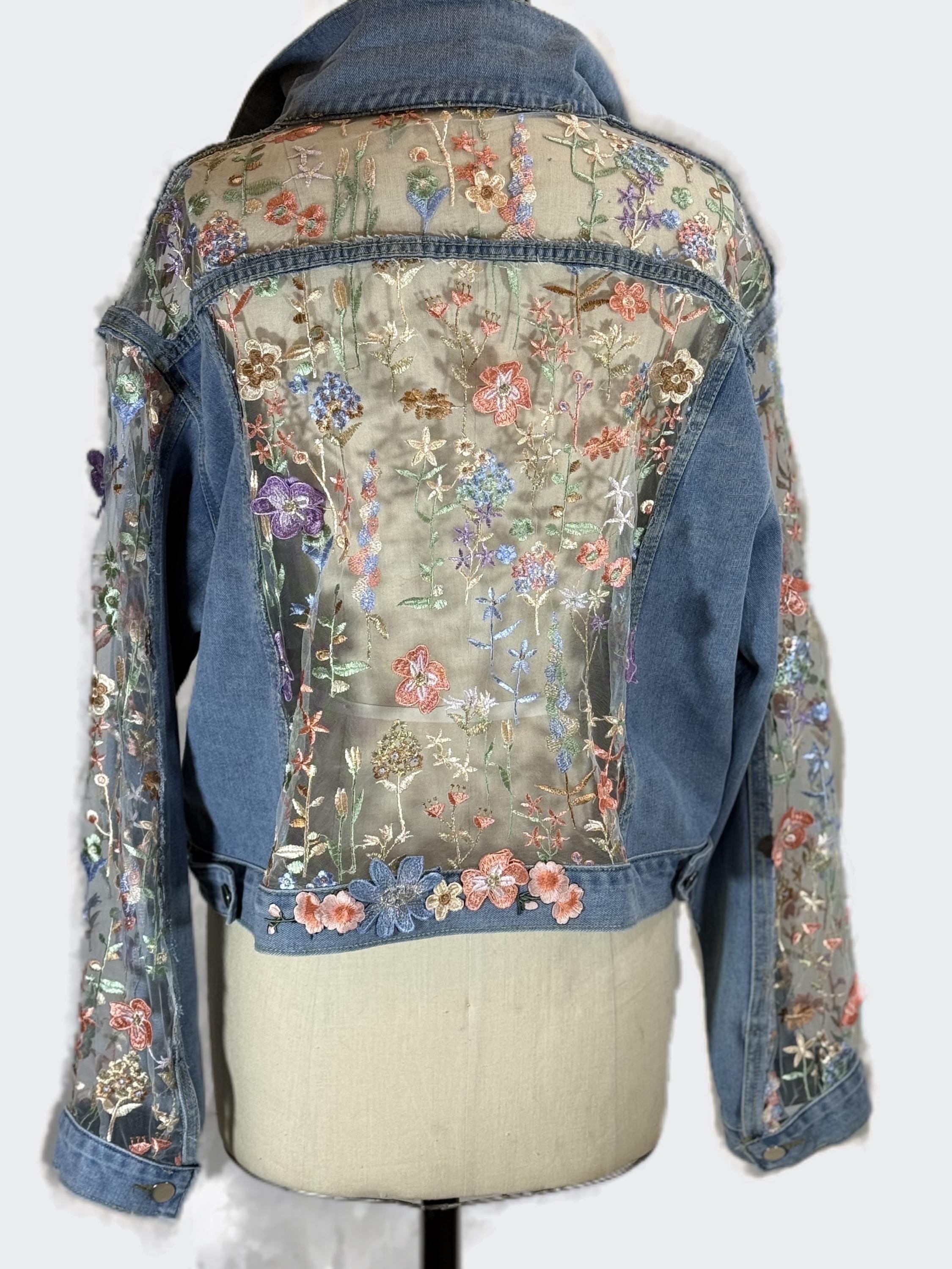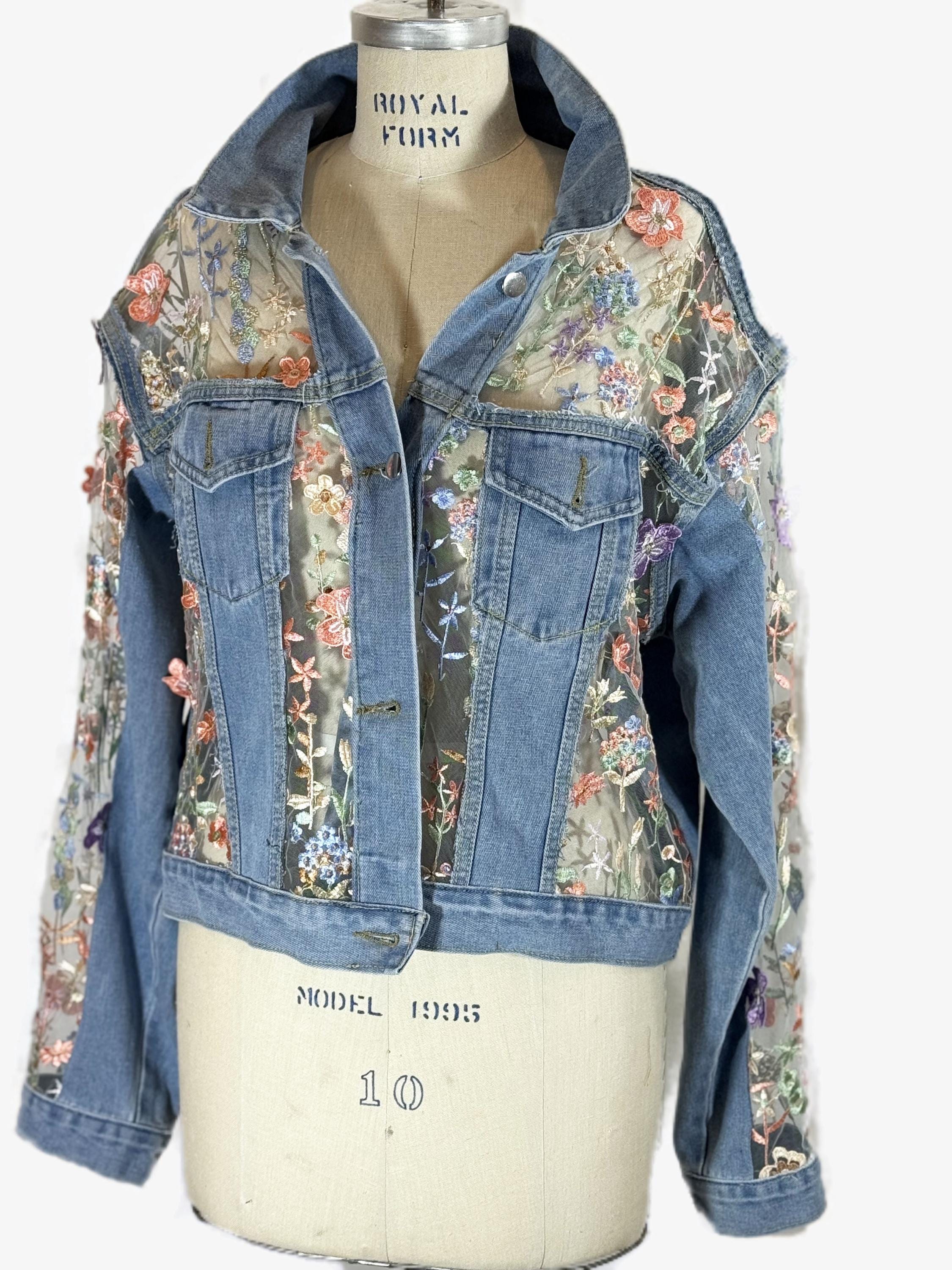 Oversized light wash denim jacket is meticulously crafted to make a statement. This stunning jacket features a sheer floral front and back and sleeve floral inserts.
