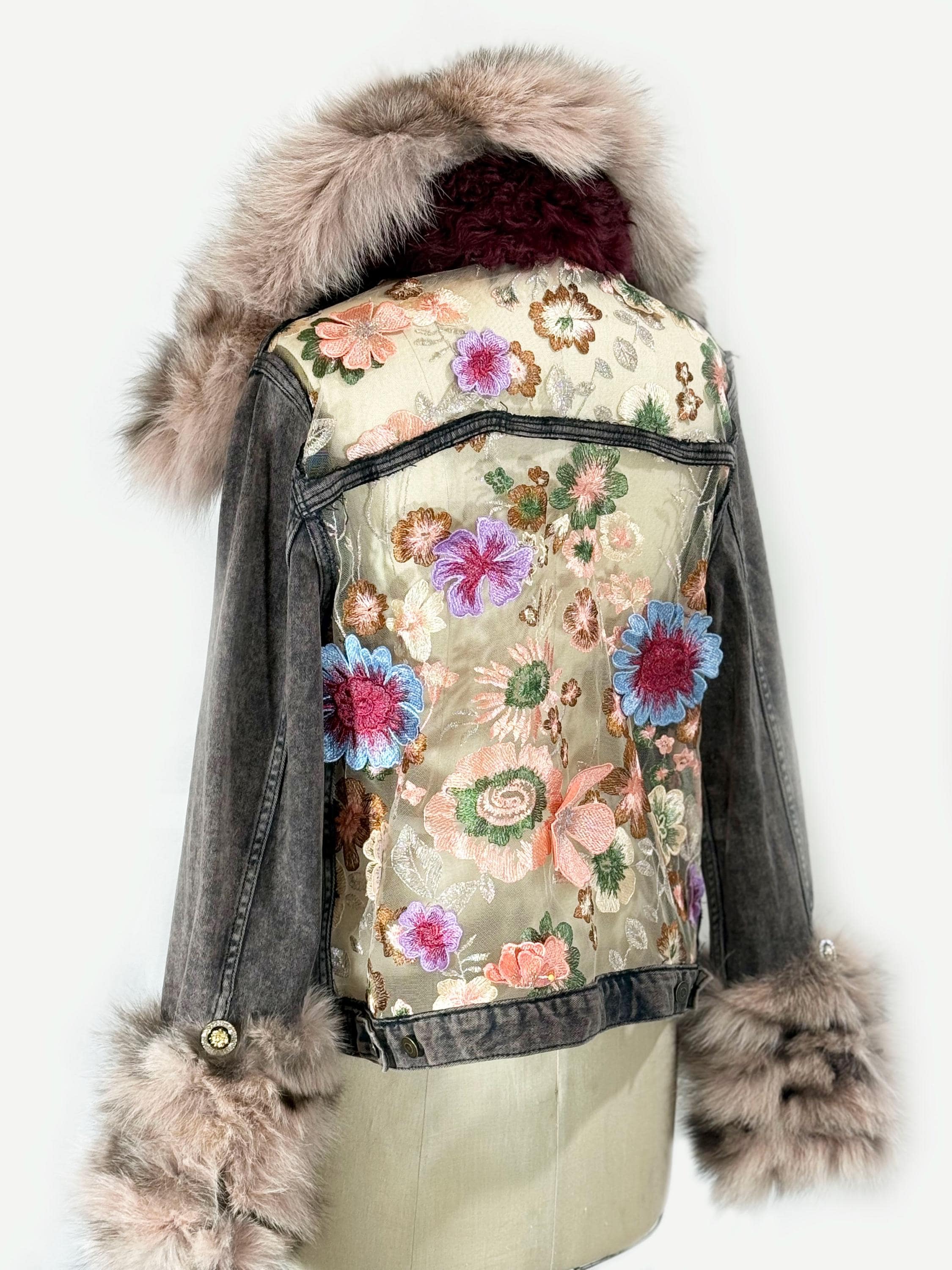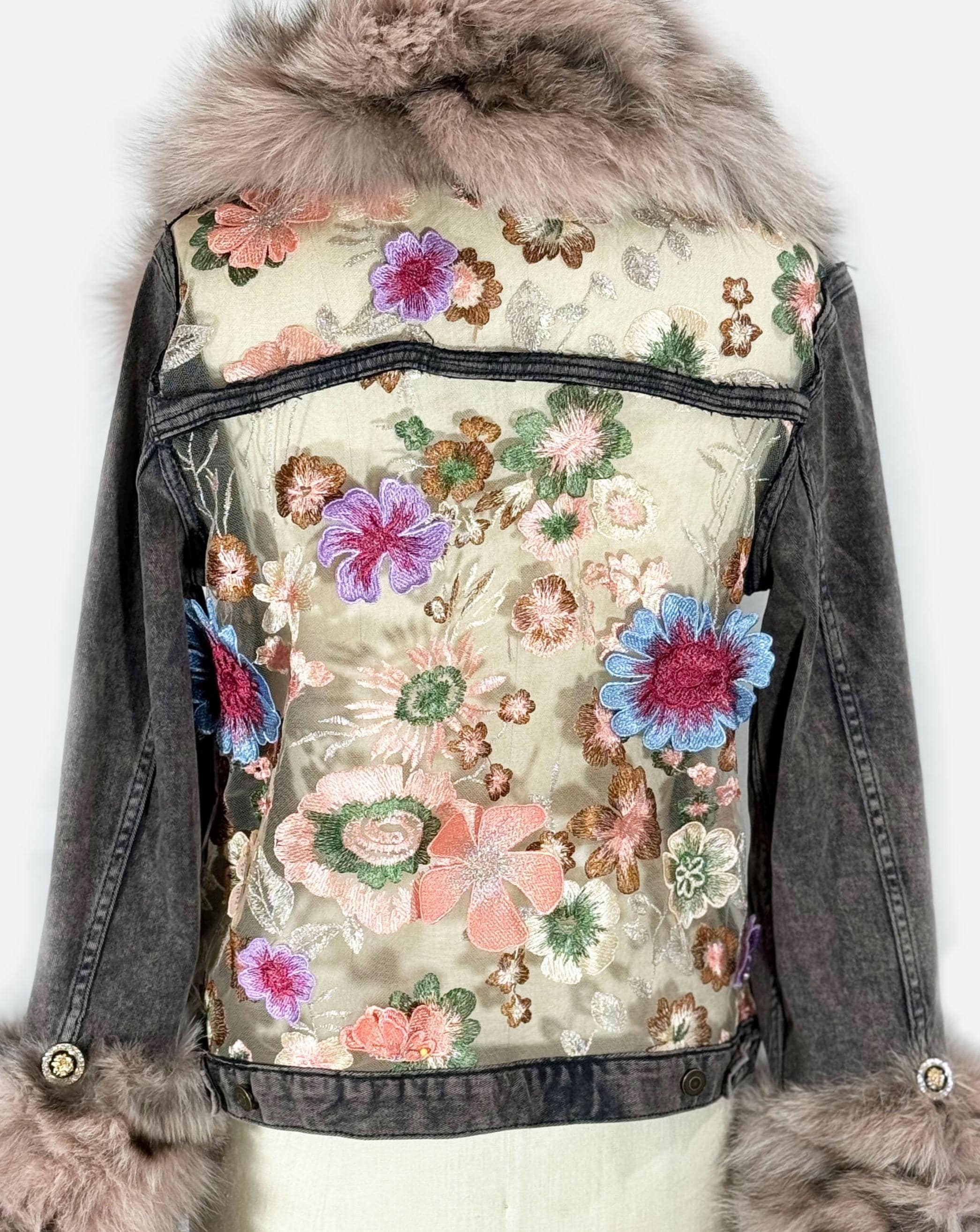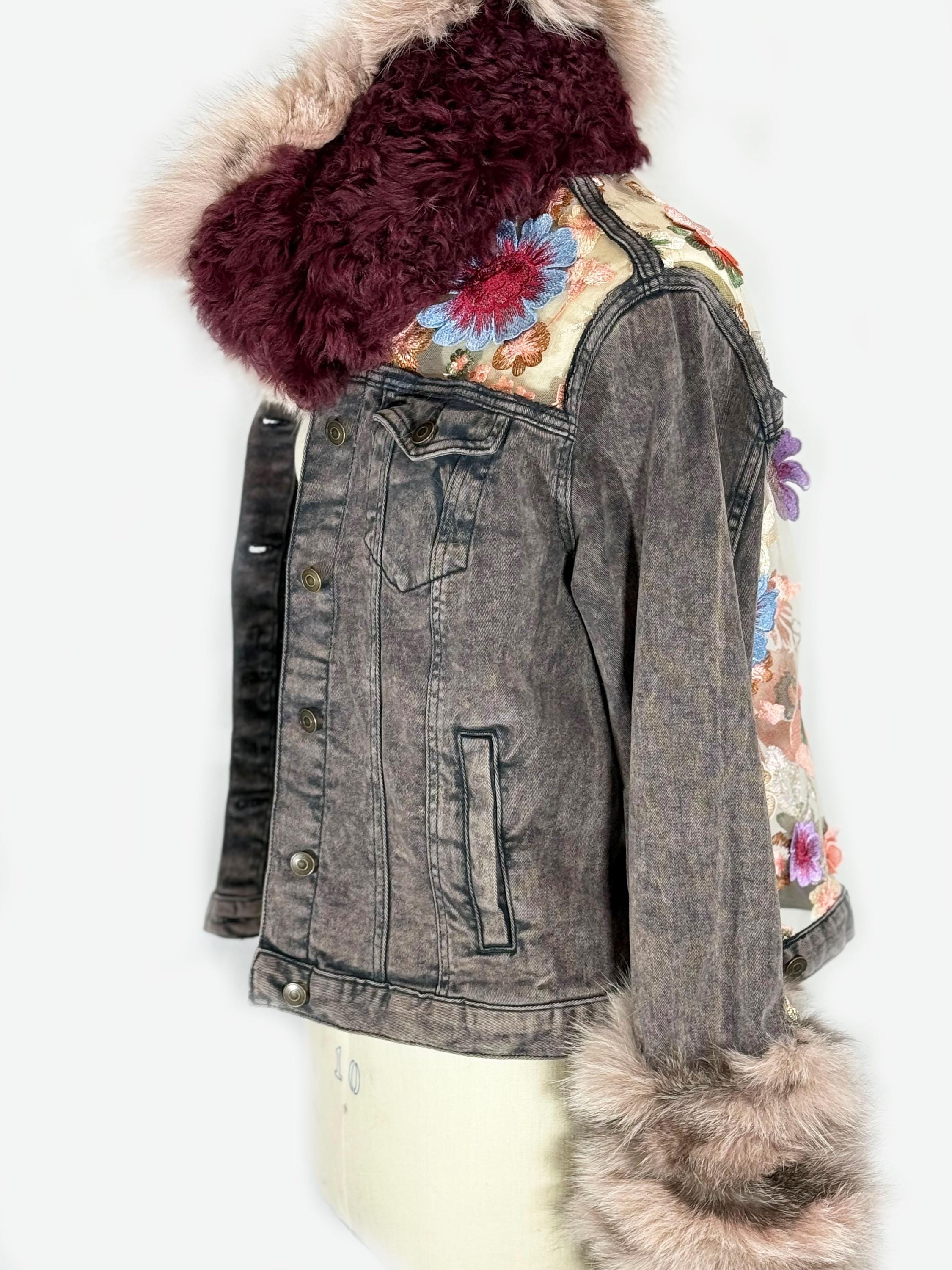 One of a Kind up cycled stoned wash jeans jacket with Rose fox collar and cuff with a lace motif insert