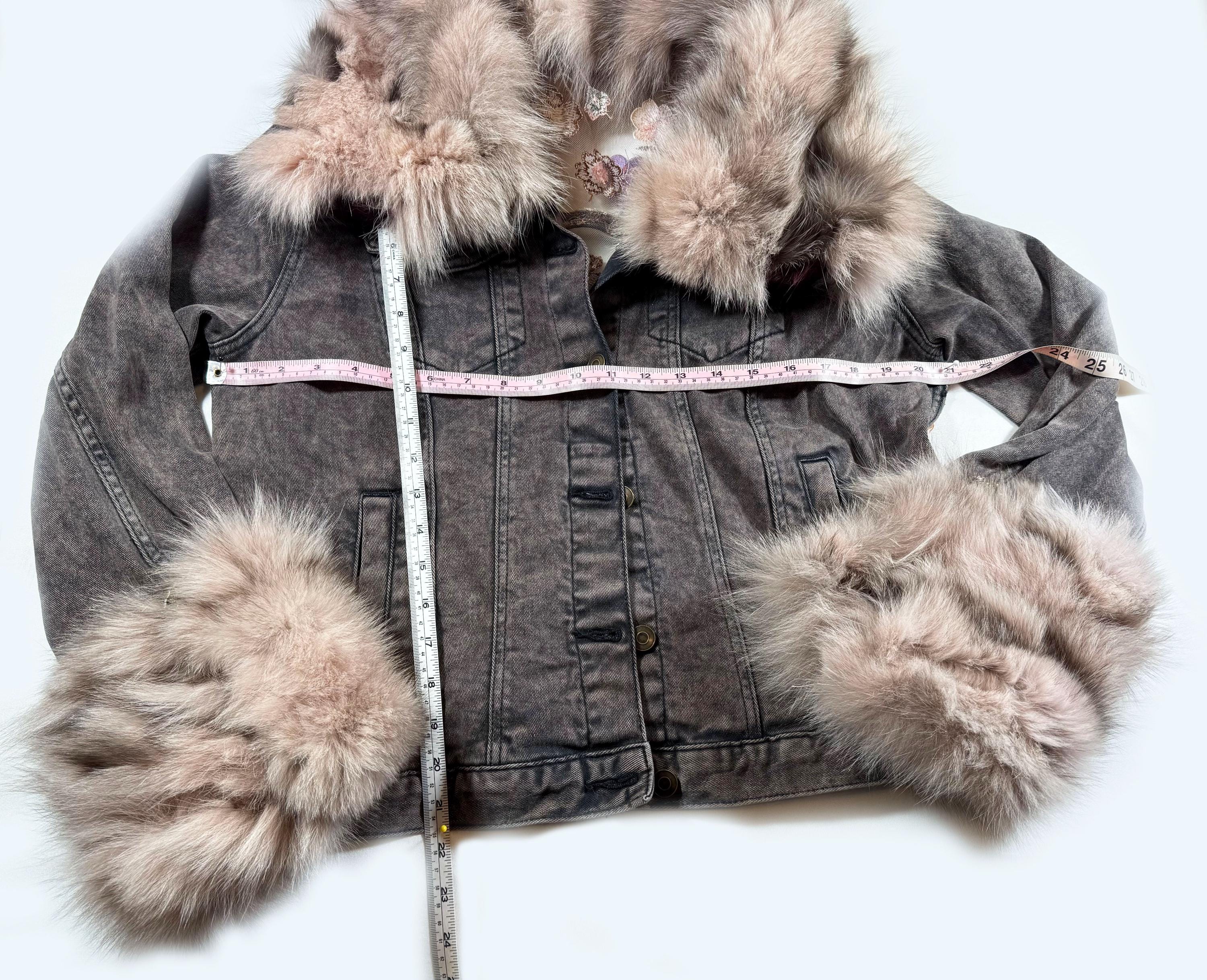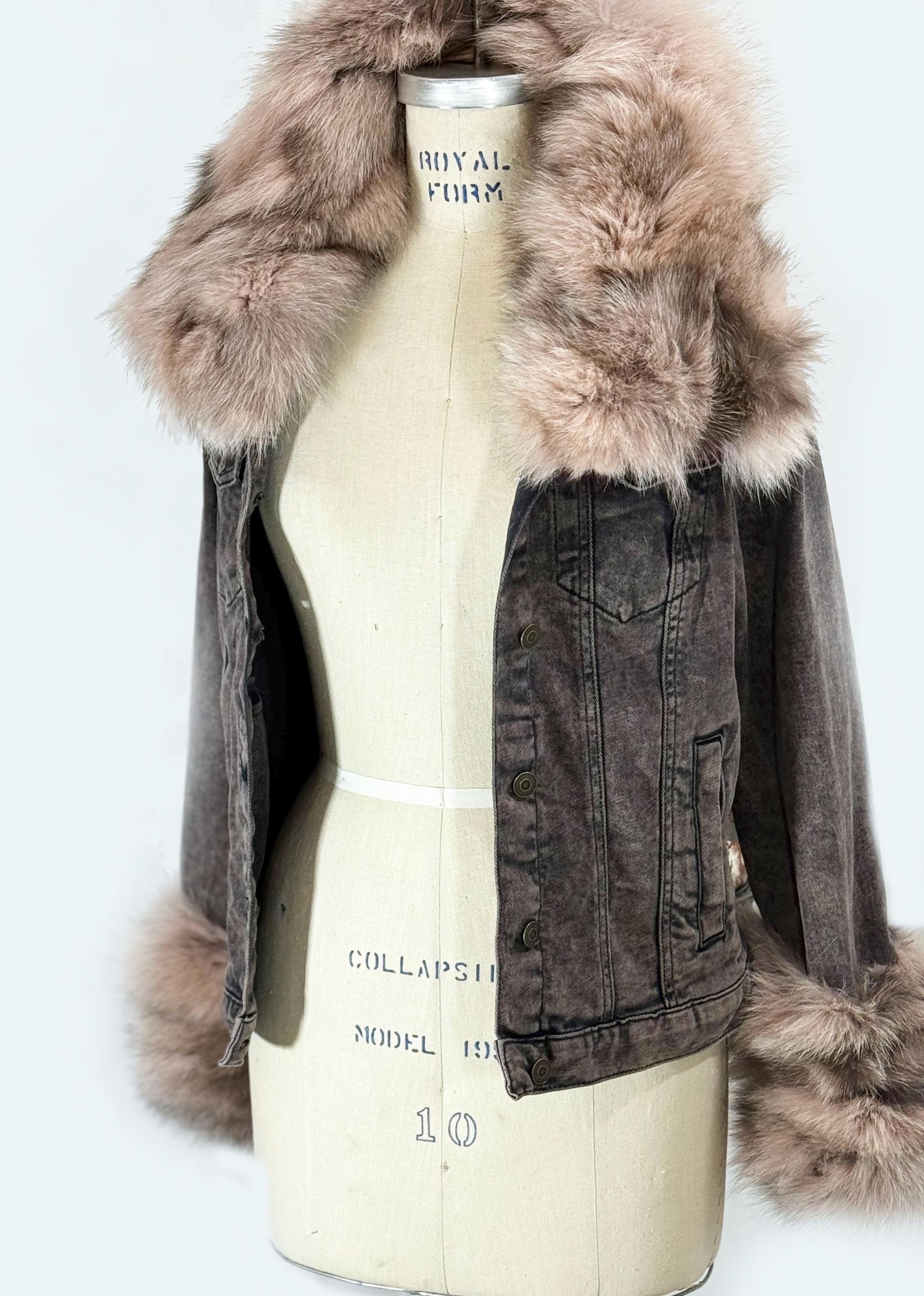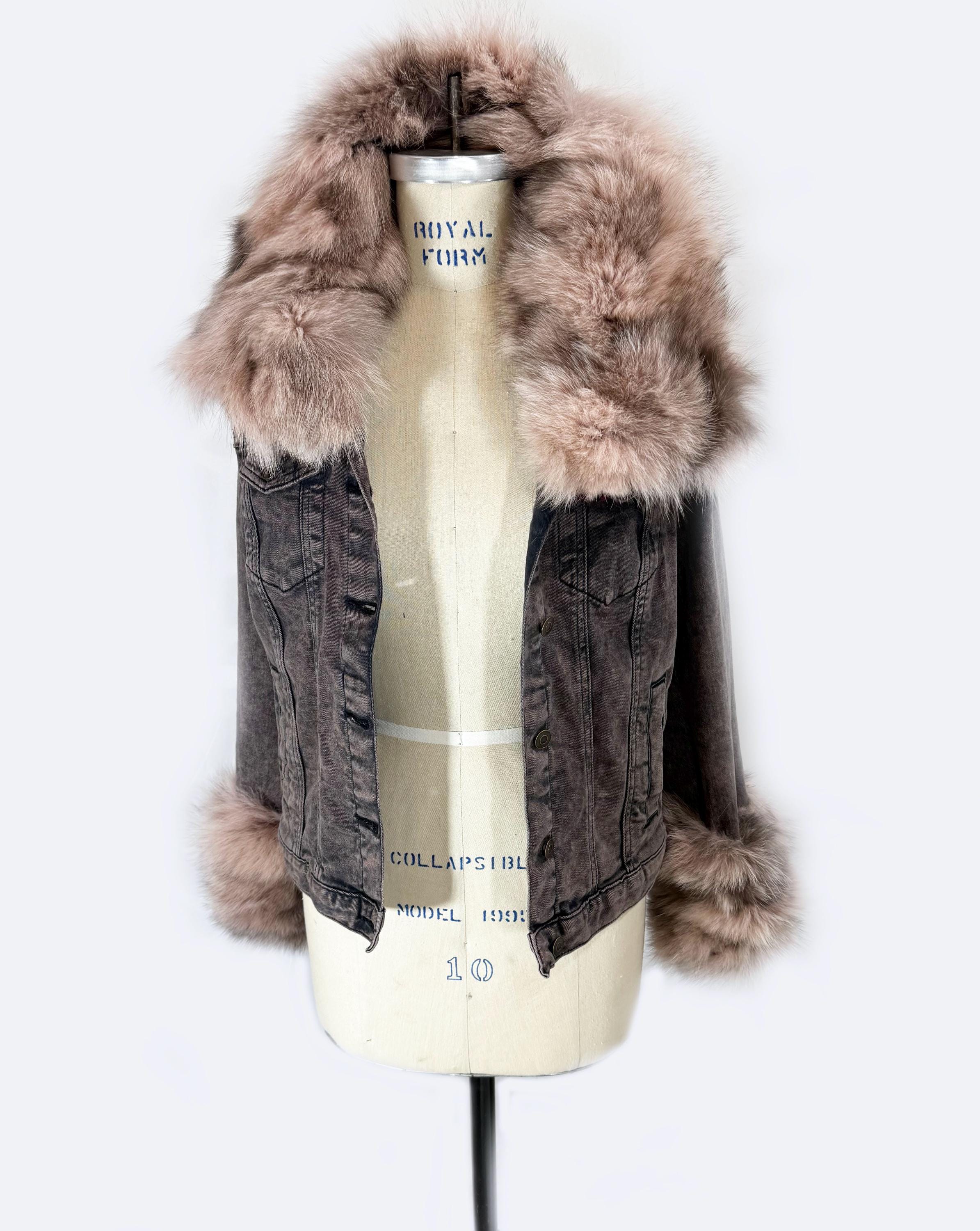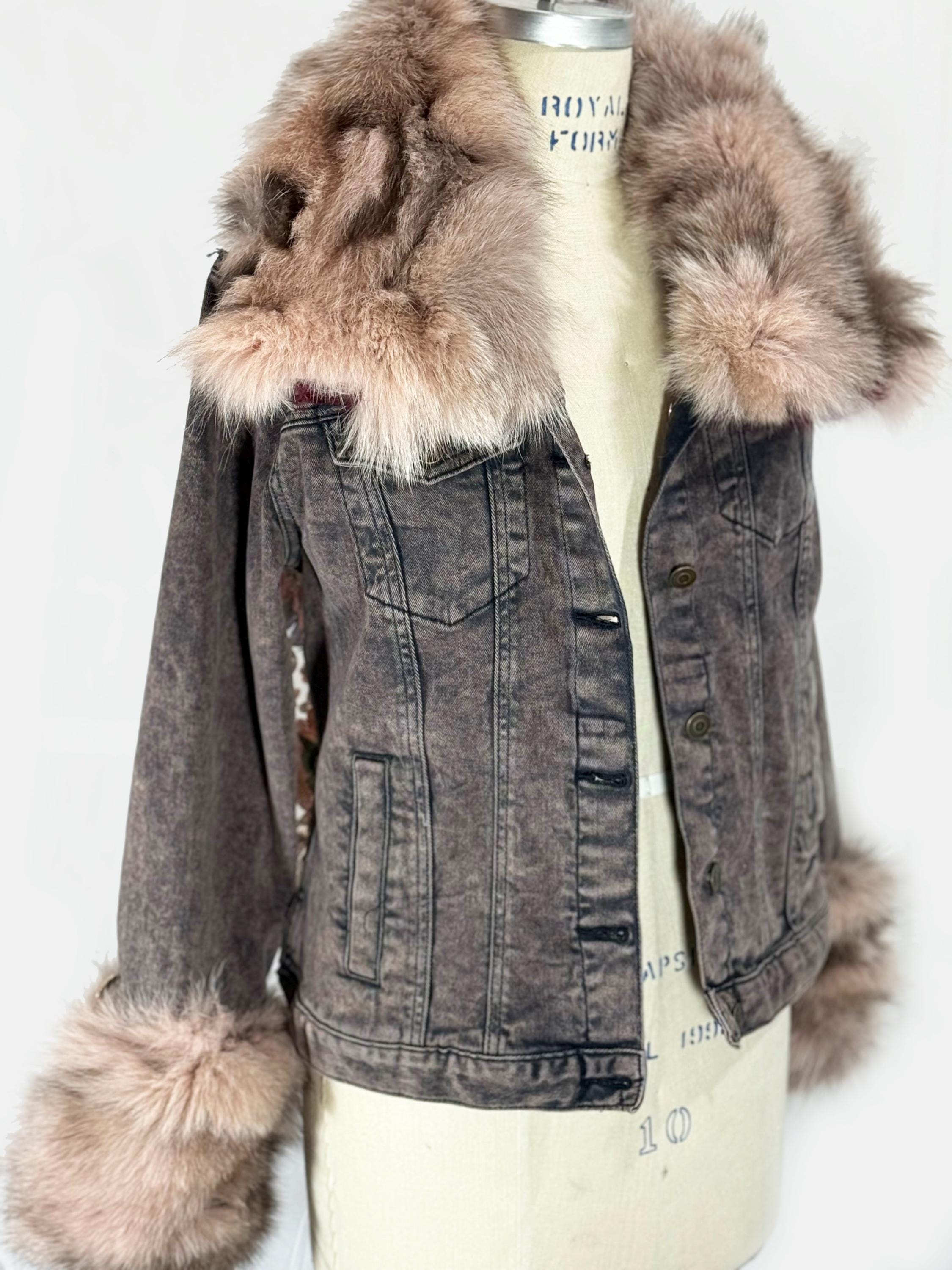 This One of a kind Up cycled Stone Wash Jeans Jacket, a perfect blend of sustainable fashion and timeless style. This unique piece features a steel gray soft stone-washed denim that offers a beautifully worn-in look, making each jacket one-of-a-kind. The standout feature is the luxurious rose fox collar with a wine shearling and rose fox fur cuffs, adding a touch of elegance and warmth to your outfit.