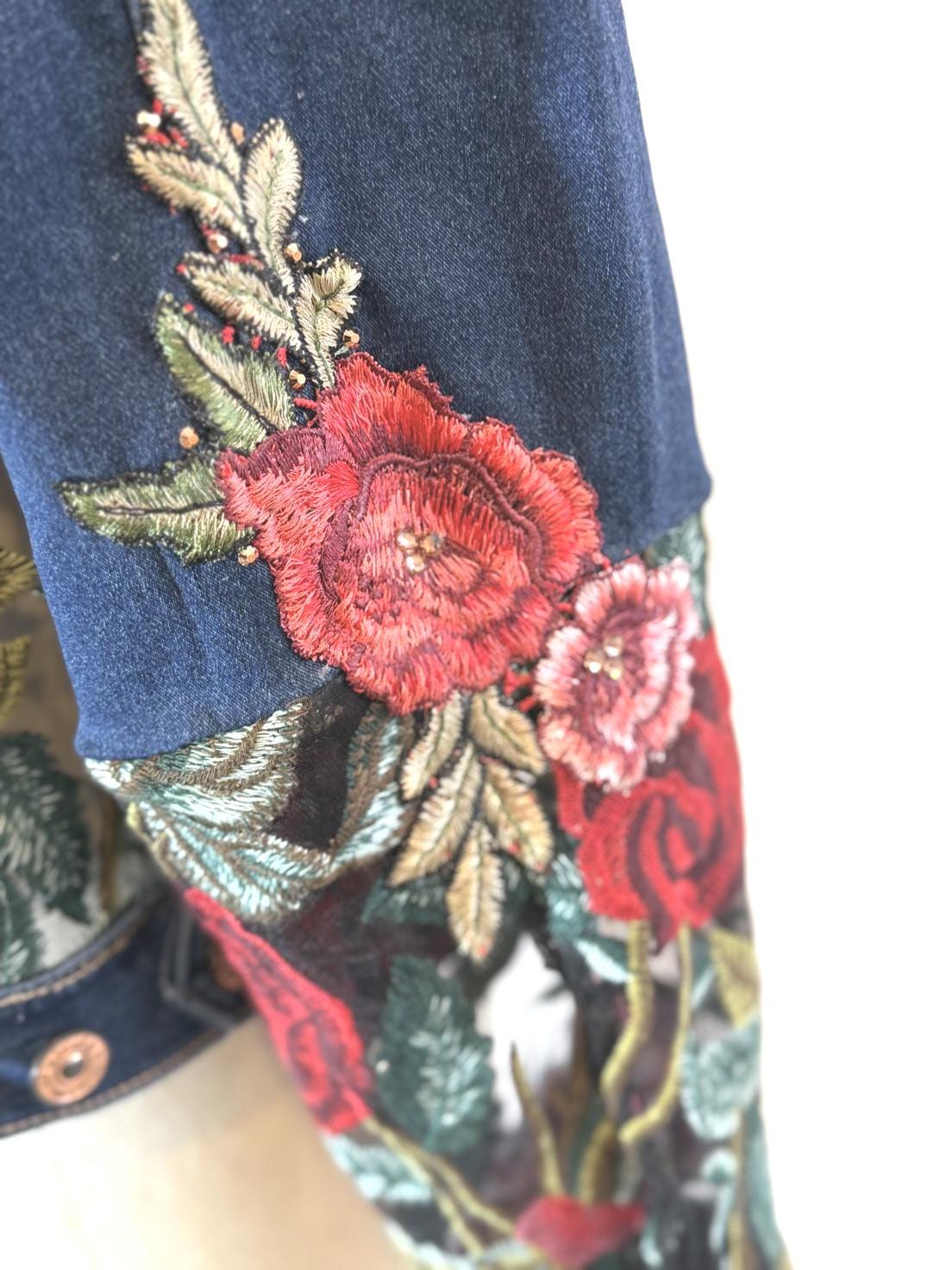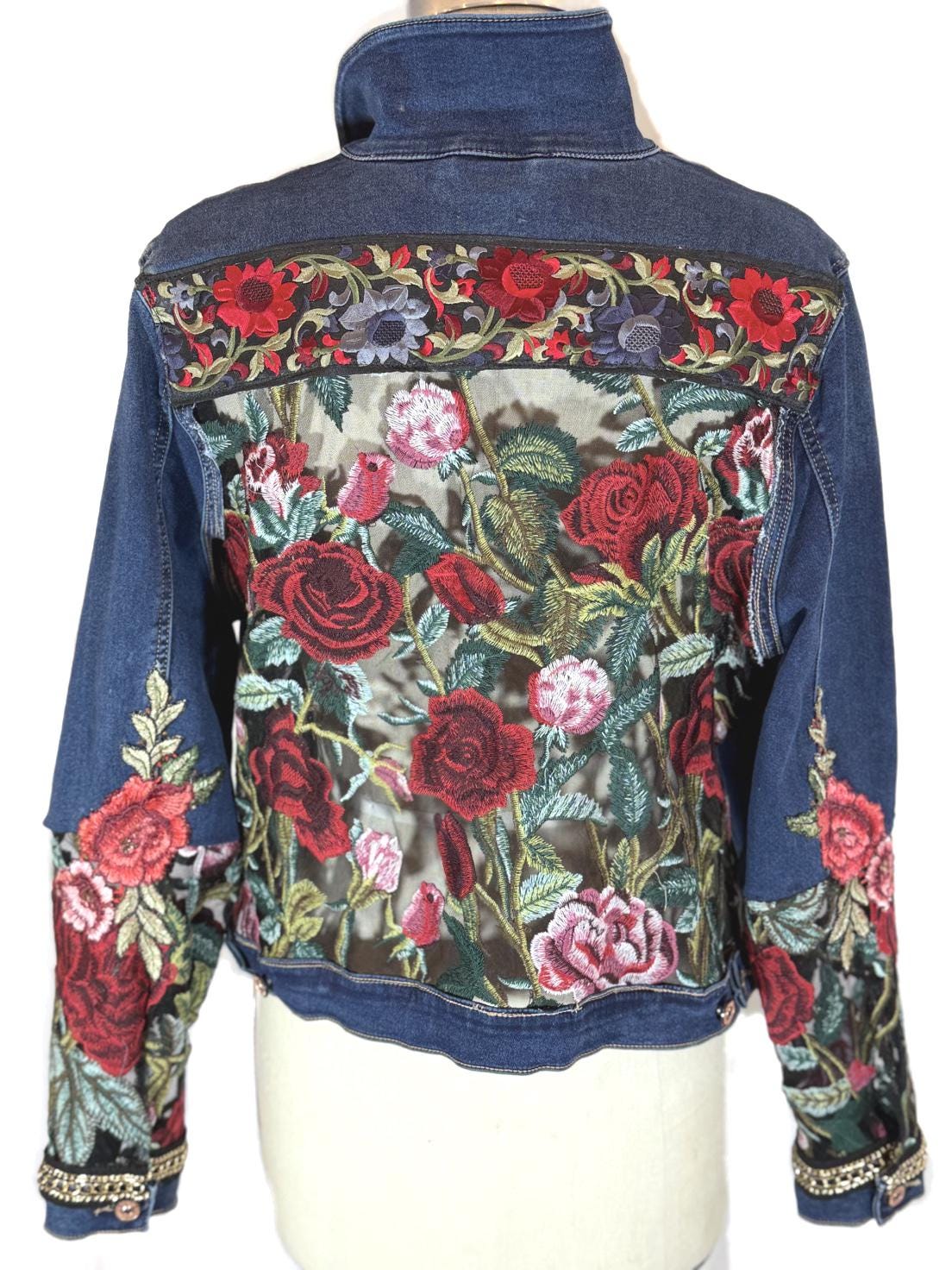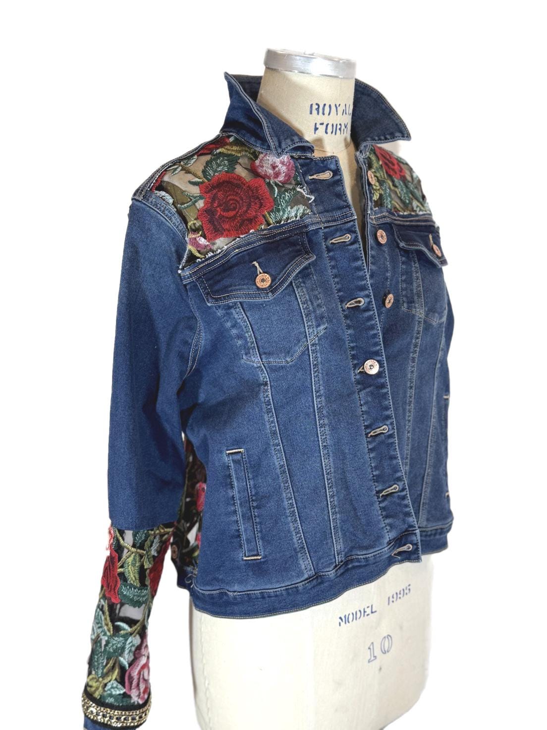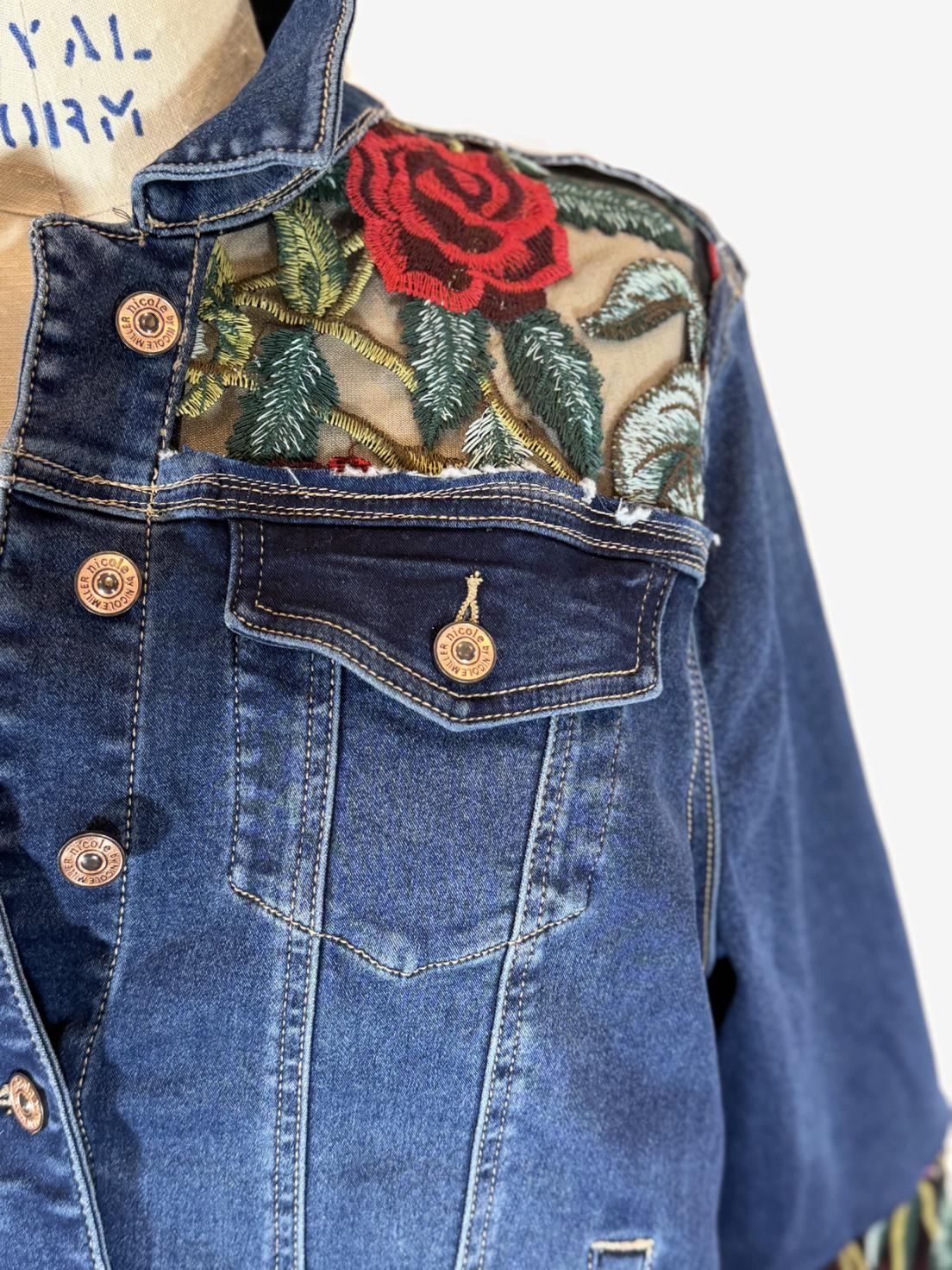 Upcycled Denim Jacket with Sheer Floral Embroidered Sleeves, Rose Detail Statement Piece