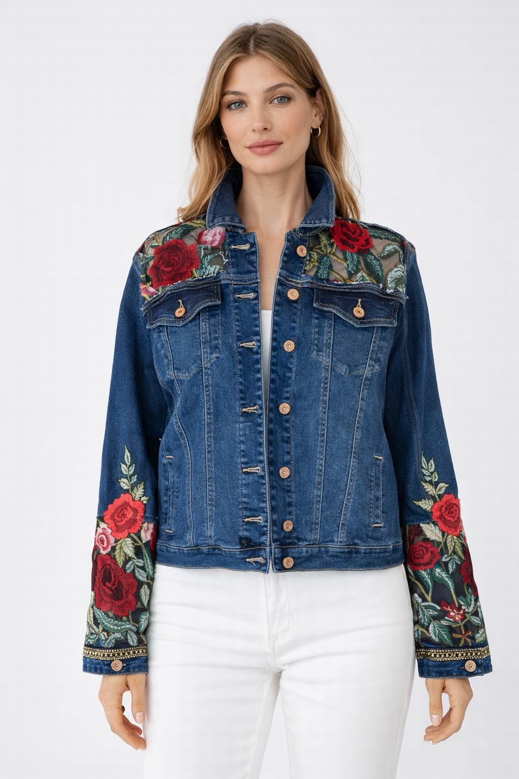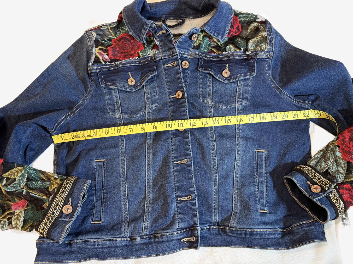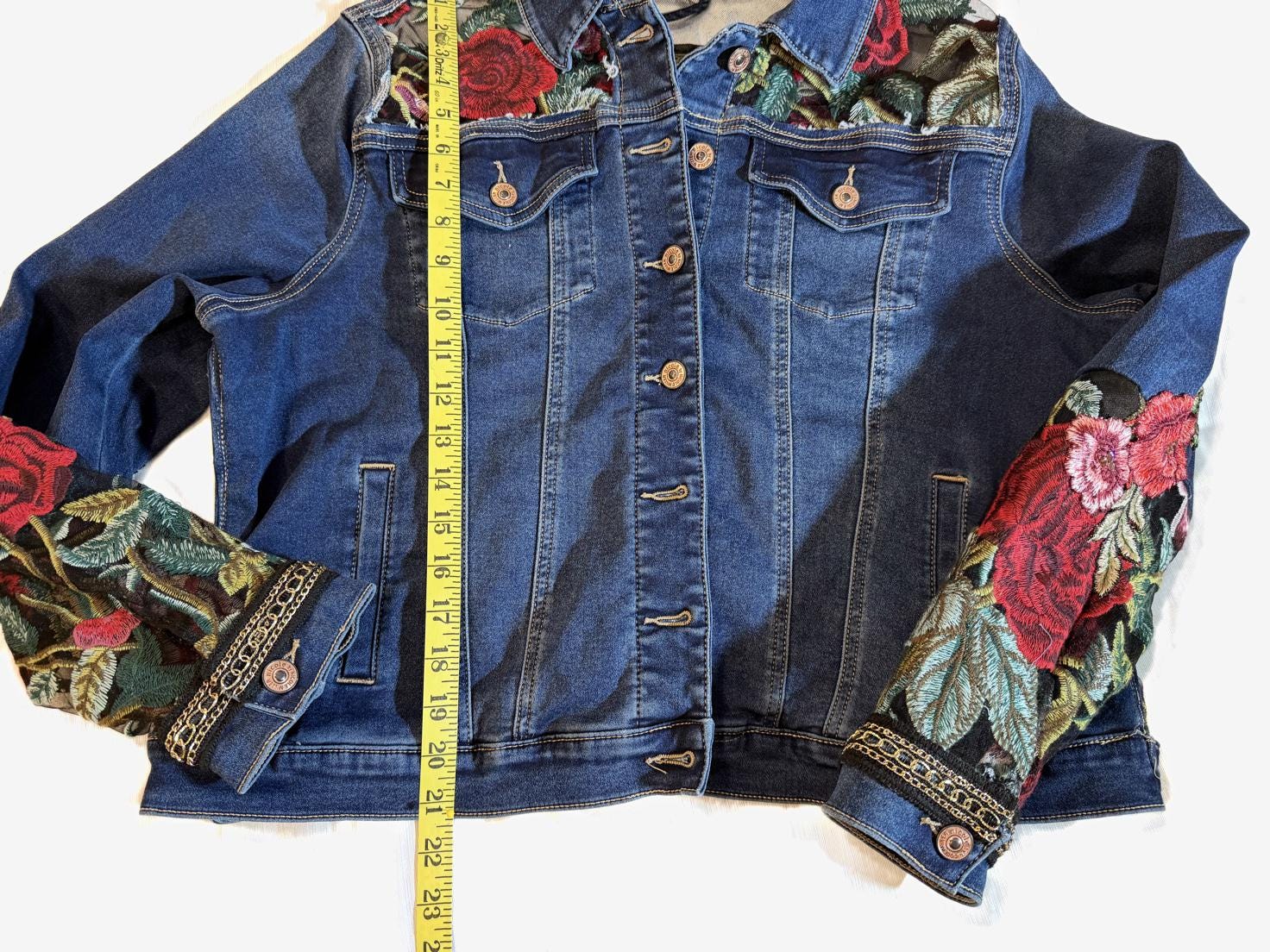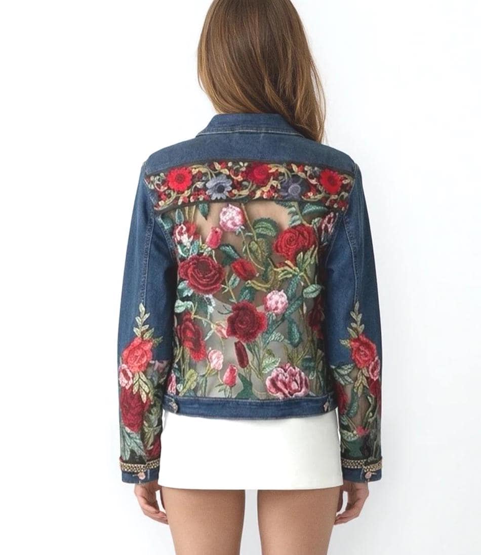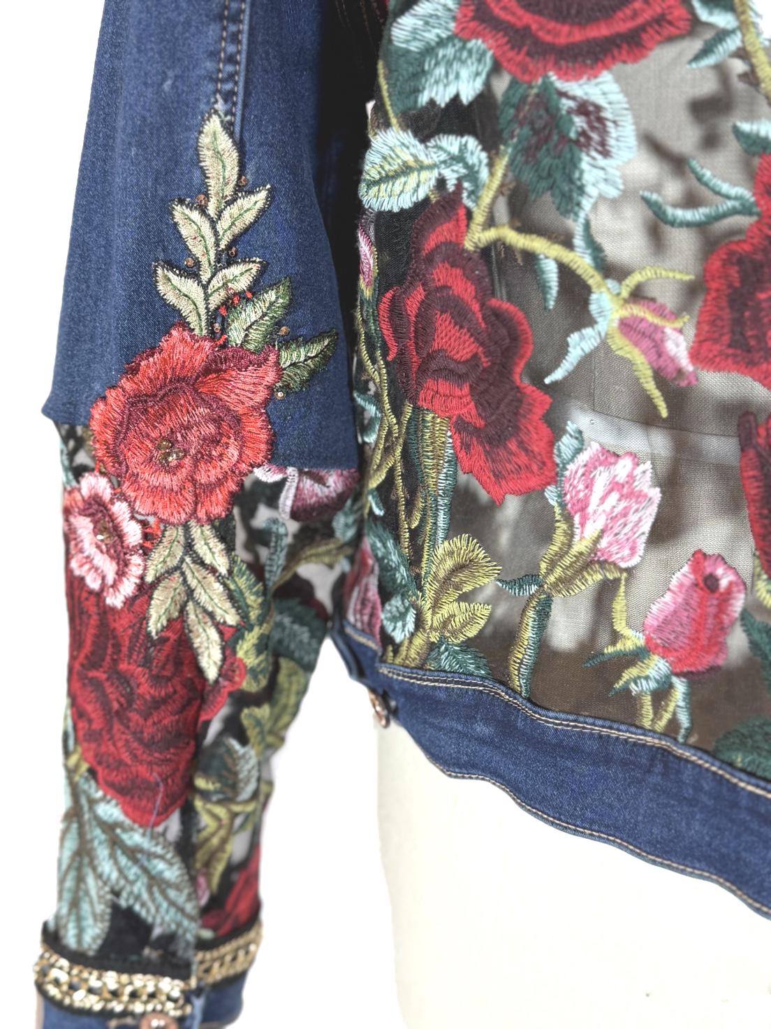 Upcycled Denim Jacket with Sheer Floral Embroidered Sleeves, Rose Detail Statement Piece