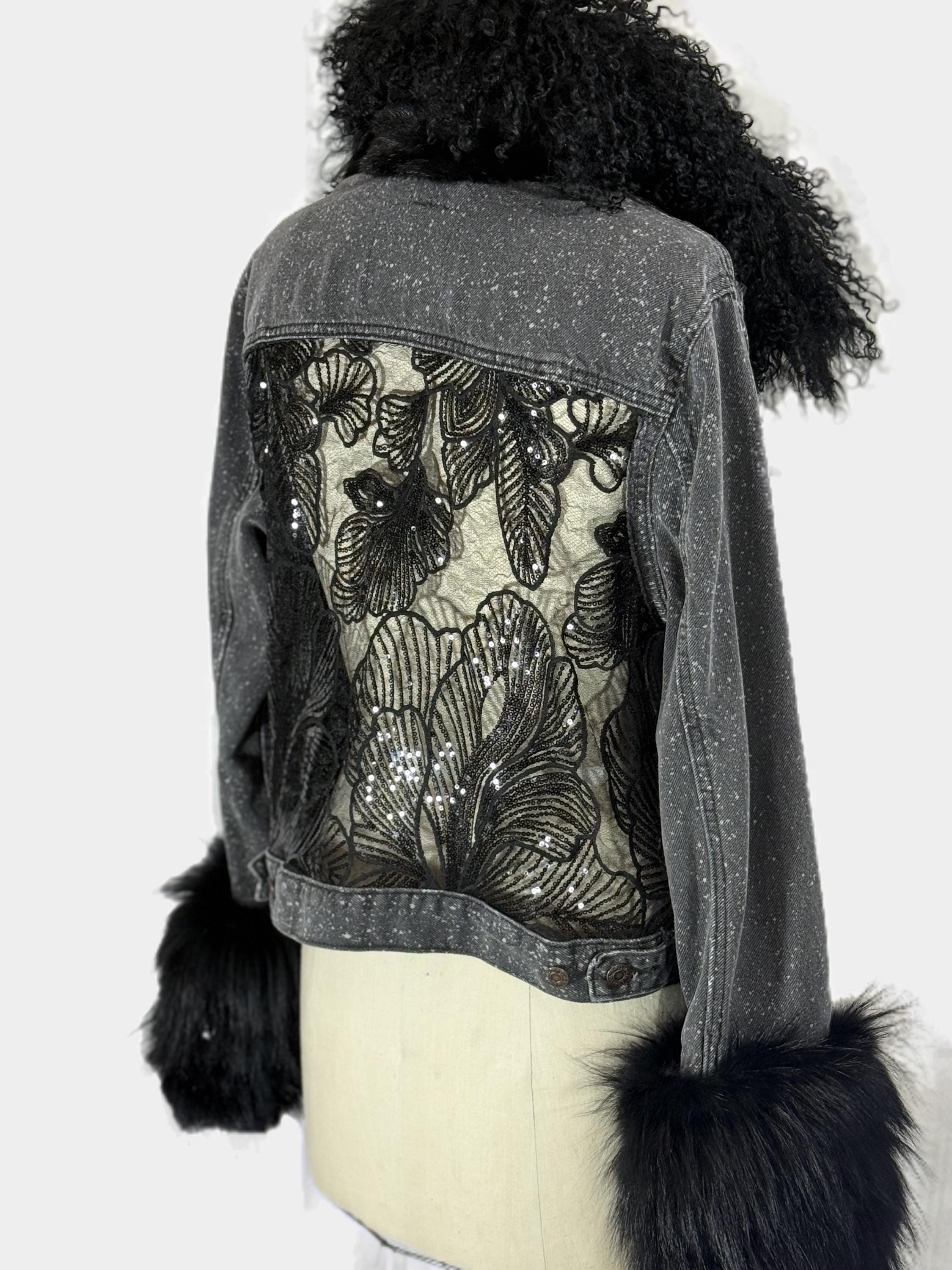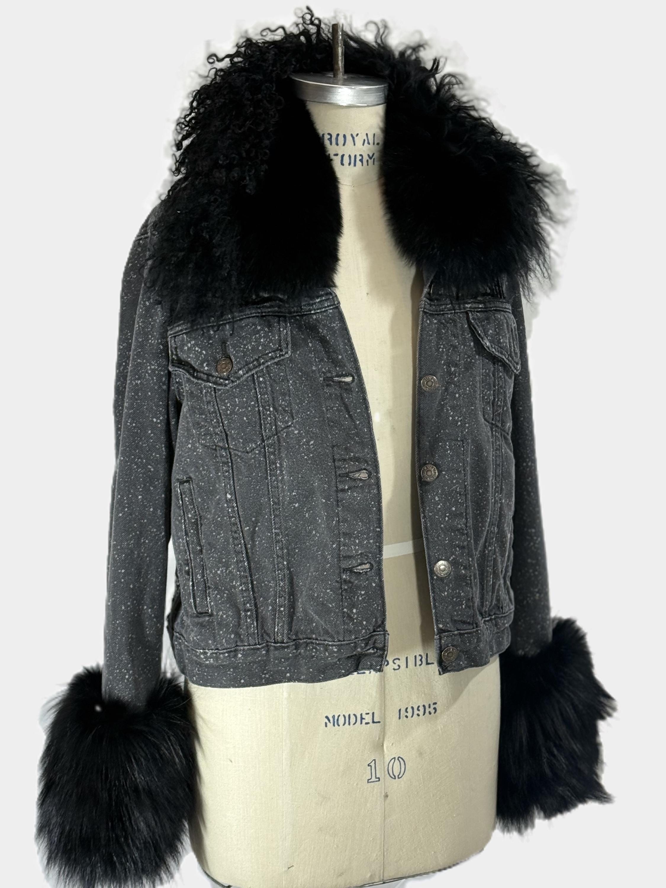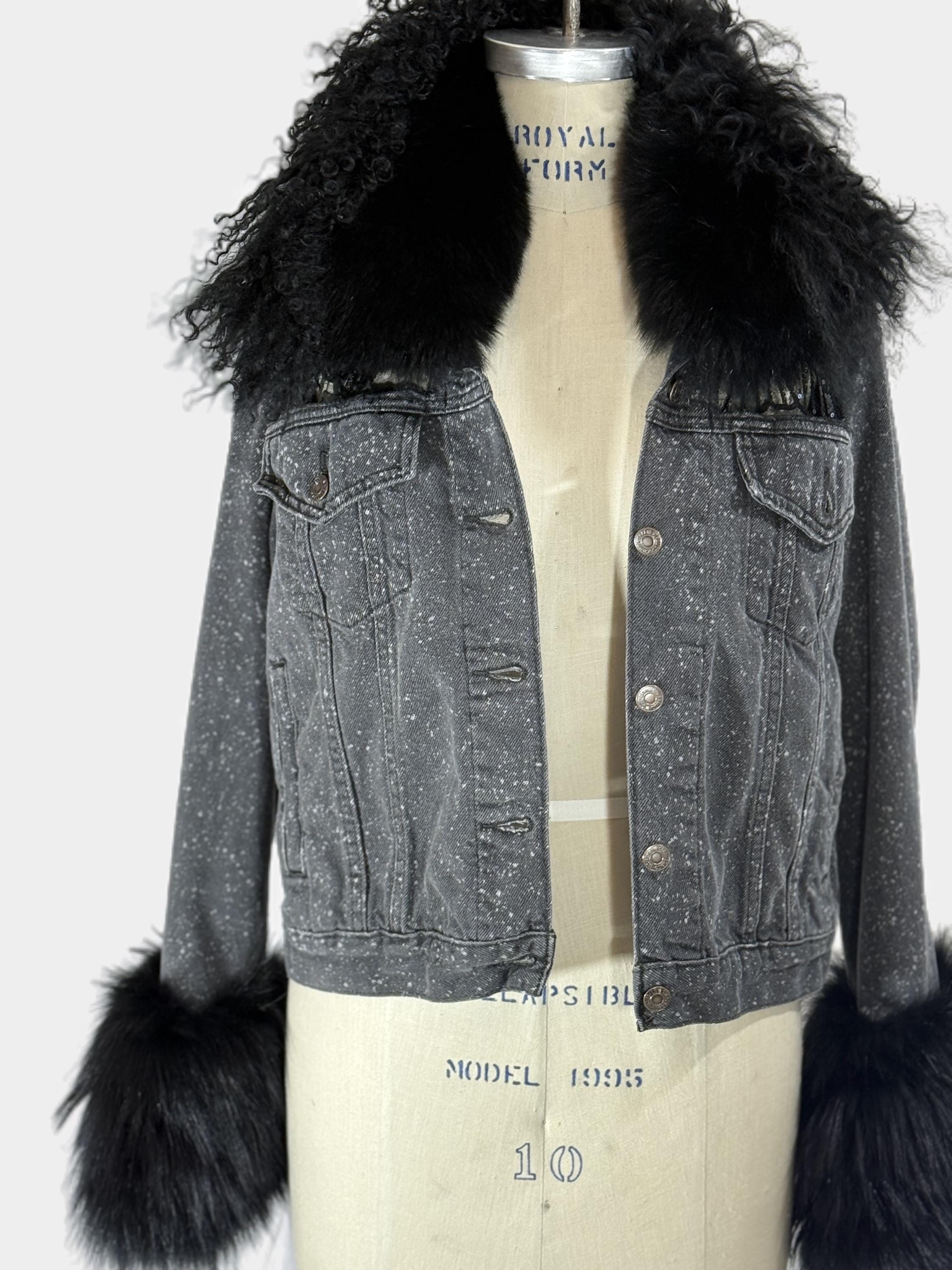 Up cycled Jeans jacket with back mesh insert, Unique Statement piece, Reworked denim jacket with fox collar
