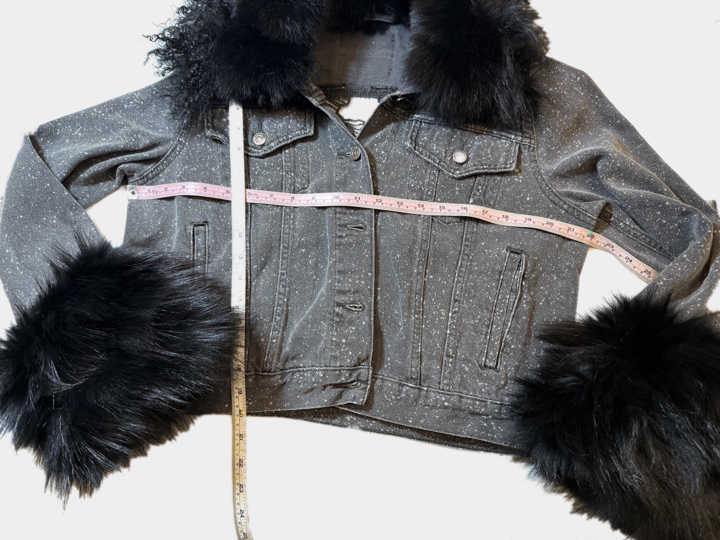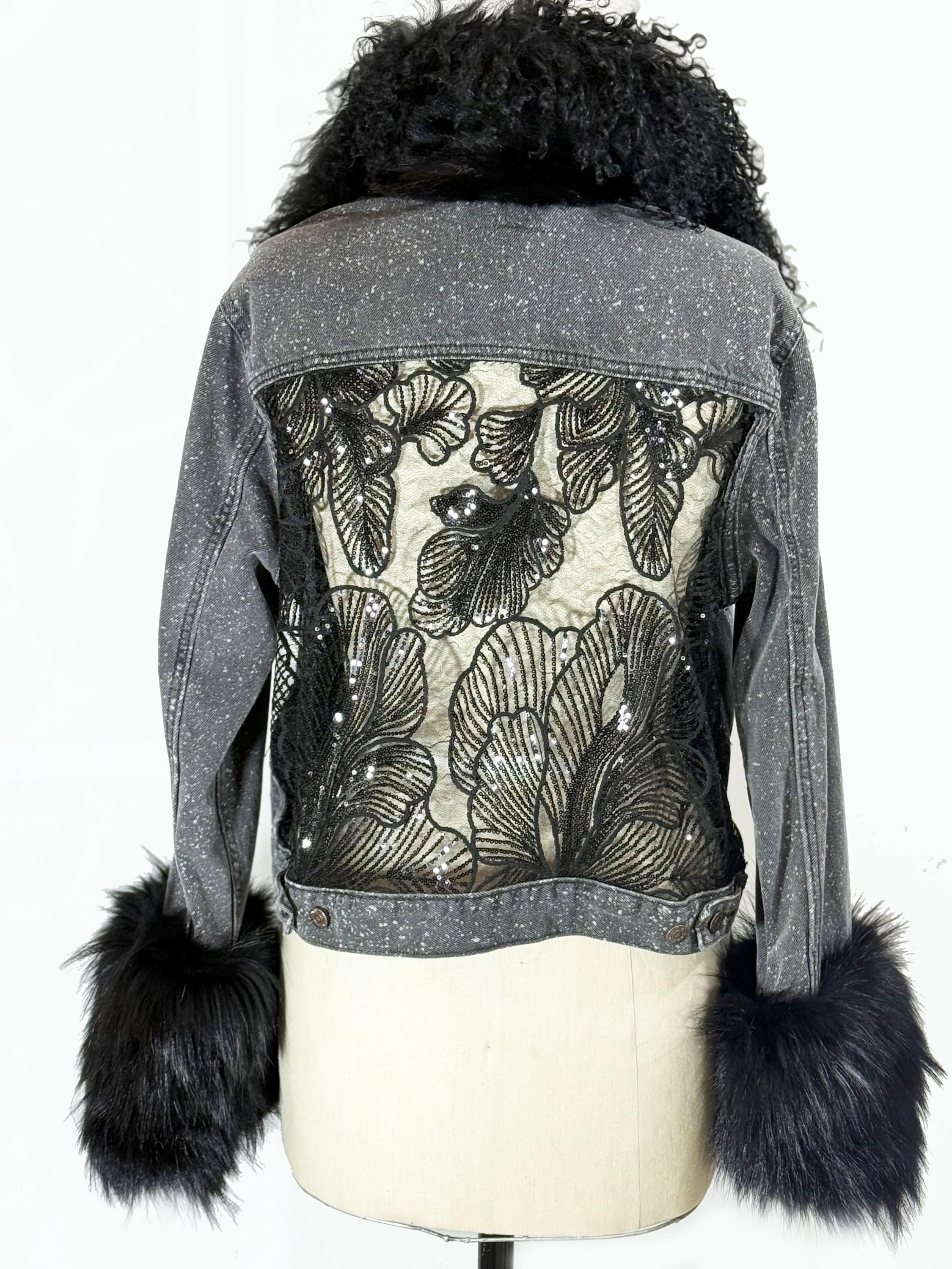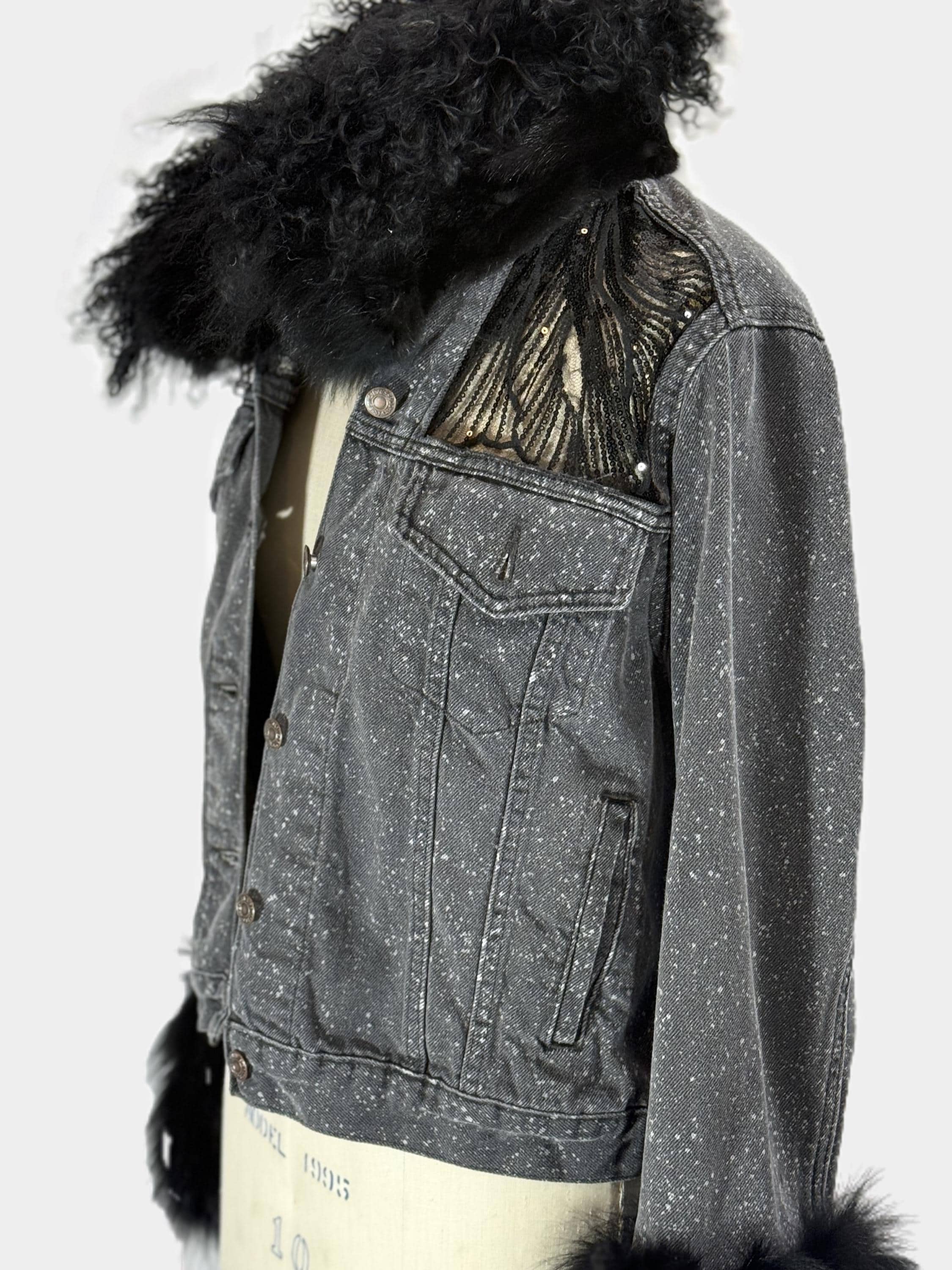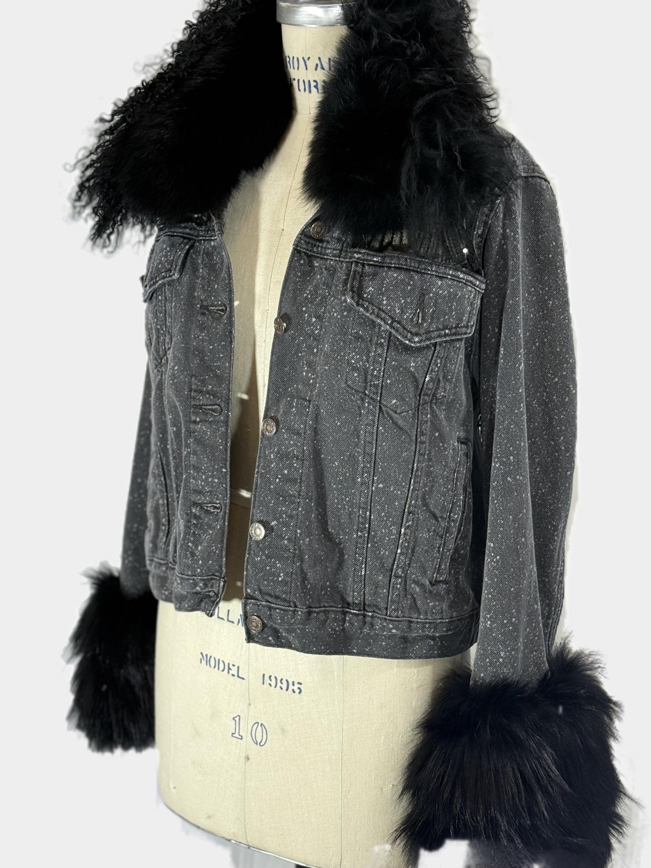 Up cycled Jeans jacket with back mesh insert, Unique Statement piece, Reworked denim jacket with fox collar