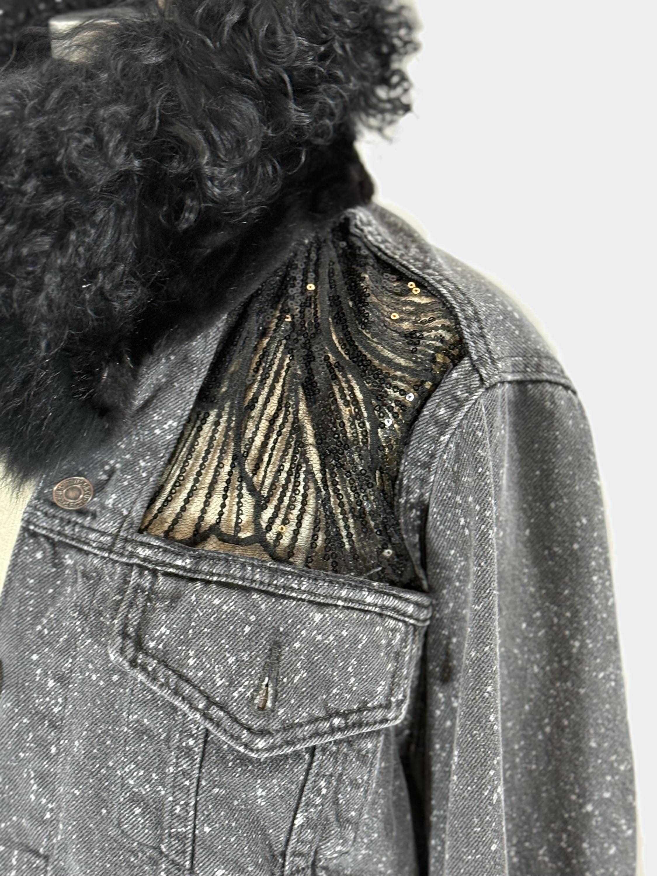 * One of a kind Up cycled dark grey denim with white speckled is meticulously crafted to stand out as a statement piece