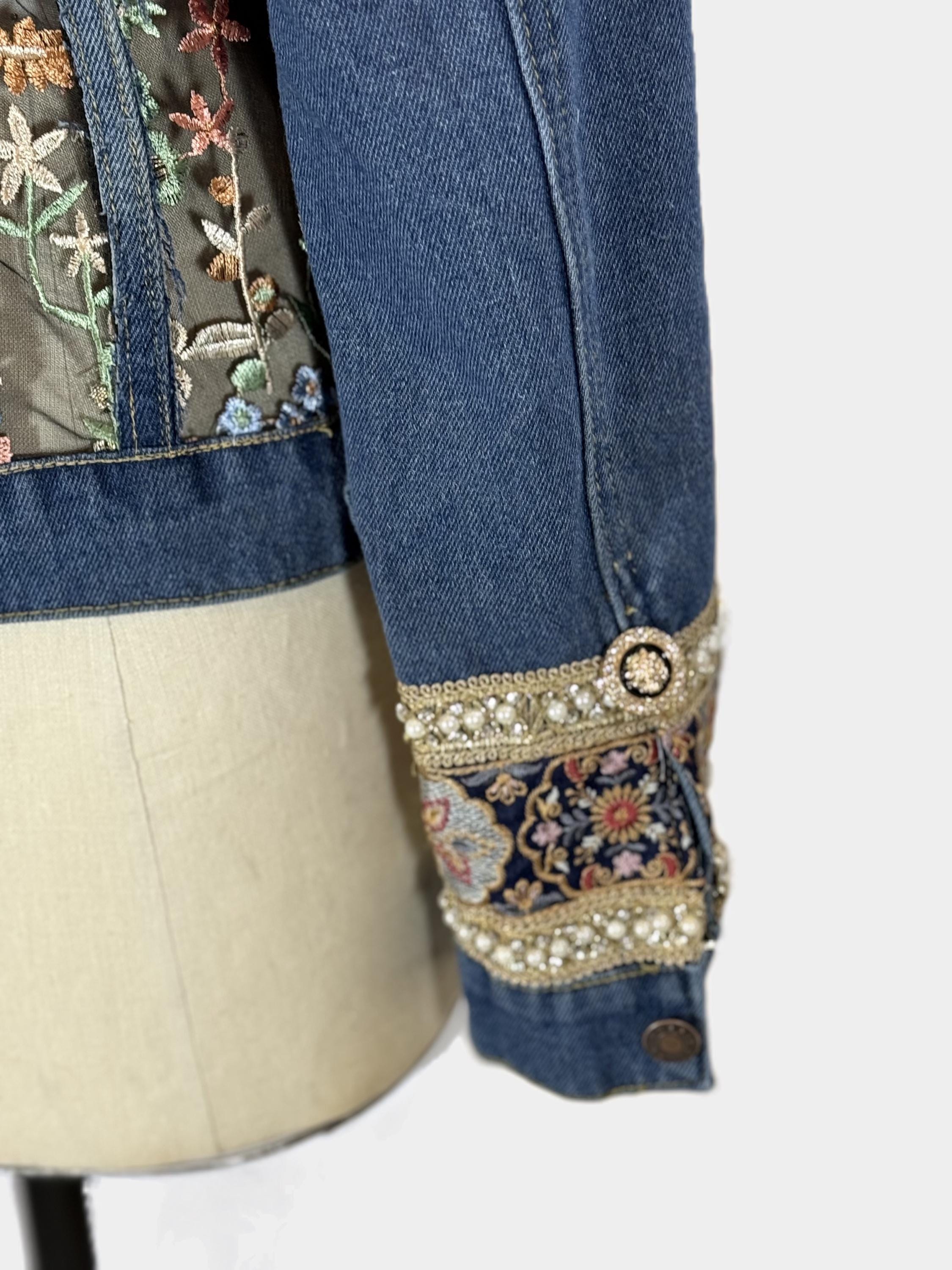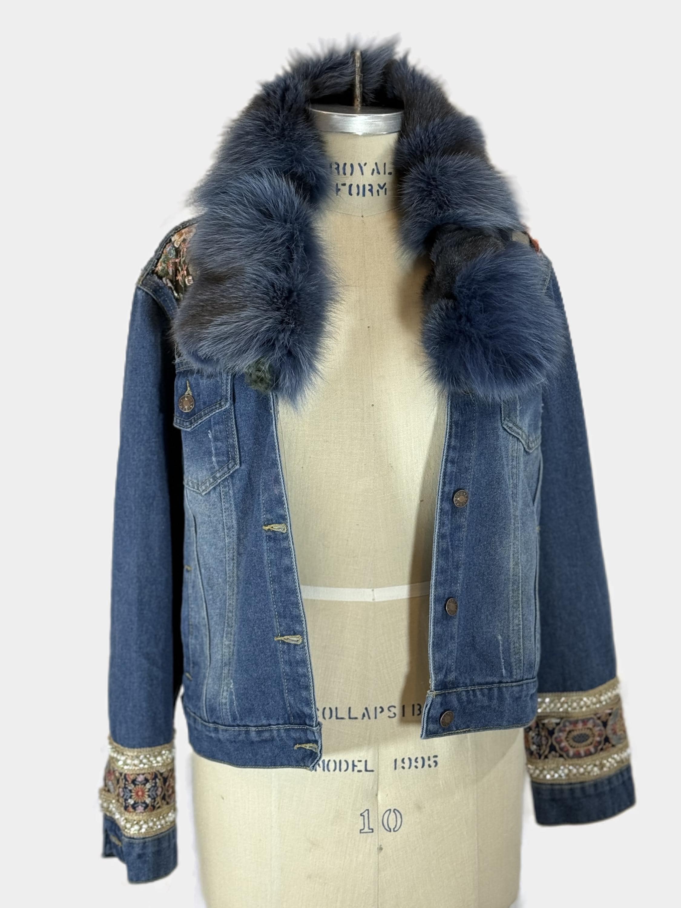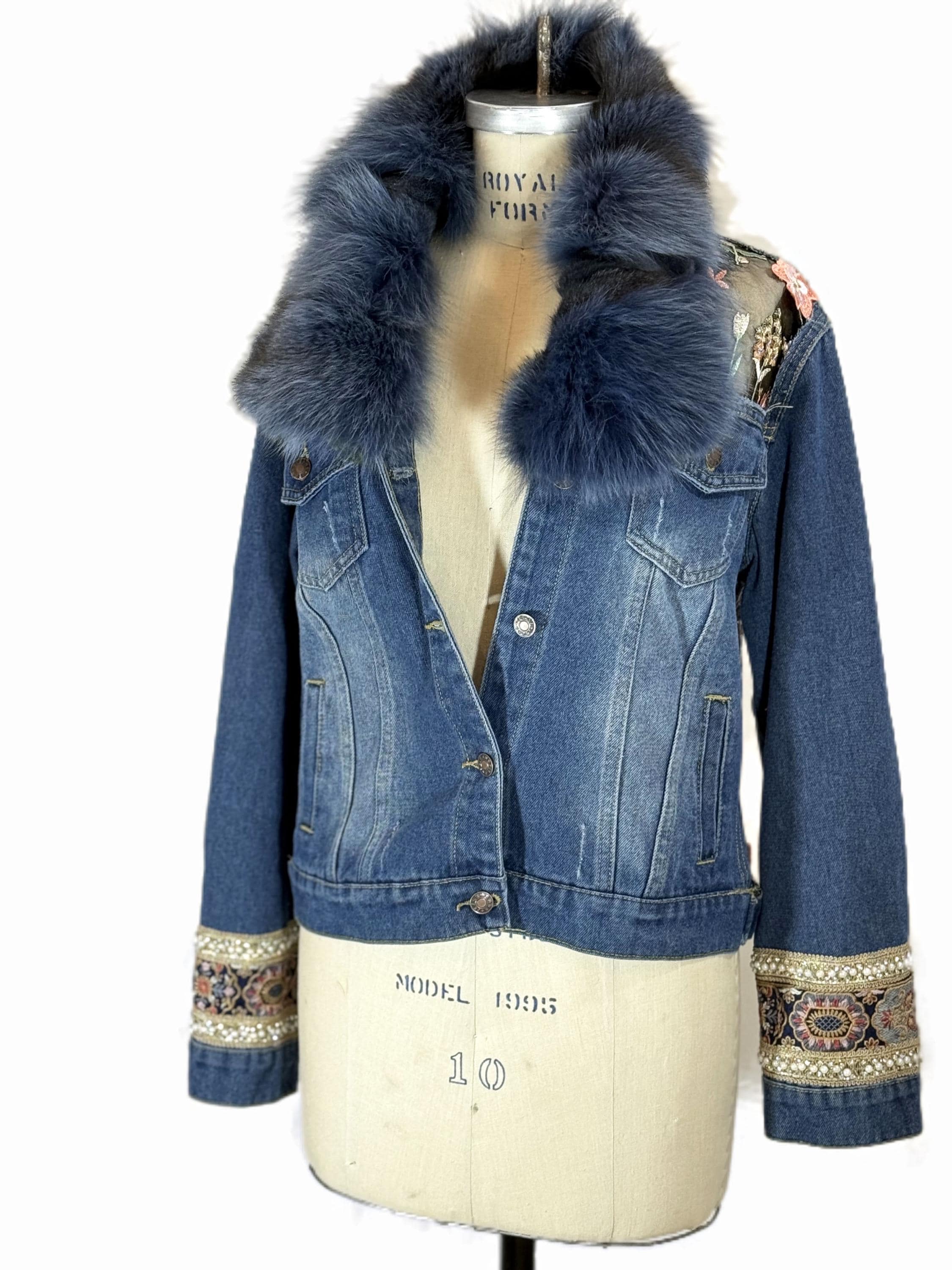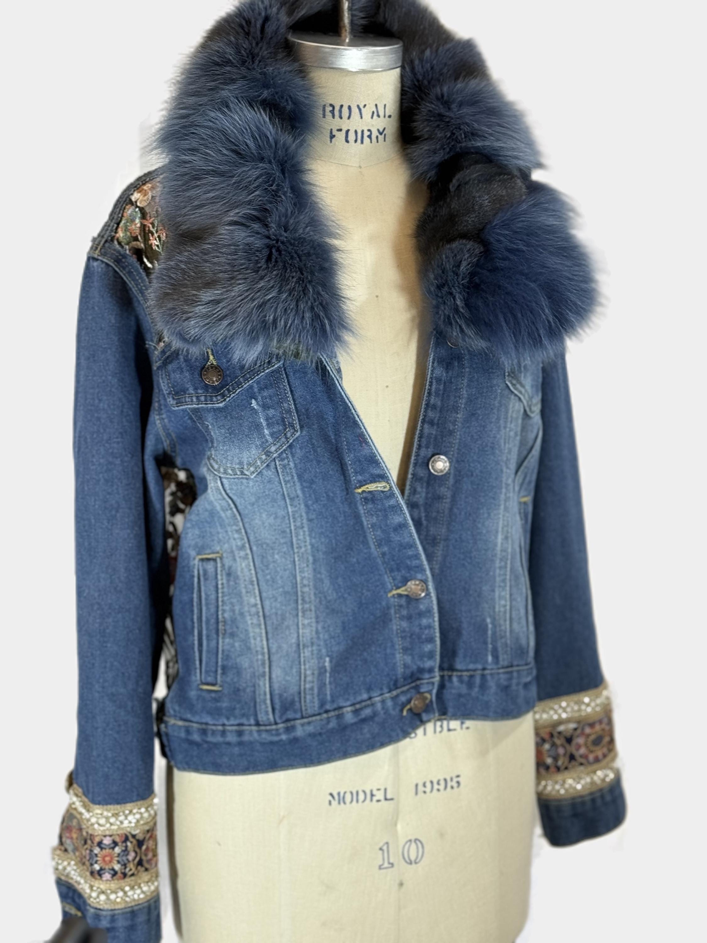 This Reworked denim jacket is a unique and stylish statement piece that combines sustainability with artistic flair. This one-of-a-kind jacket features a luxurious blue colored fox fur collar and embellished cuff.
