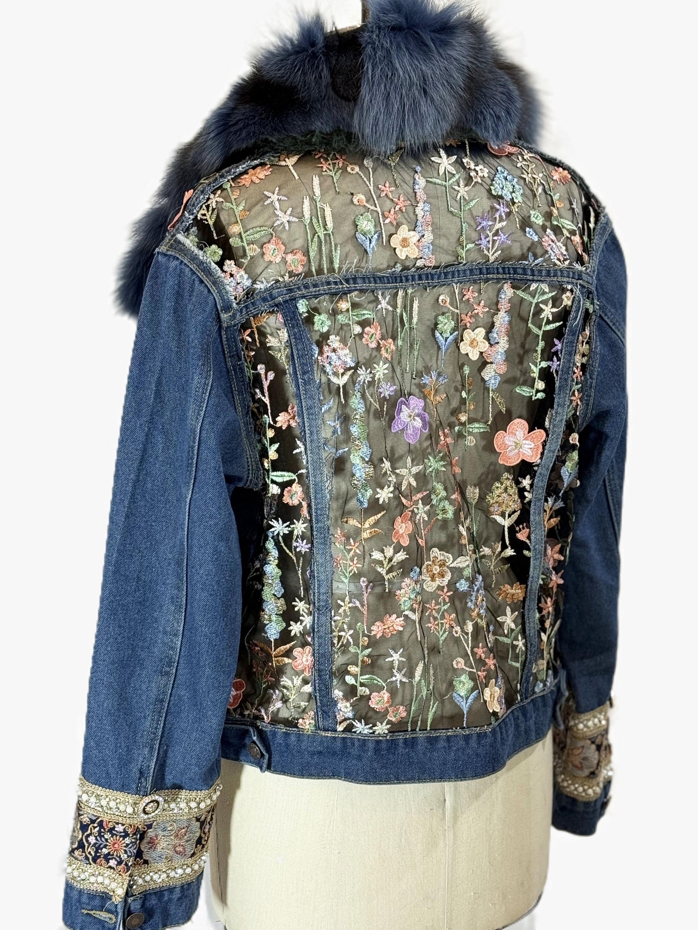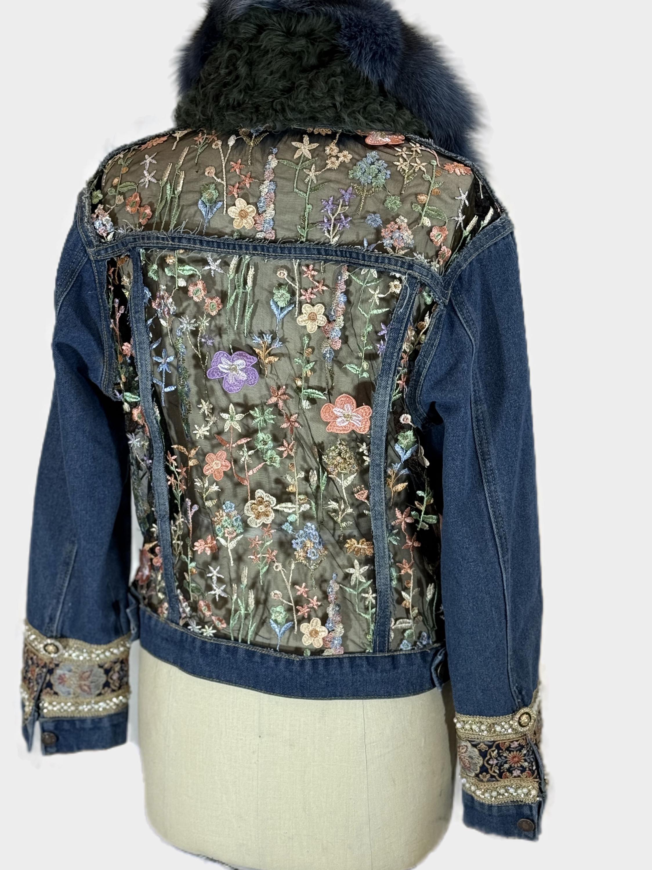 Up cycled Denim Jacket with Blue Fox Fur Collar and Lace inserts, Reworked denim jacket with embellished cuff
