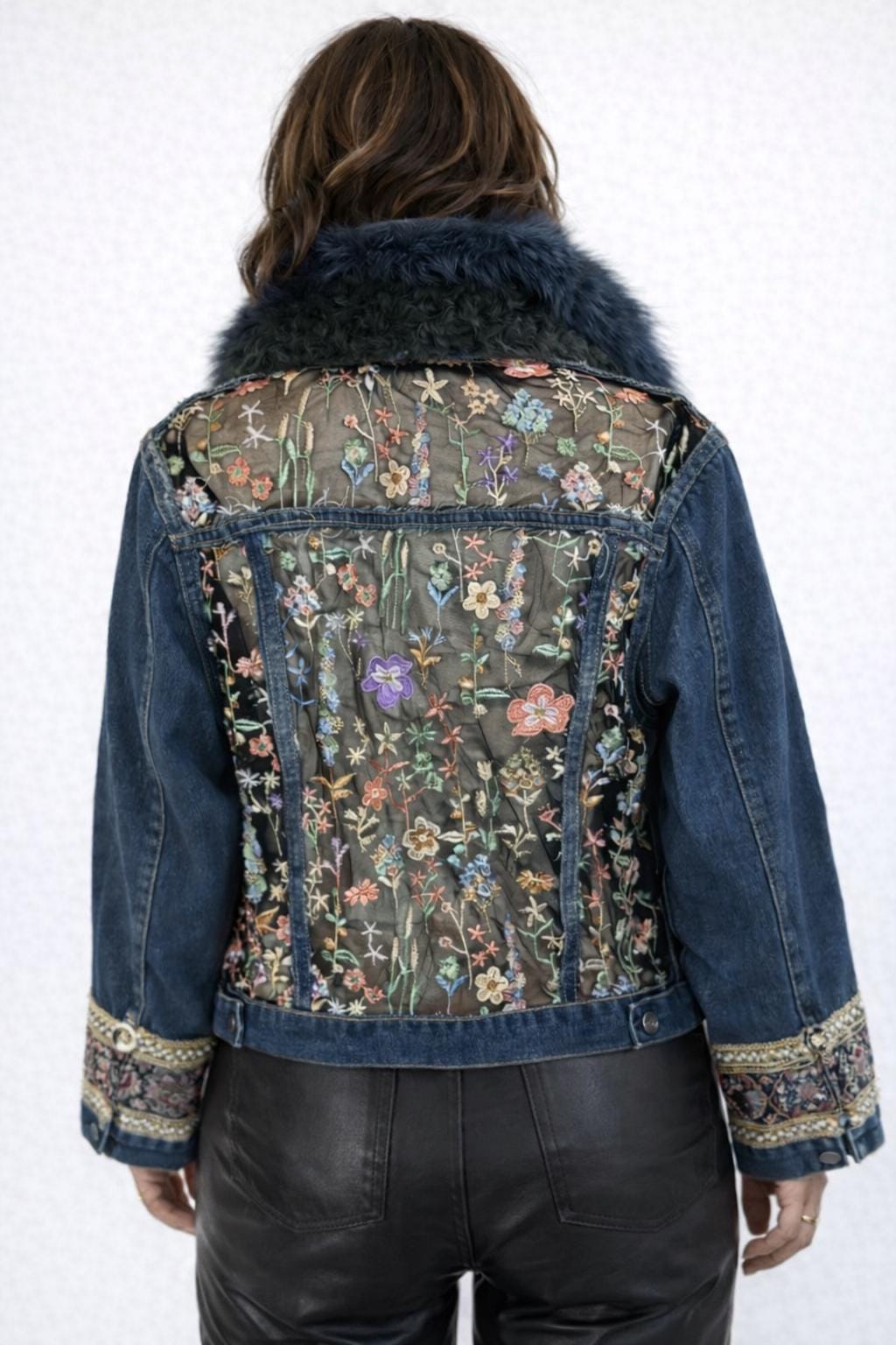 This Reworked denim jacket is a unique and stylish statement piece that combines sustainability with artistic flair. This one-of-a-kind jacket features a luxurious blue colored fox fur collar and embellished cuff.