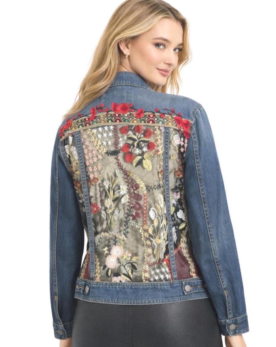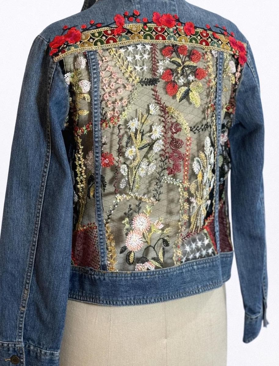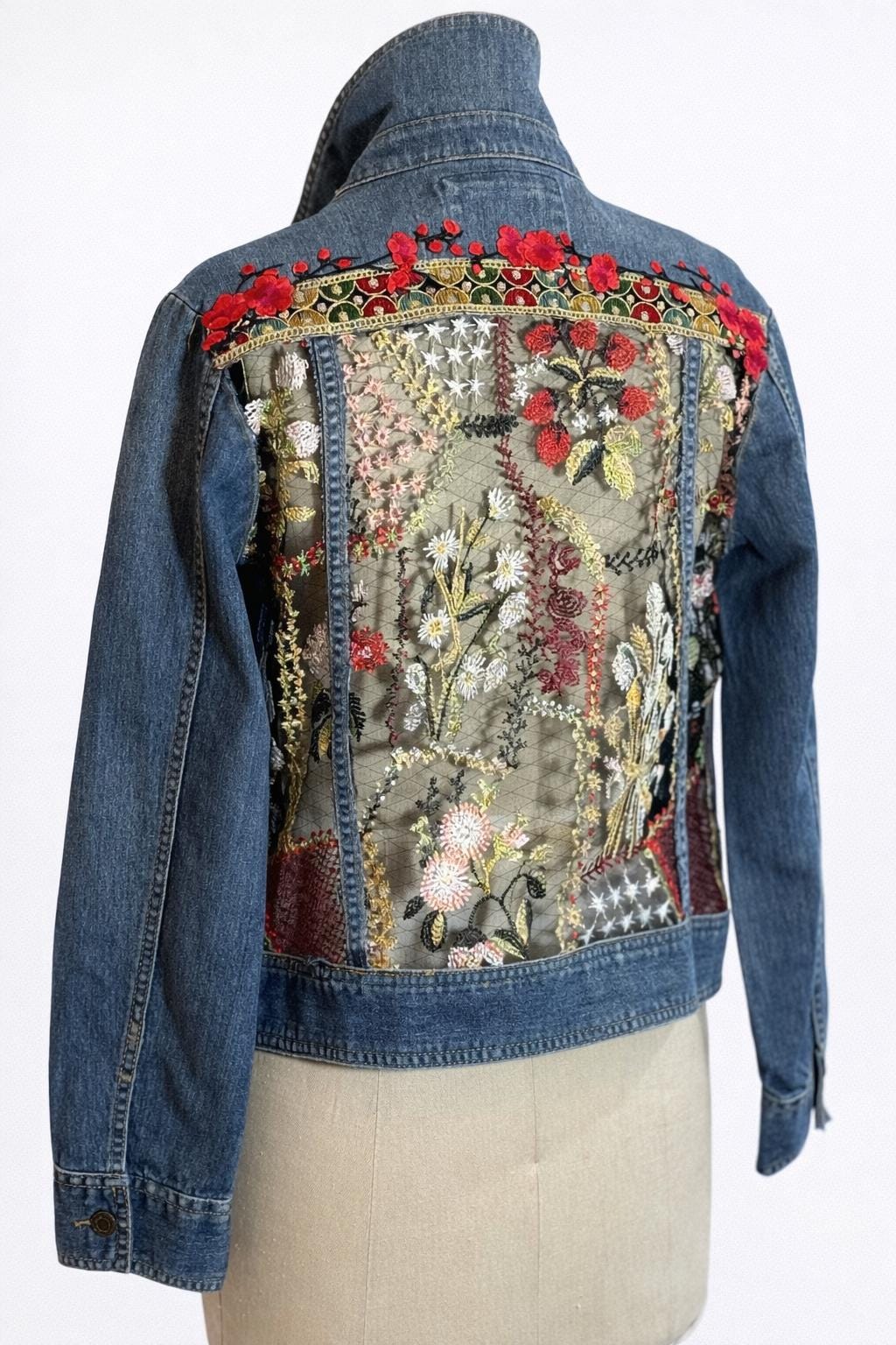 Boho Vibrant Sheer Patchwork Embroidered Denim Jacket with Embellished Sleeves