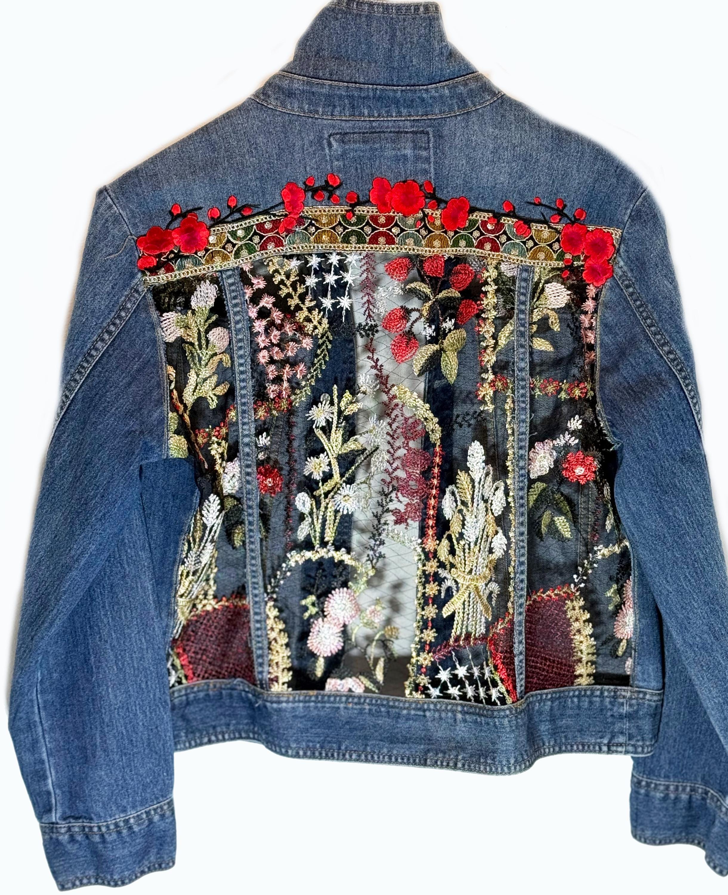 This vibrant up cycled blue chic denim jacket, a perfect blend of vintage charm and contemporary flair. This standout piece features a beautiful sheer patchwork motif insert on the back and front.