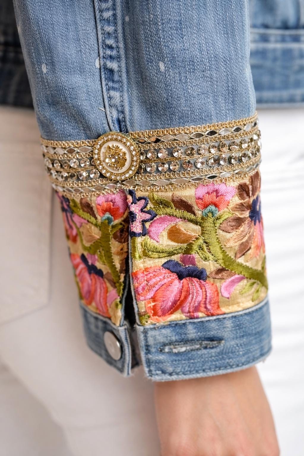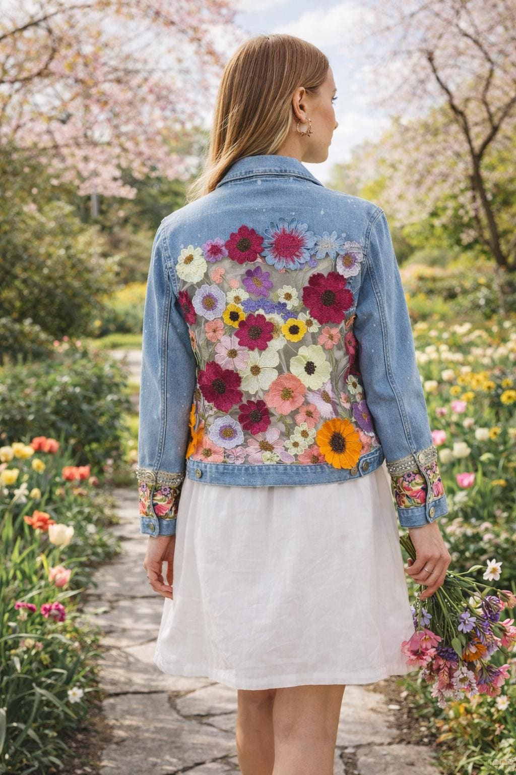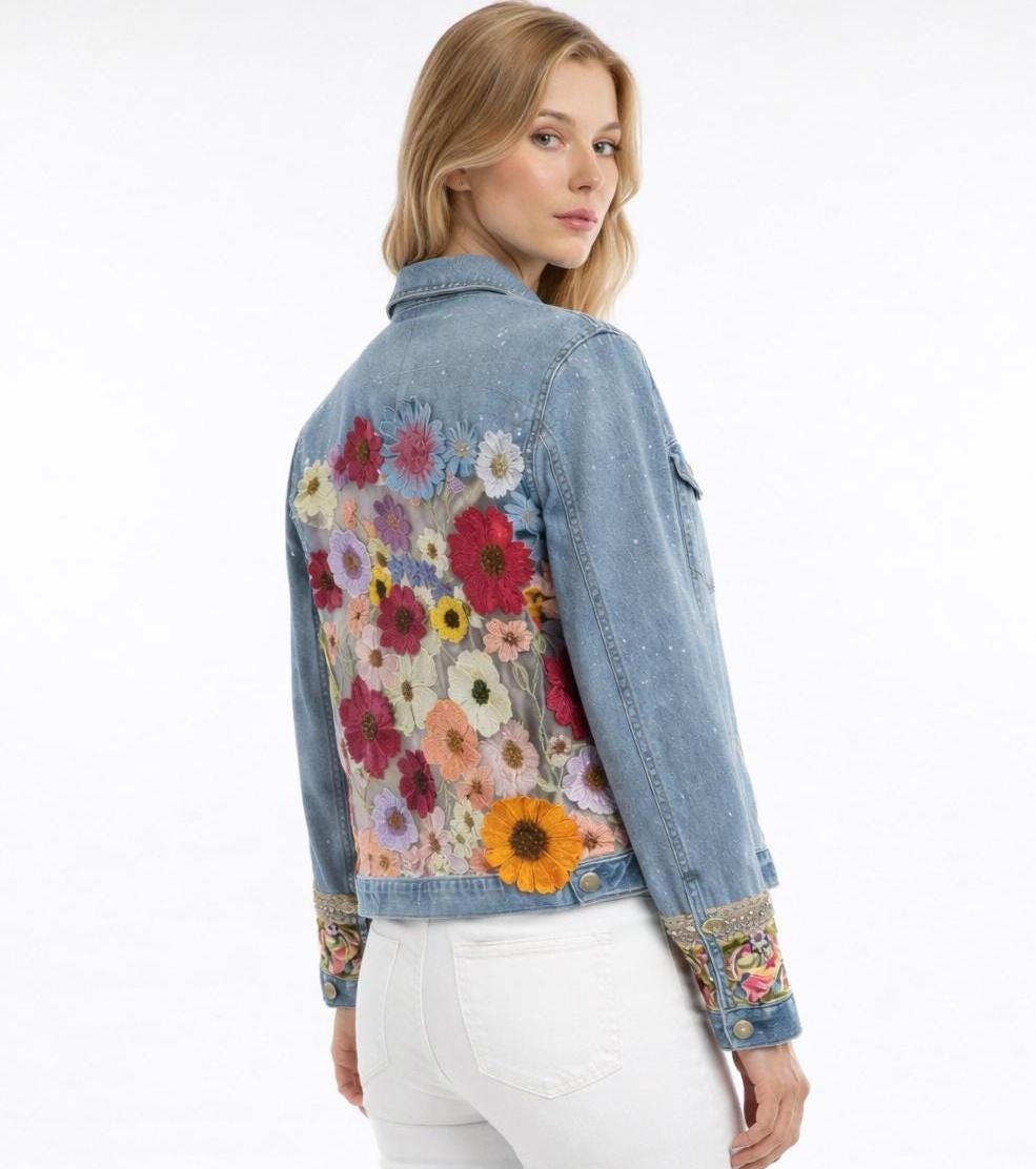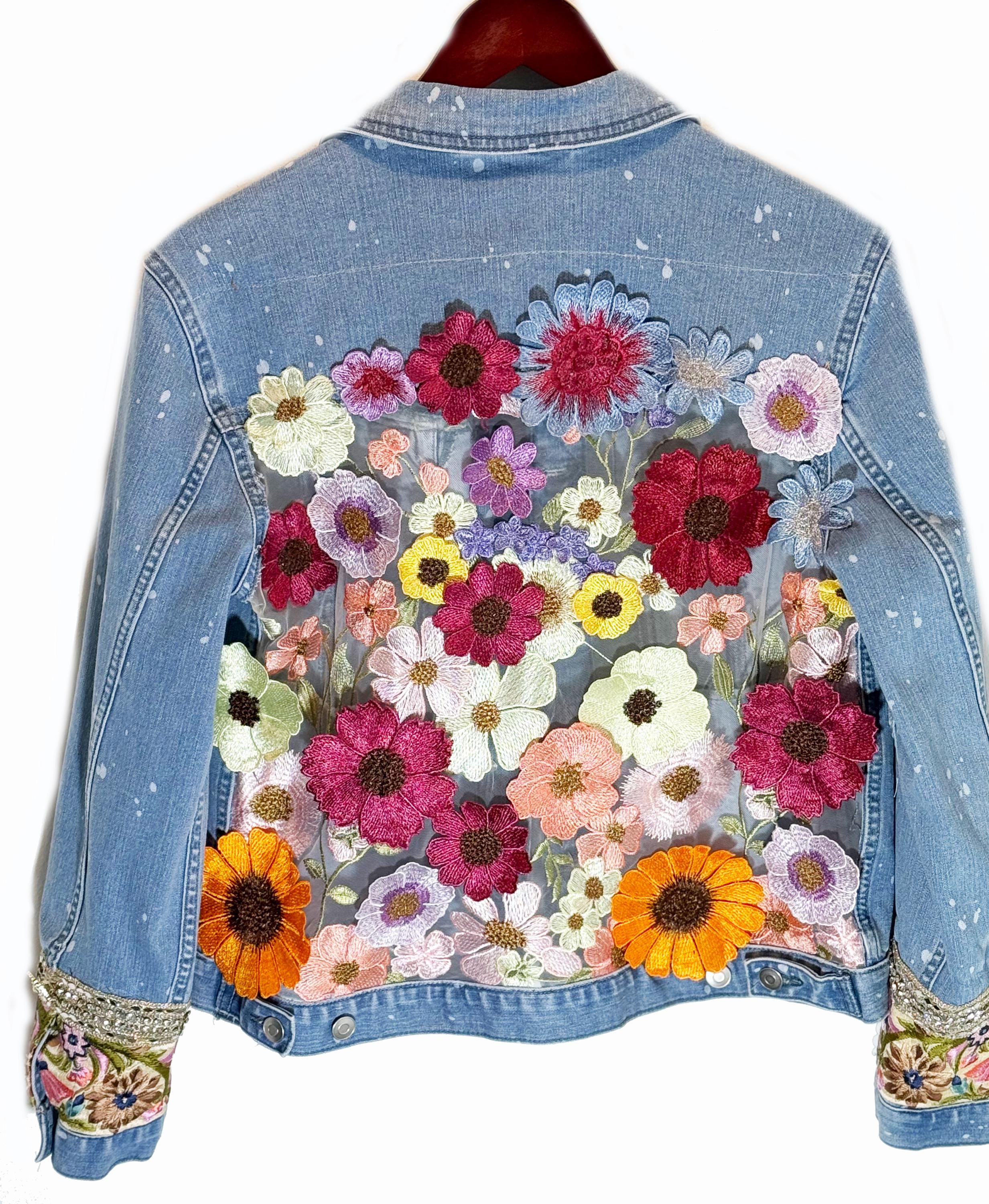 This handmade, upcycled denim jacket features a stunning sheer mesh back adorned with vibrant floral embroidery for a true statement look. Crafted from light-wash denim, it blends boho charm with modern femininity, making it perfect for layering in spring and summer. Each jacket is one of a kind, designed for the woman who loves unique, sustainable fashion.