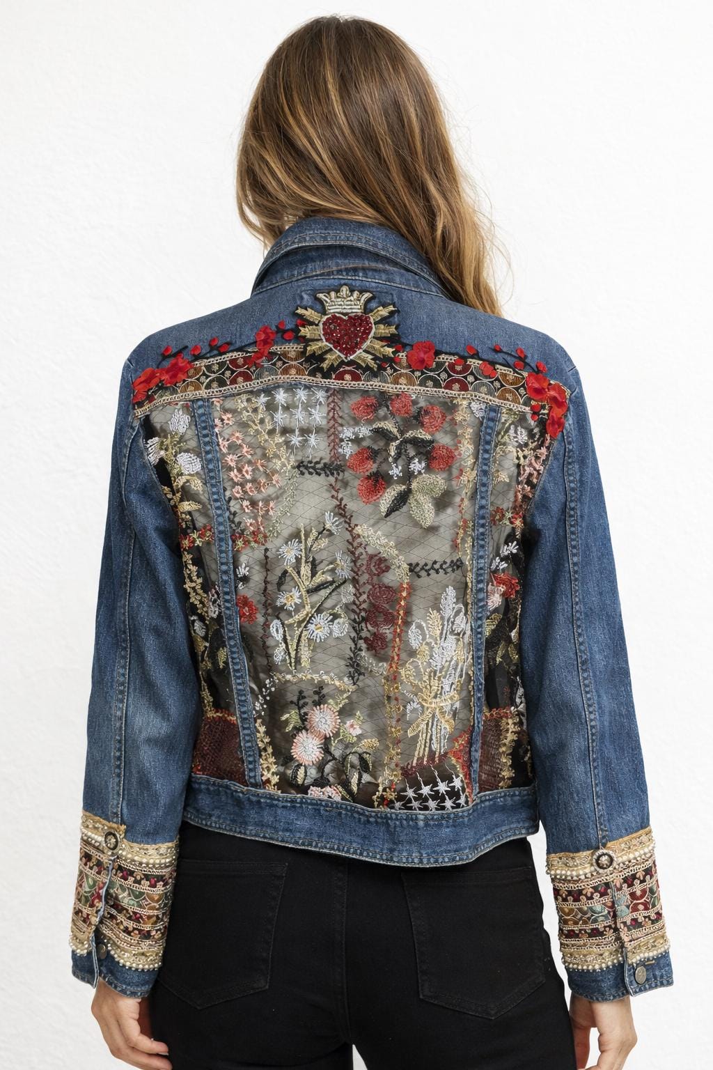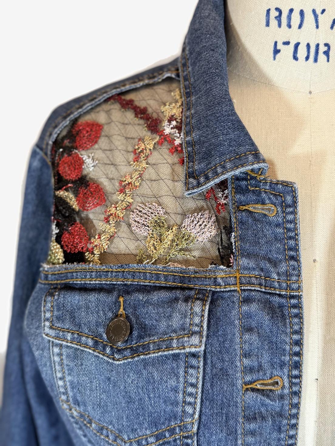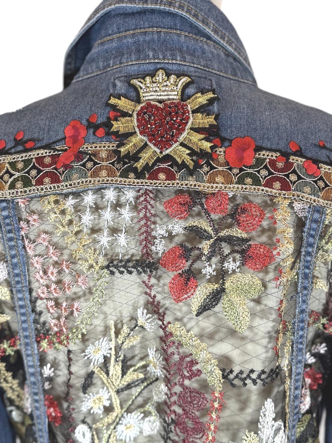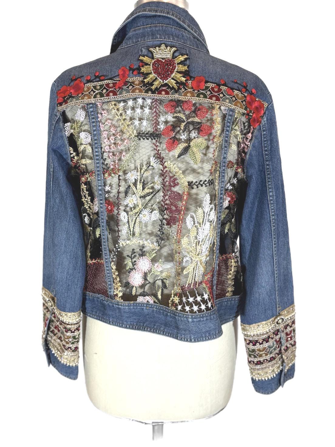 Upcycled Denim Jacket, Embroidered Sheer Back, Sacred Heart Detail, Boho Luxe Statement Wear