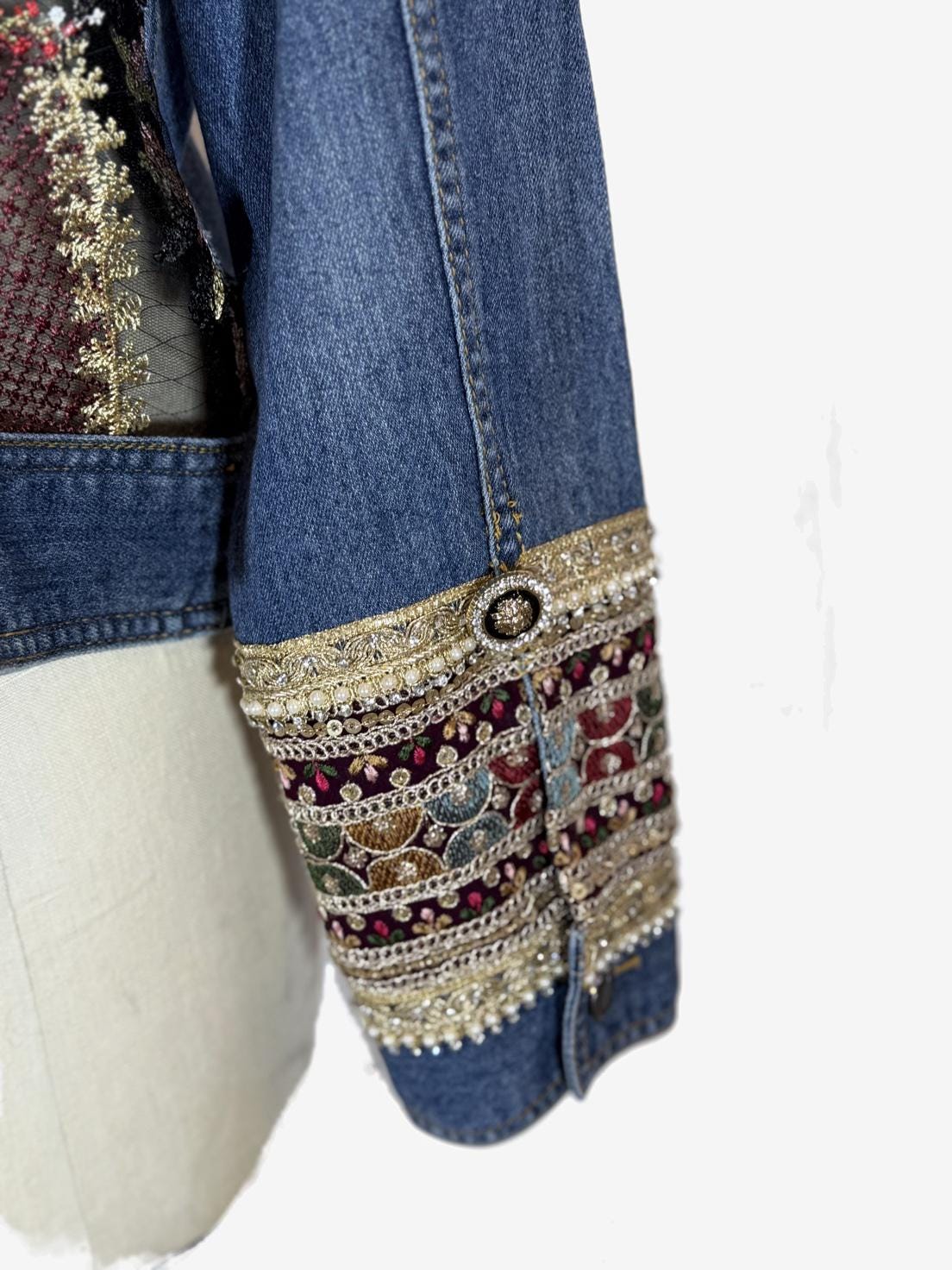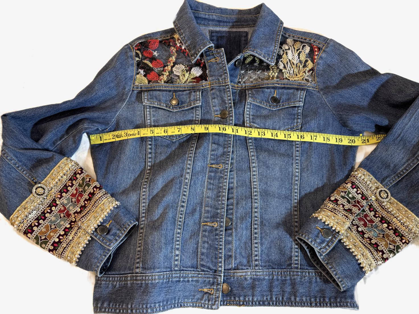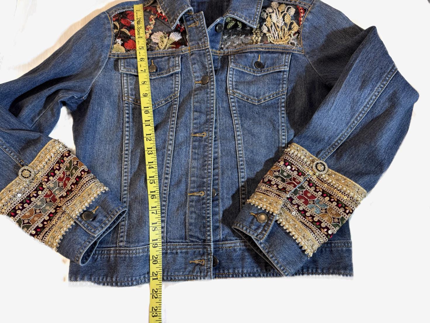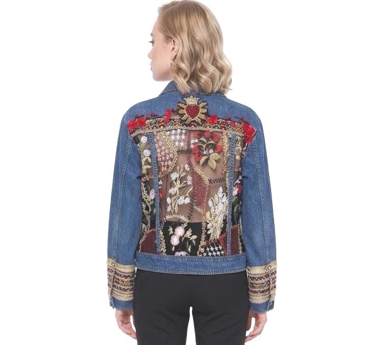 Upcycled Denim Jacket, Embroidered Sheer Back, Sacred Heart Detail, Boho Luxe Statement Wear