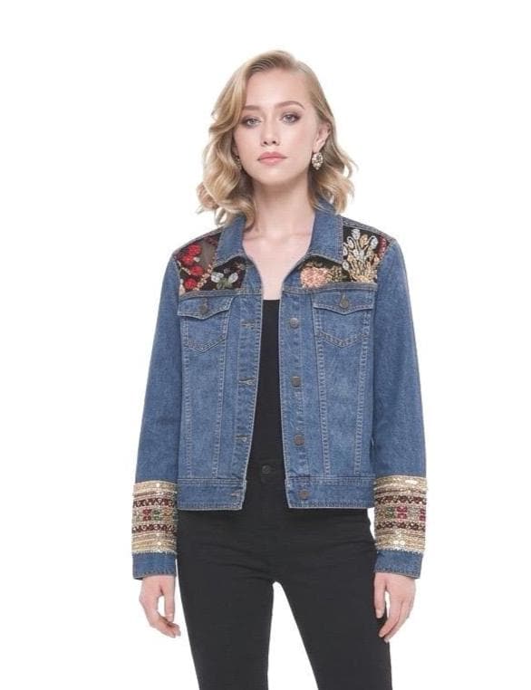 One-of-a-kind upcycled denim jacket featuring a sheer embroidered back with intricate patchwork detailing and a striking sacred heart accent. Richly embellished sleeves add texture and a luxe boho feel that makes this piece truly stand out. Perfect for festival styling or elevating everyday looks with an artistic, statement edge.