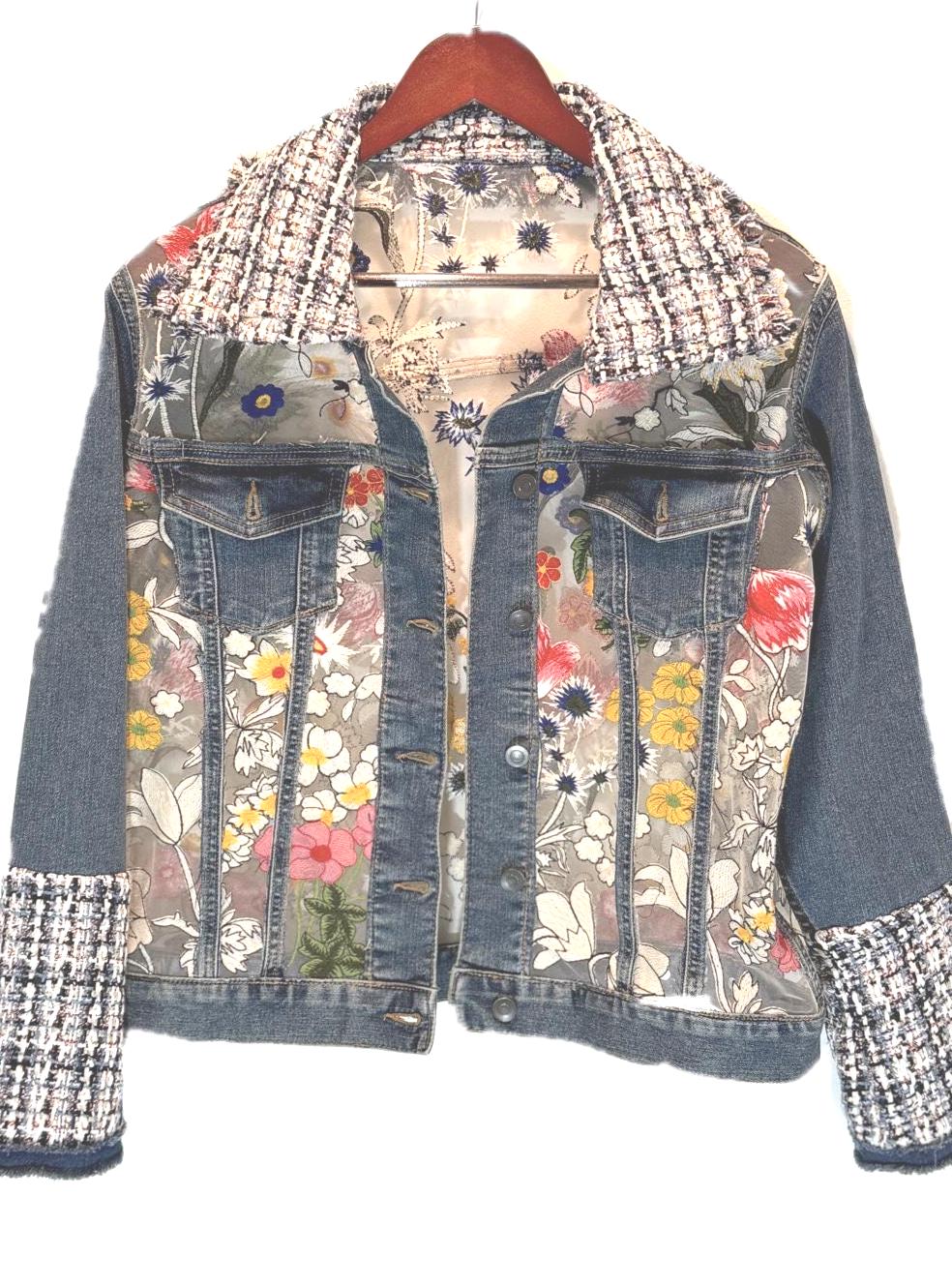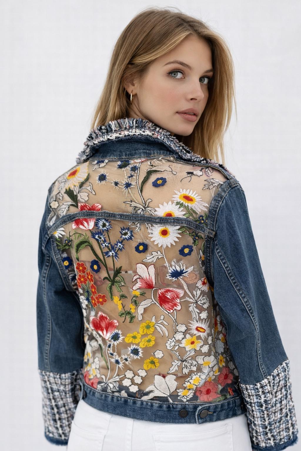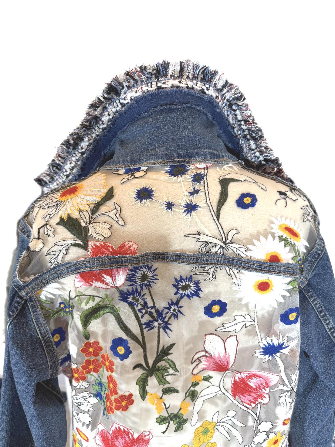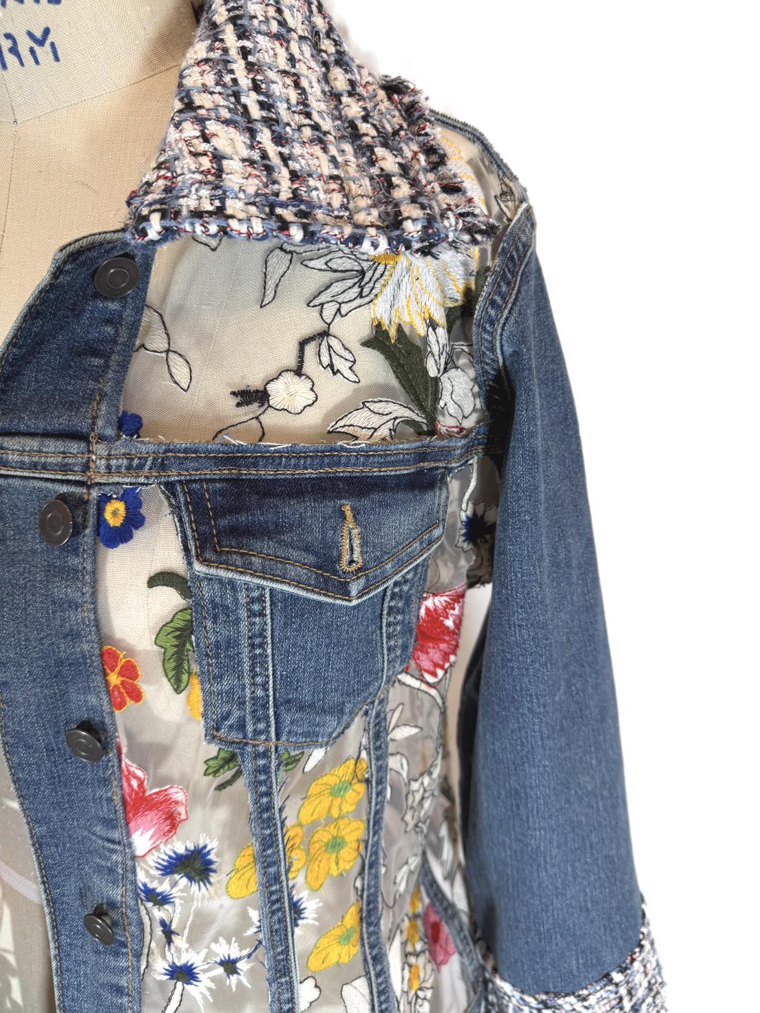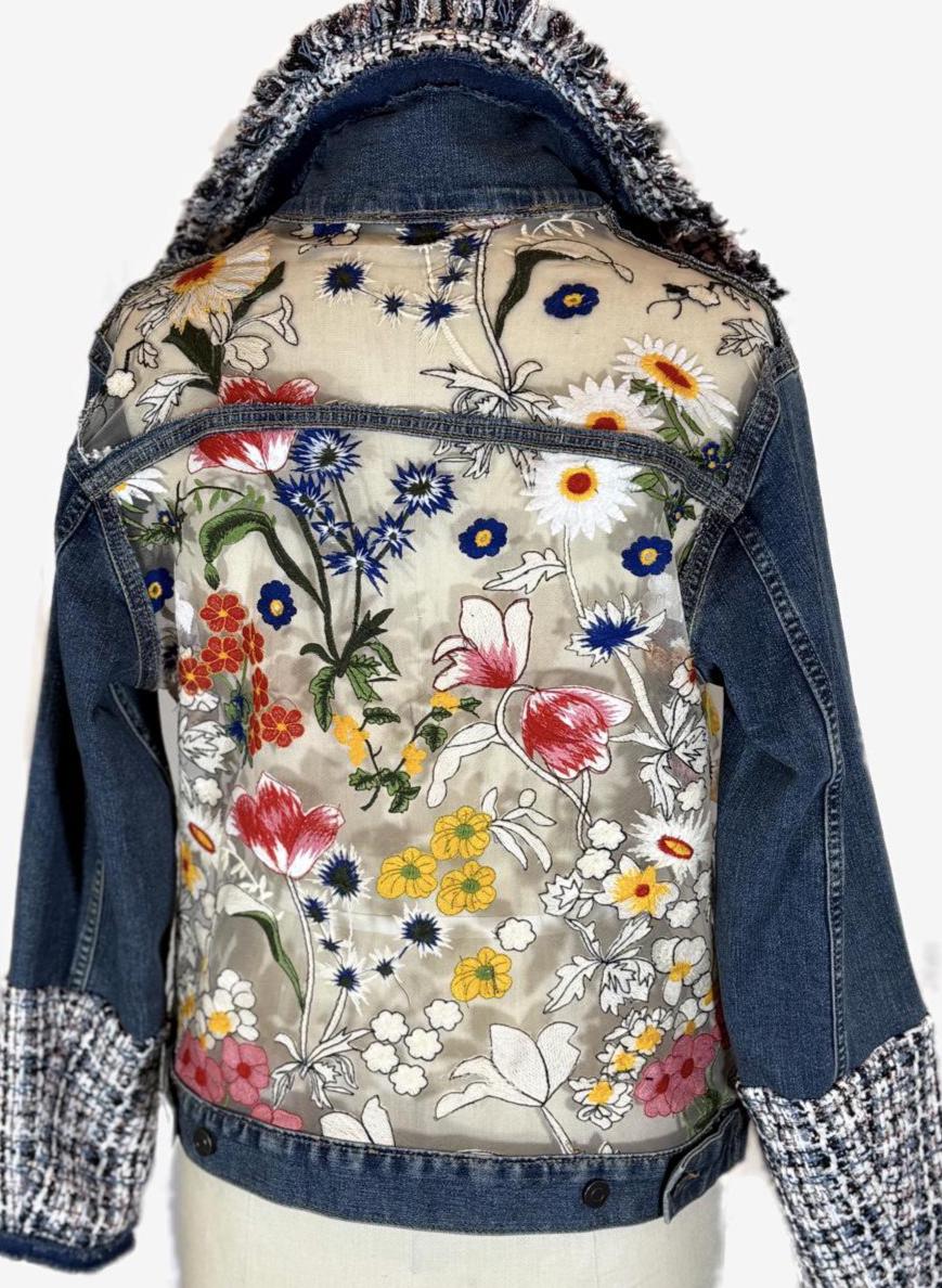 One-of-a-kind upcycled denim jacket featuring a sheer mesh back with vibrant floral embroidery and tweed detailing. The semi-sheer panel subtly reveals skin for a modern, feminine look. A standout statement piece perfect for elevating any outfit.