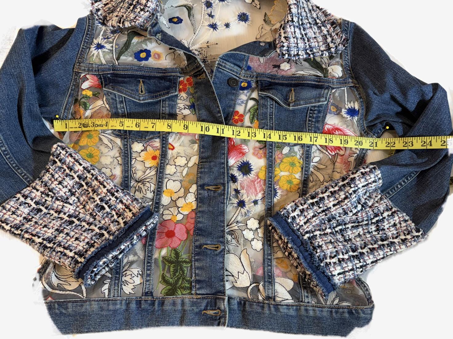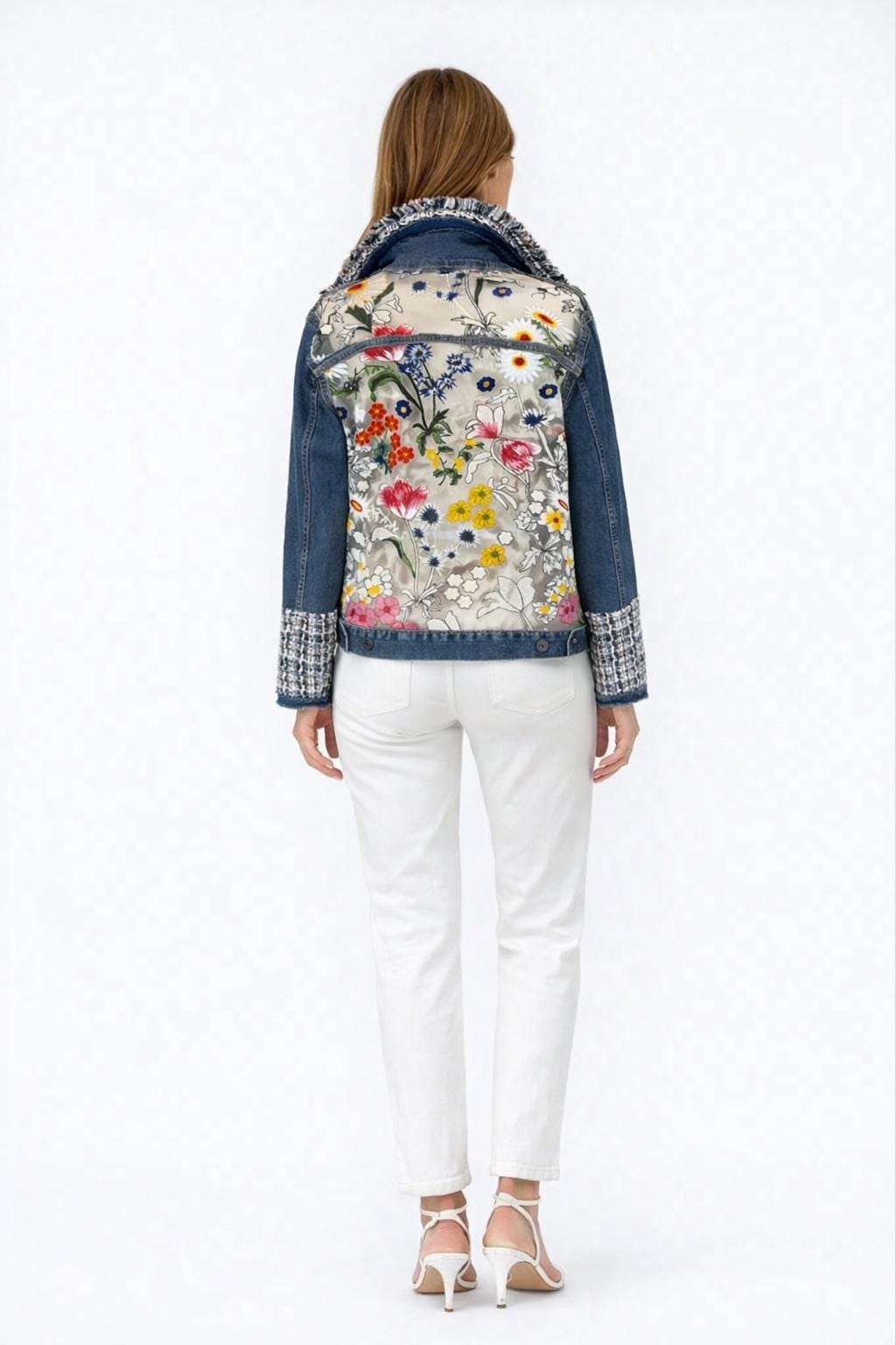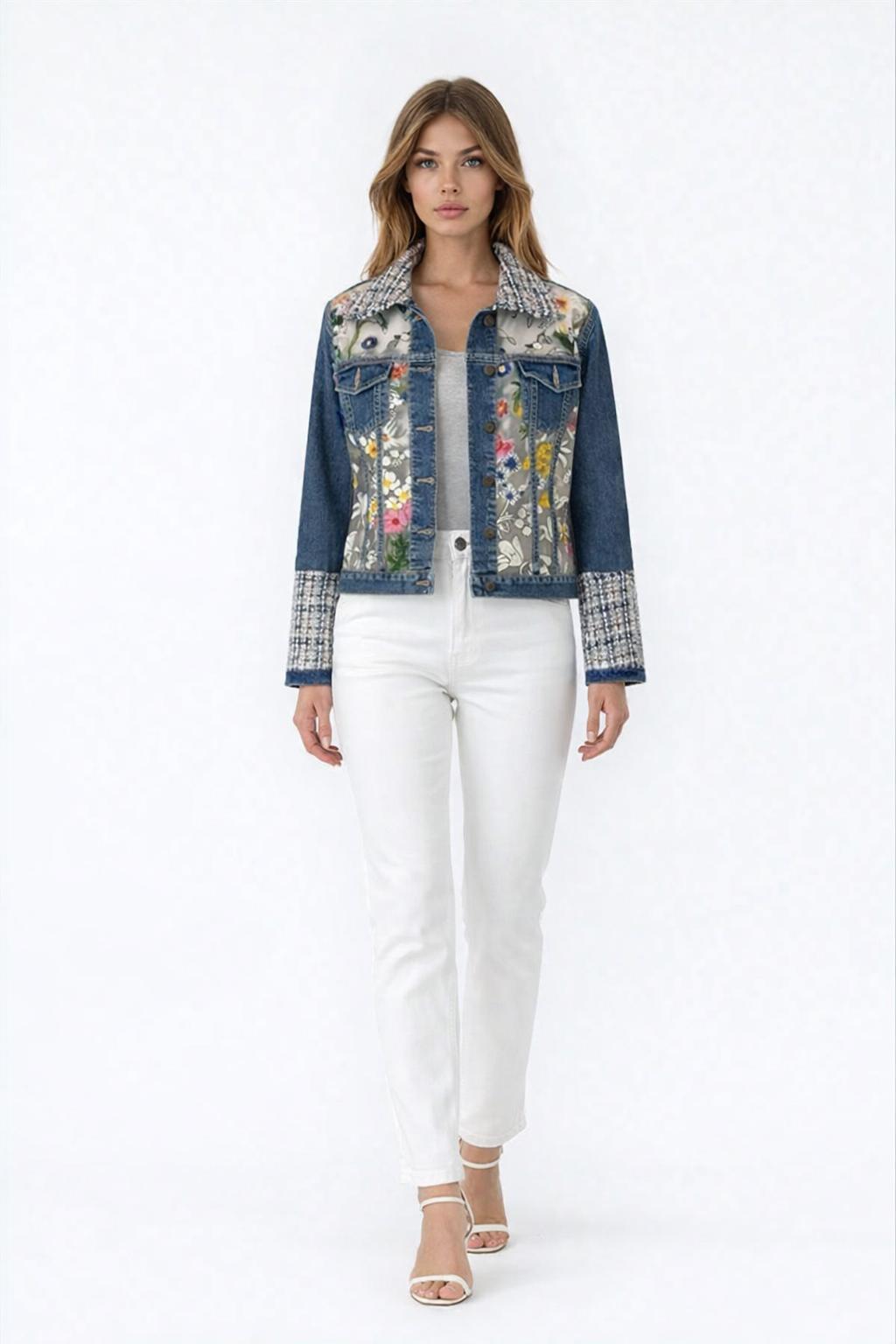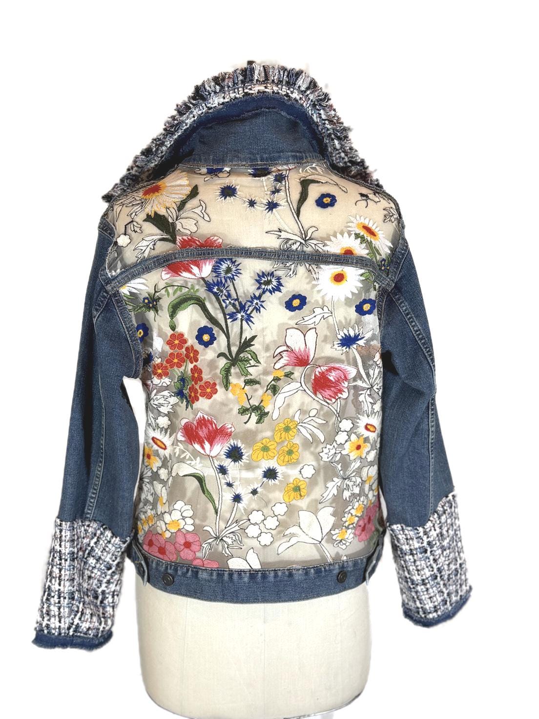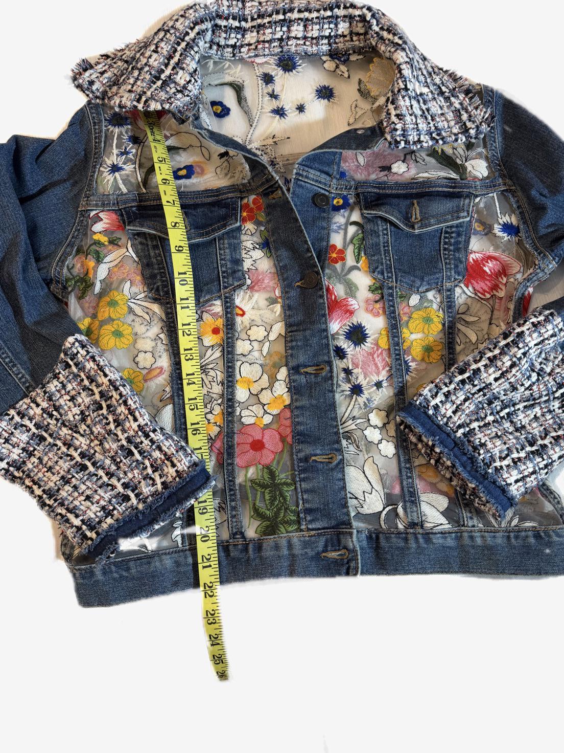One-of-a-kind upcycled denim jacket featuring a sheer mesh back with vibrant floral embroidery and tweed detailing. The semi-sheer panel subtly reveals skin for a modern, feminine look. A standout statement piece perfect for elevating any outfit.