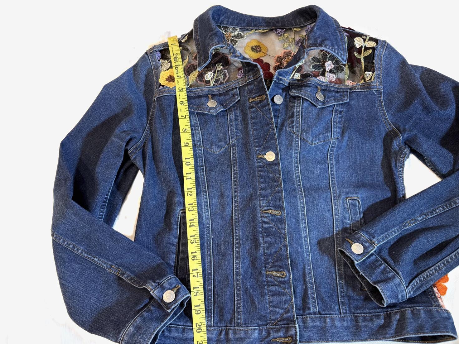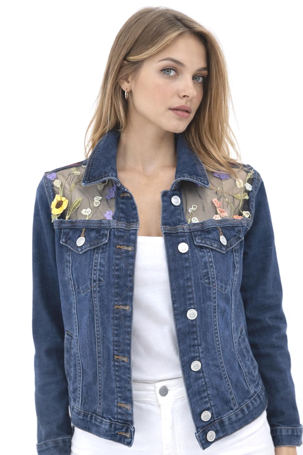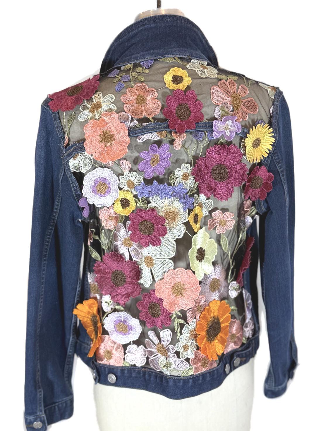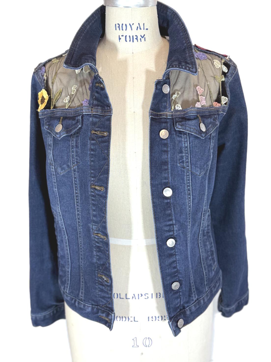 Upcycled Floral Mesh Denim Jacket Sheer Embroidered Back, One of kind Boho jean jacket Statement piece