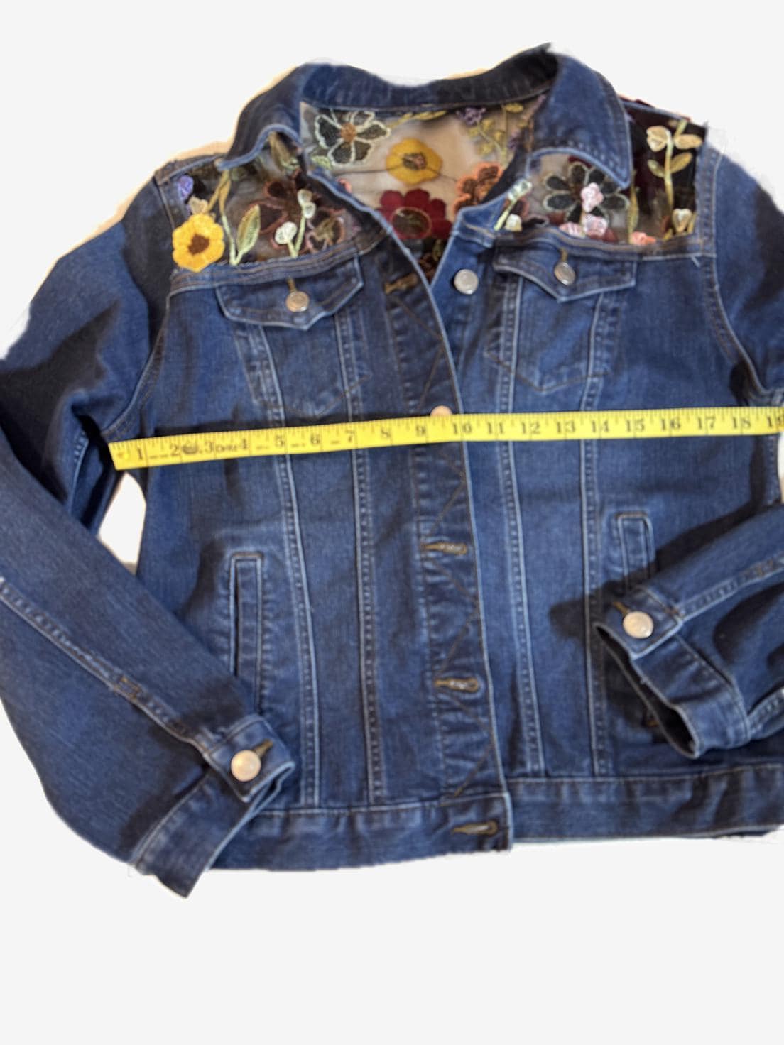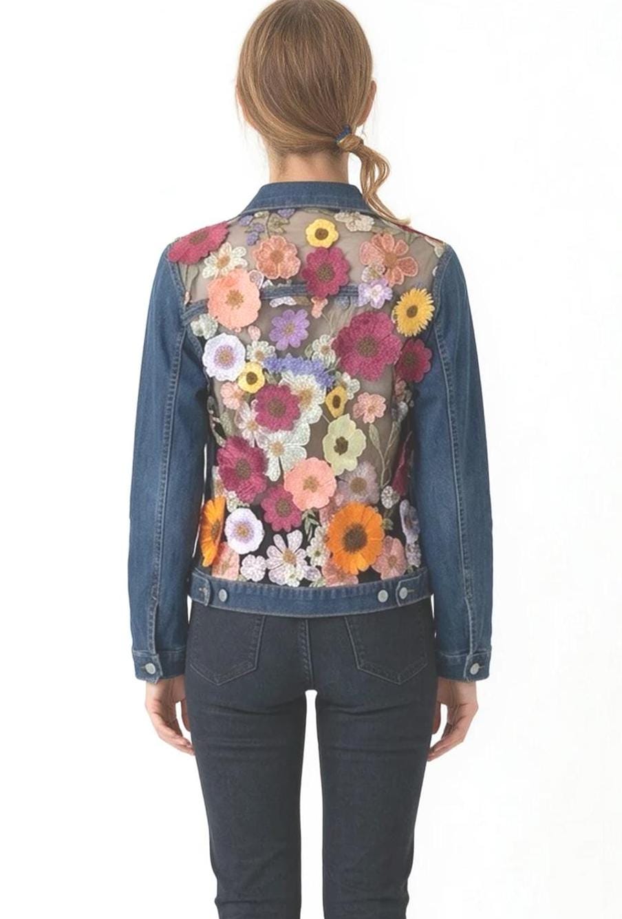 One-of-a-kind upcycled denim jacket featuring a sheer mesh back with vibrant embroidered florals. Lightweight and eye-catching, it’s perfect for layering and making a statement.