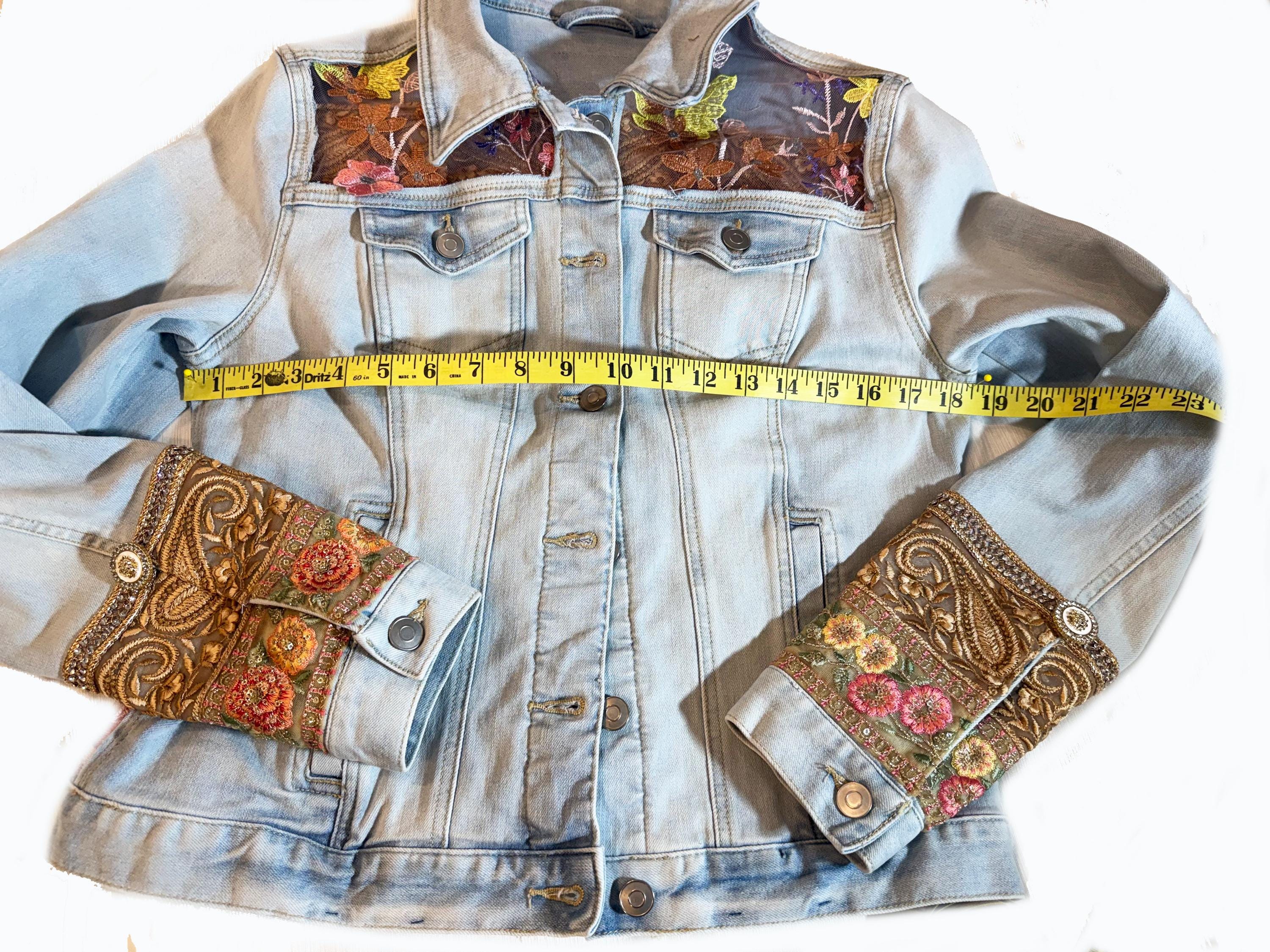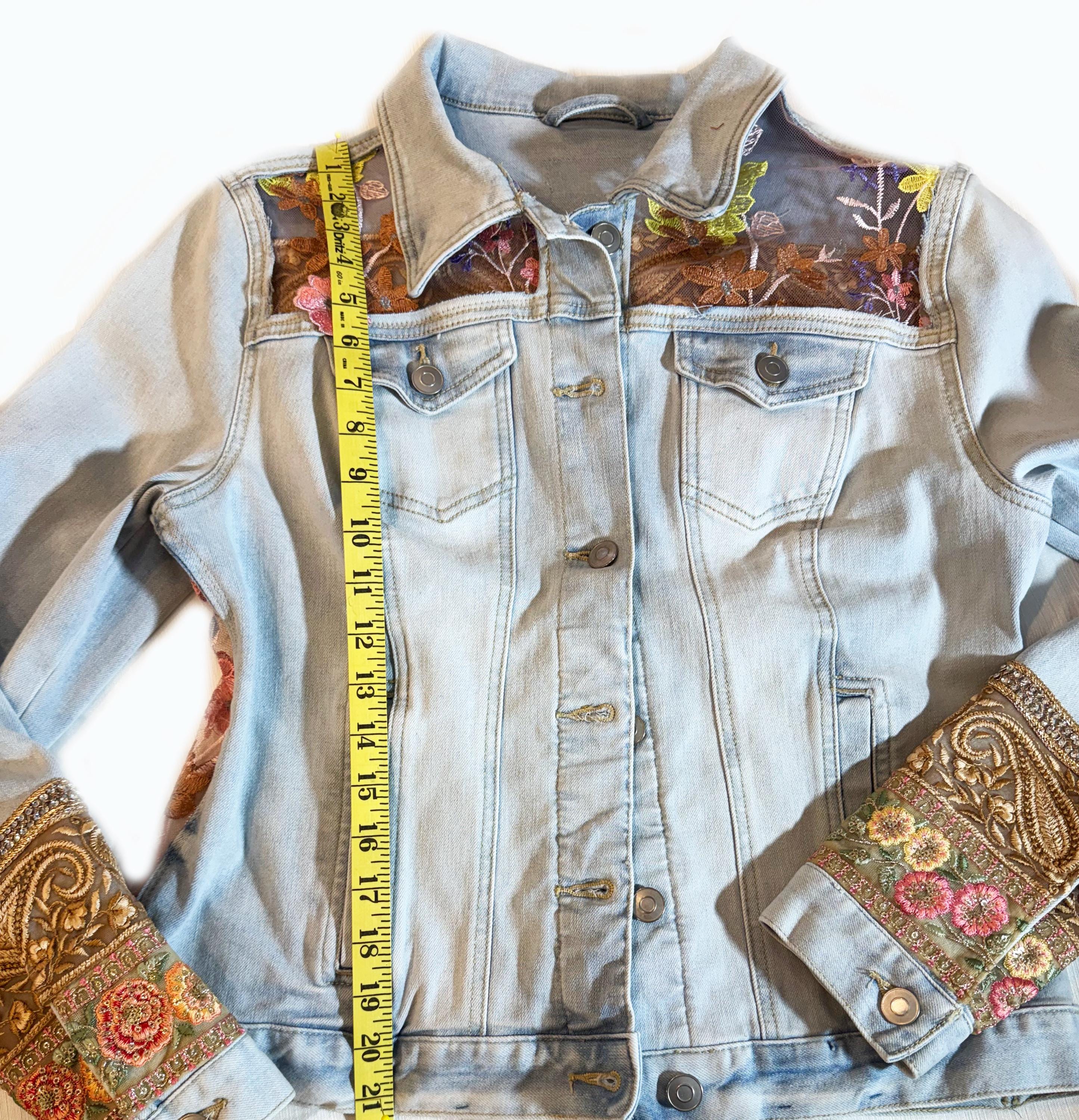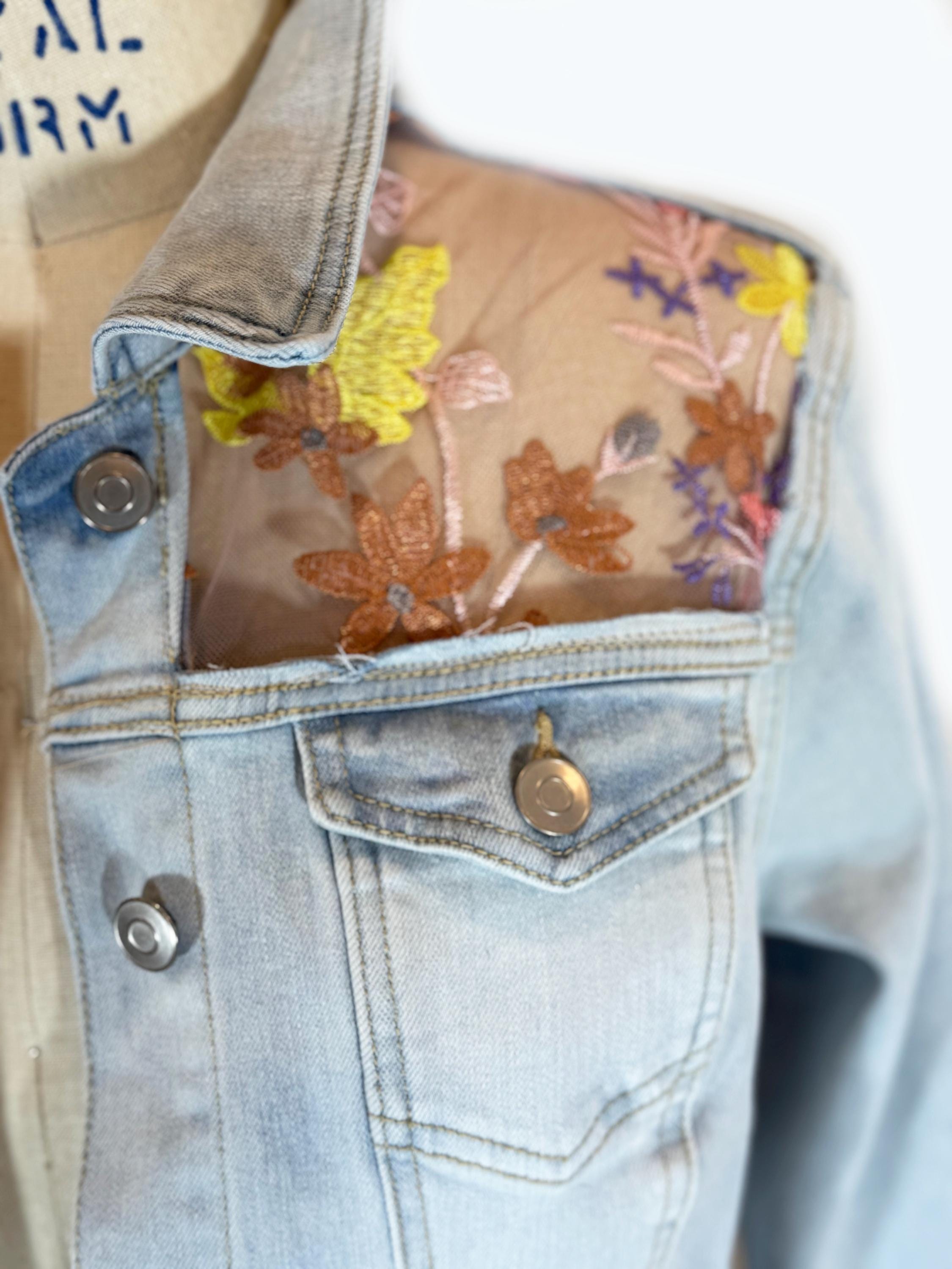 Upcycled Denim Jacket Sheer Floral Embroidered Back, Boho Chic Statement Piece