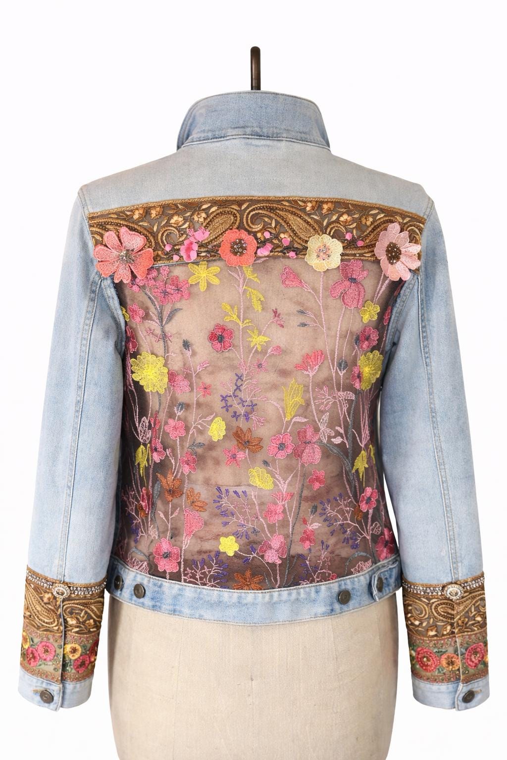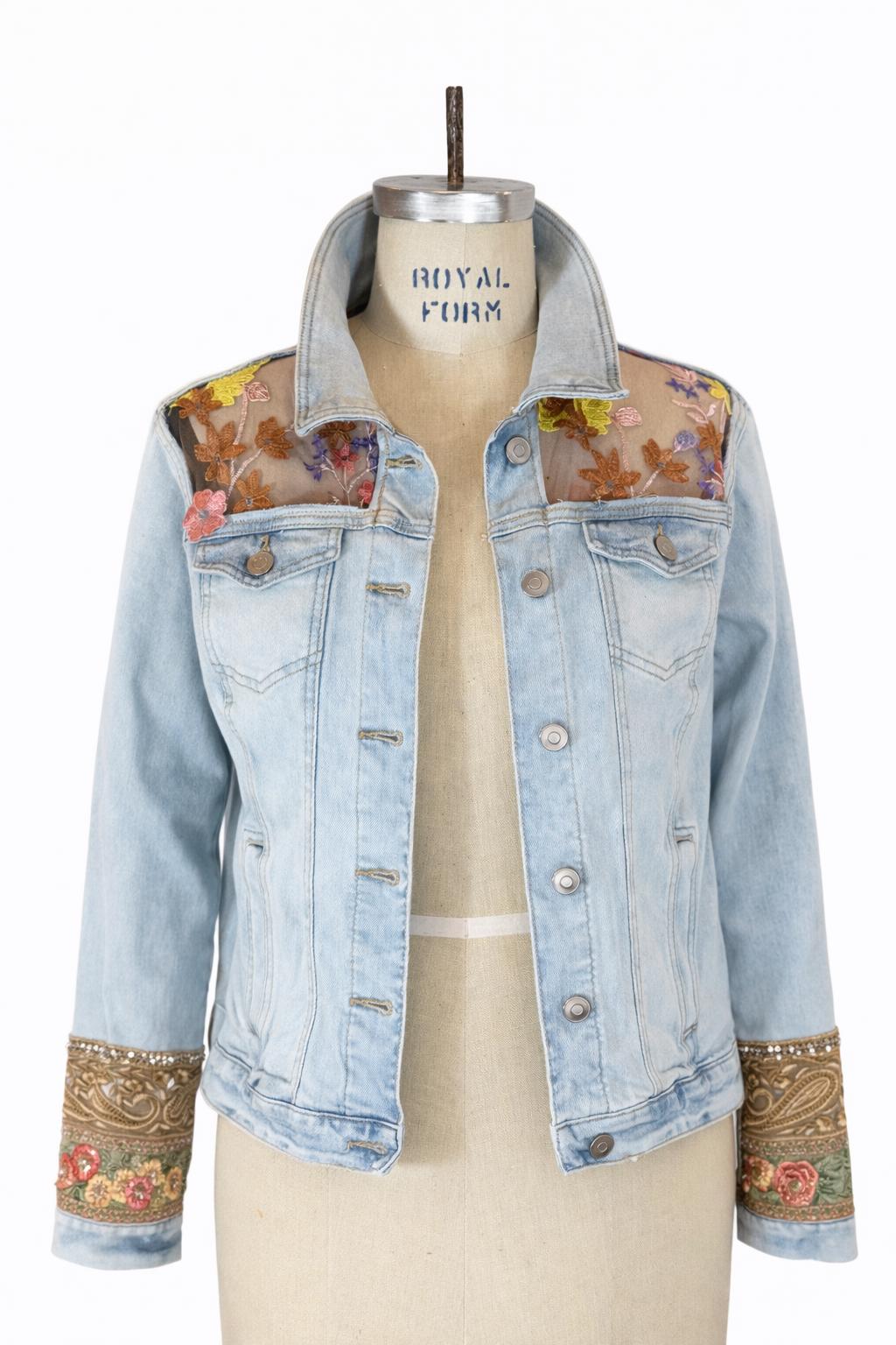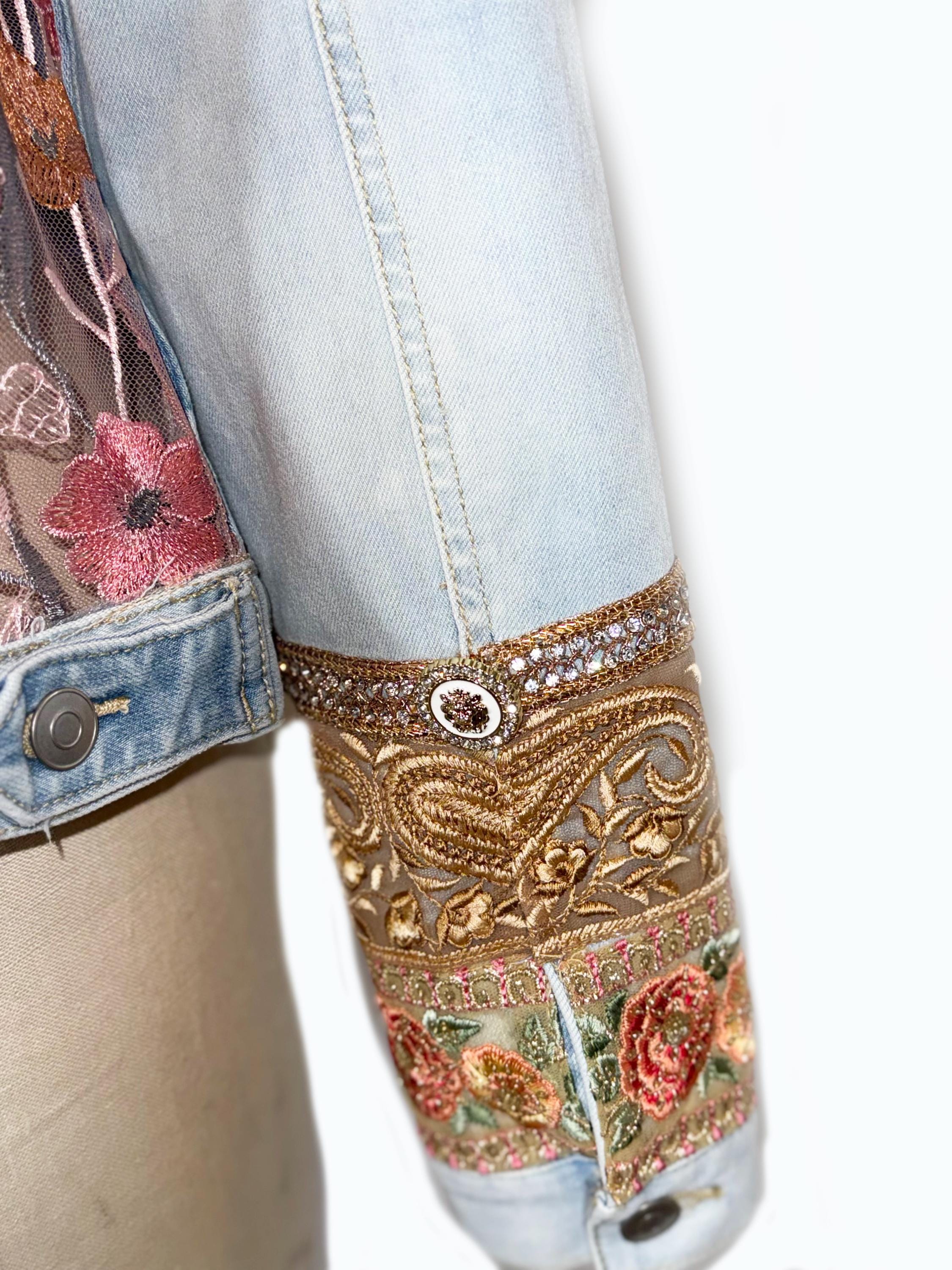 Upcycled Denim Jacket Sheer Floral Embroidered Back, Boho Chic Statement Piece