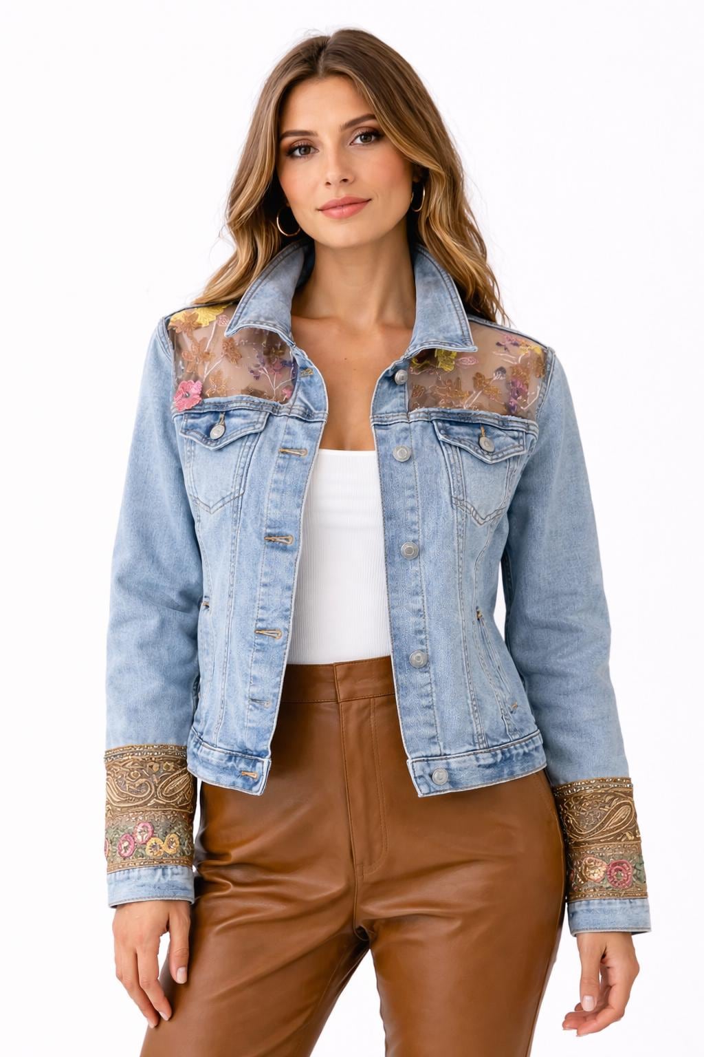 One-of-a-kind light wash denim jacket featuring a sheer mesh back with delicate embroidered florals and intricate trim details. Lightweight and feminine, it’s perfect for layering and adding a soft boho touch to any outfit.