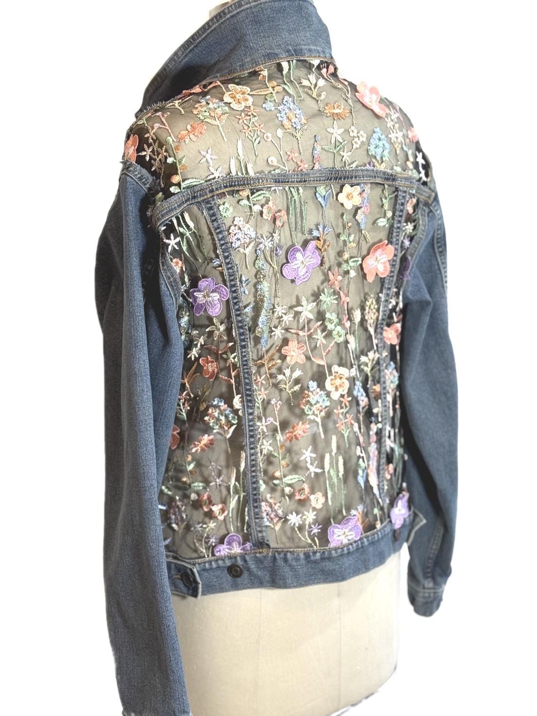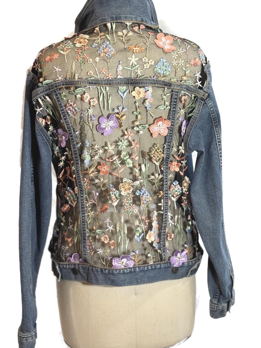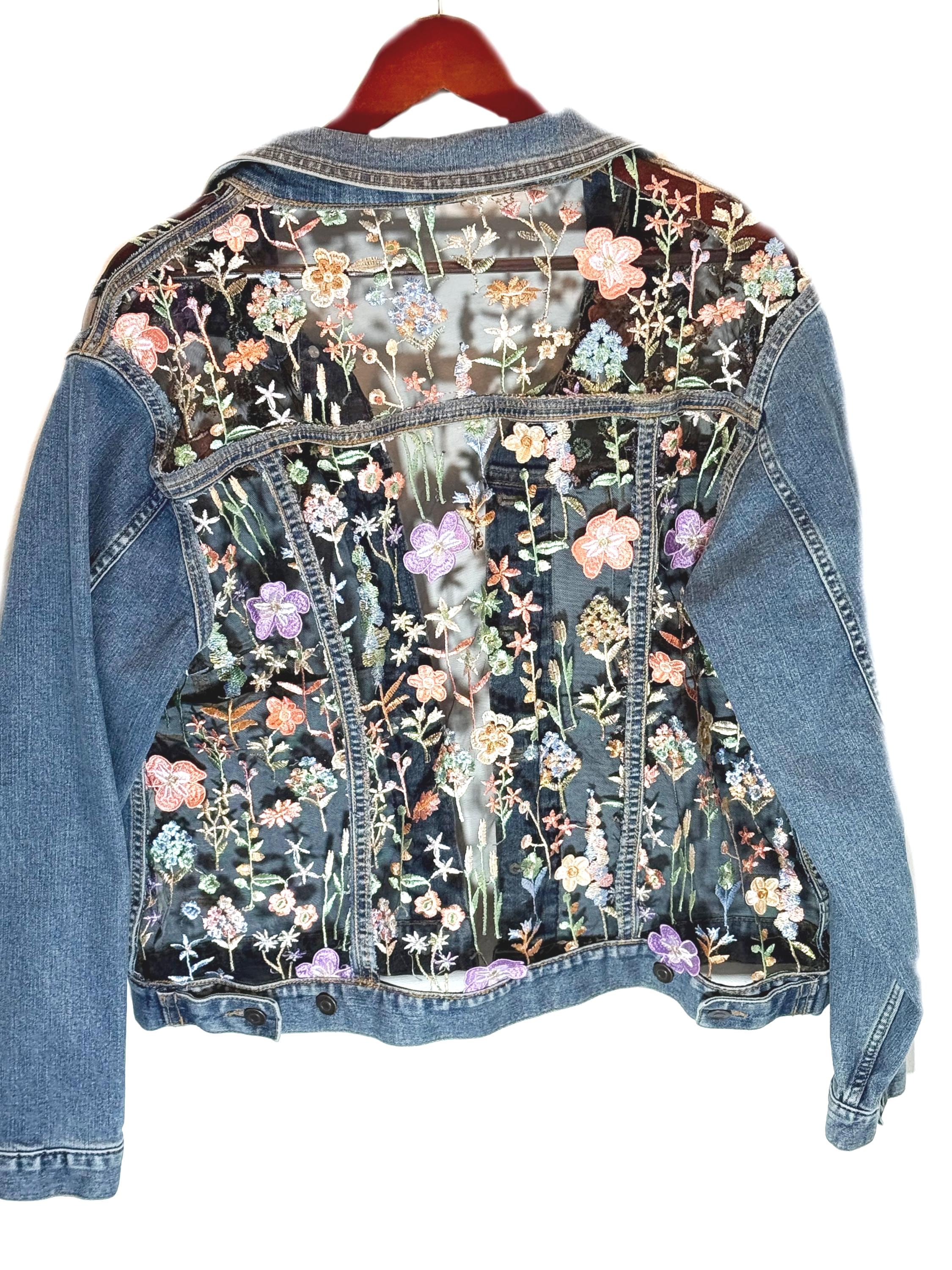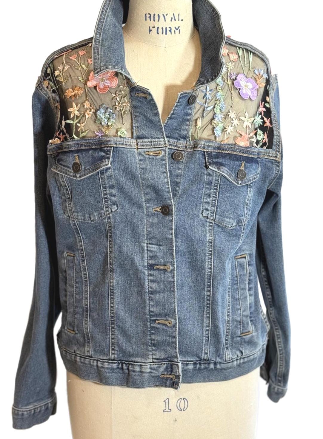 Embroidered Floral Mesh Denim Jack -Sheer Upcycled Jean Jacket,Boho Blue Denim Jacket
